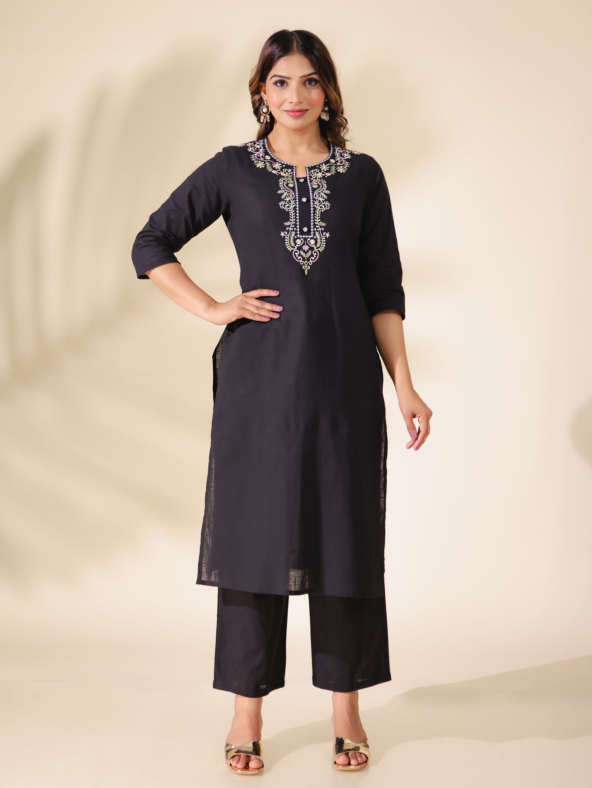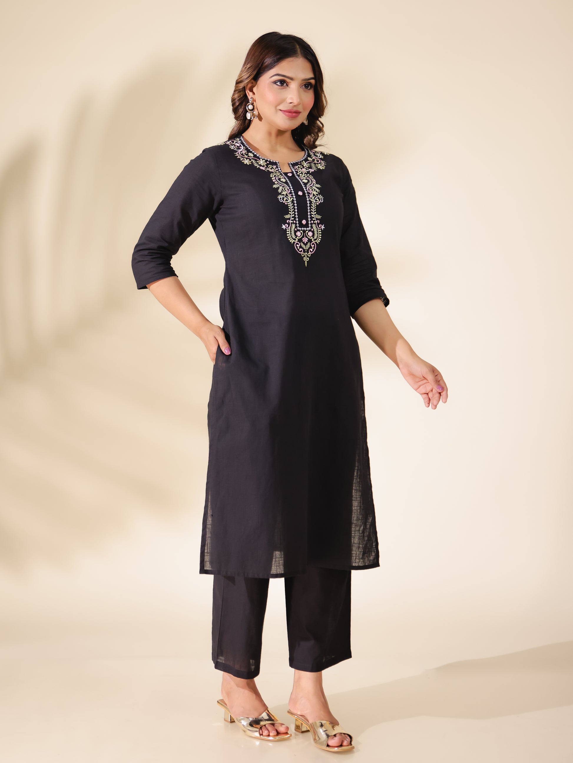 Embroidered Natural Cotton Solid Straight Black Kurta