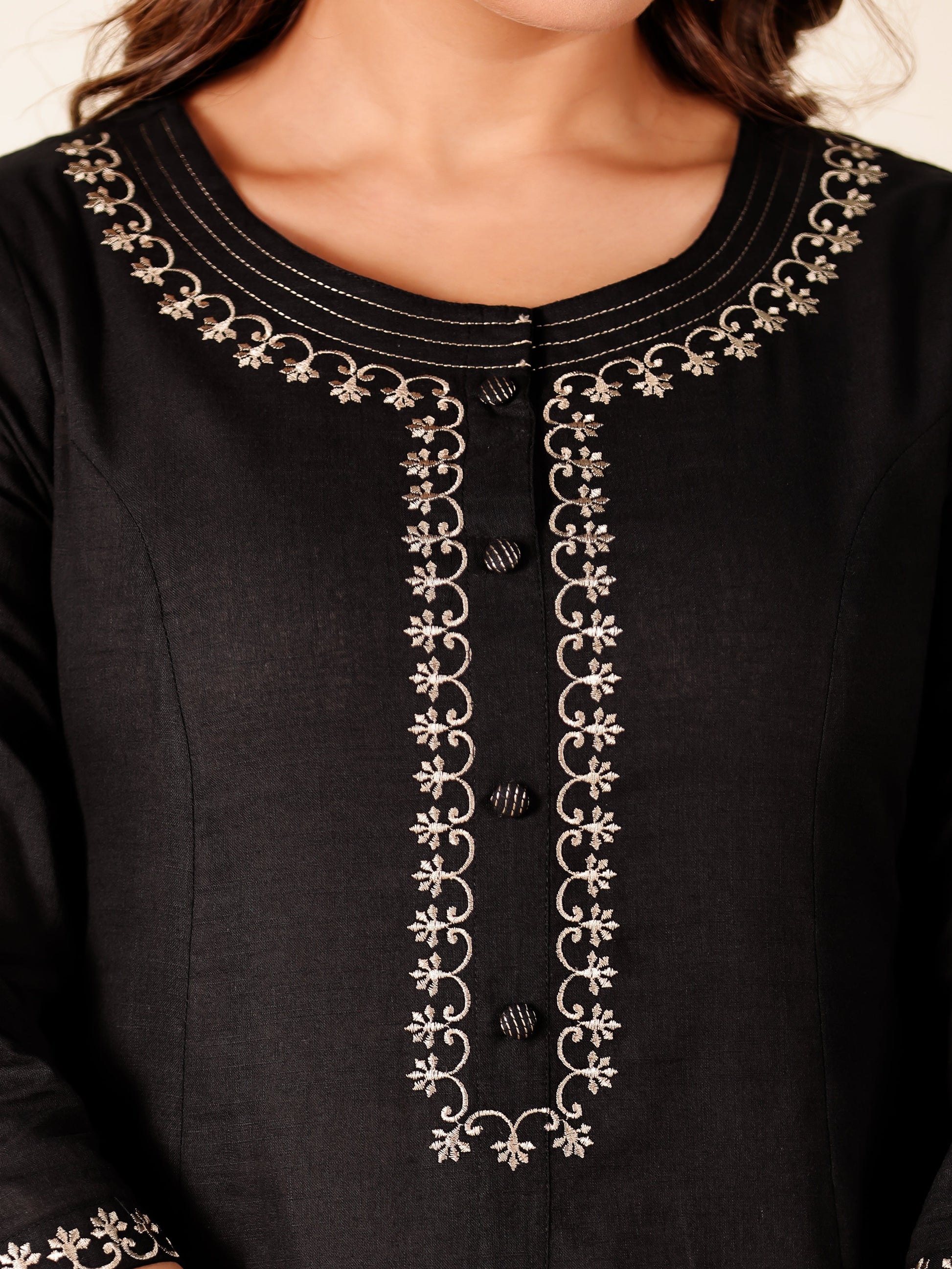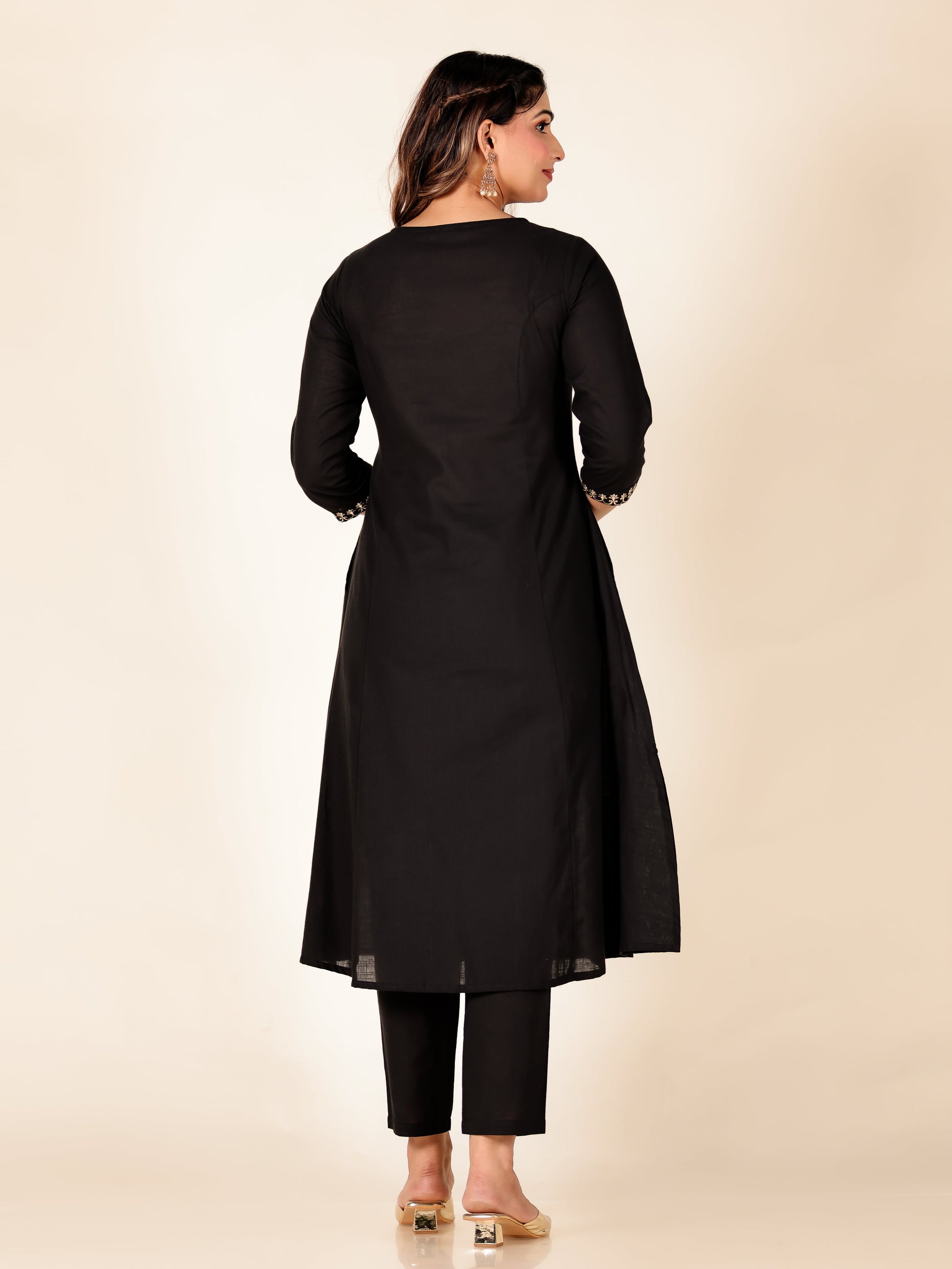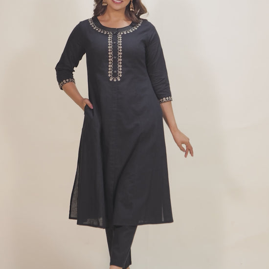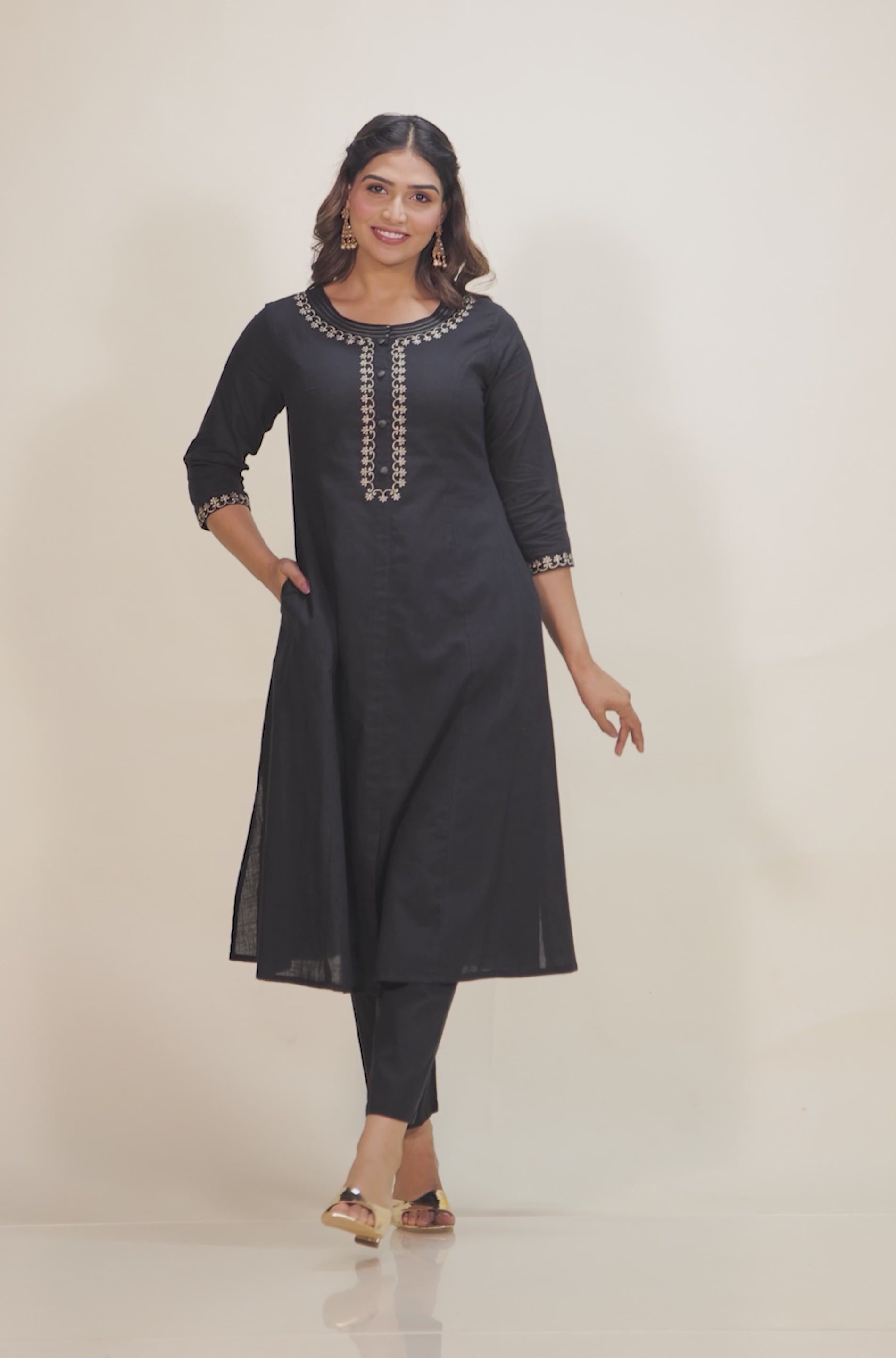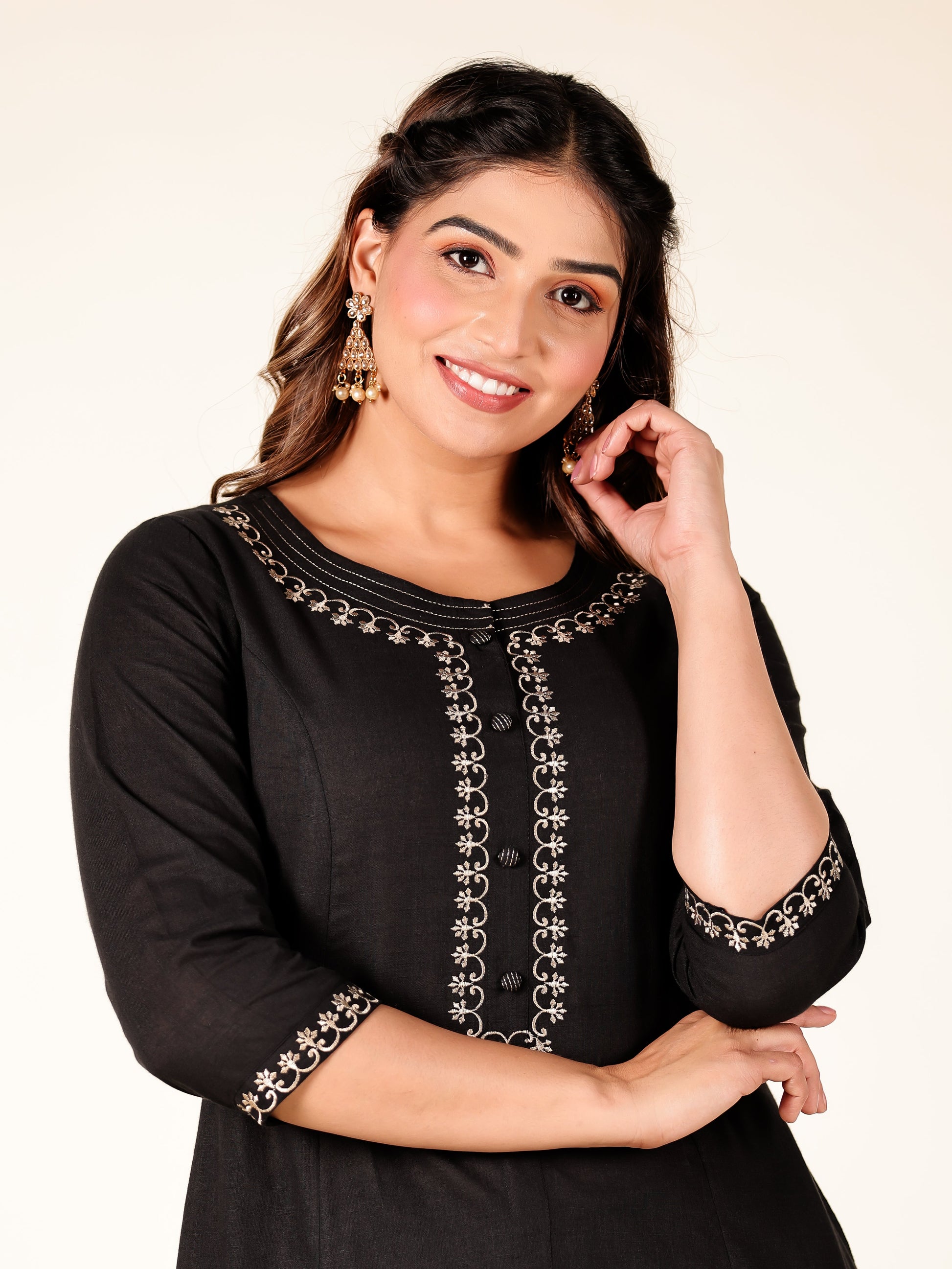 Embroidered Linen Cotton Solid A-line Black Kurta