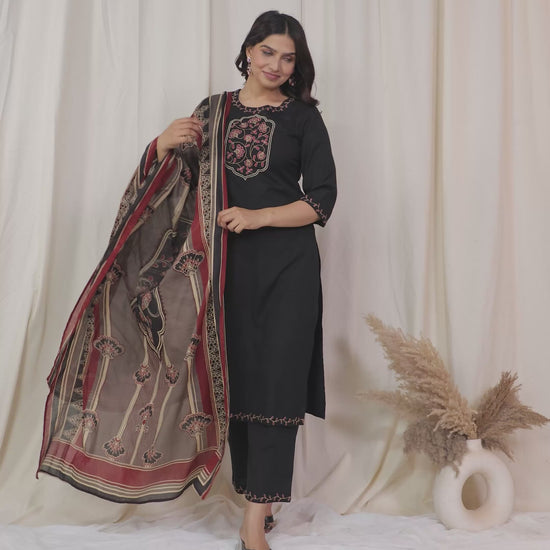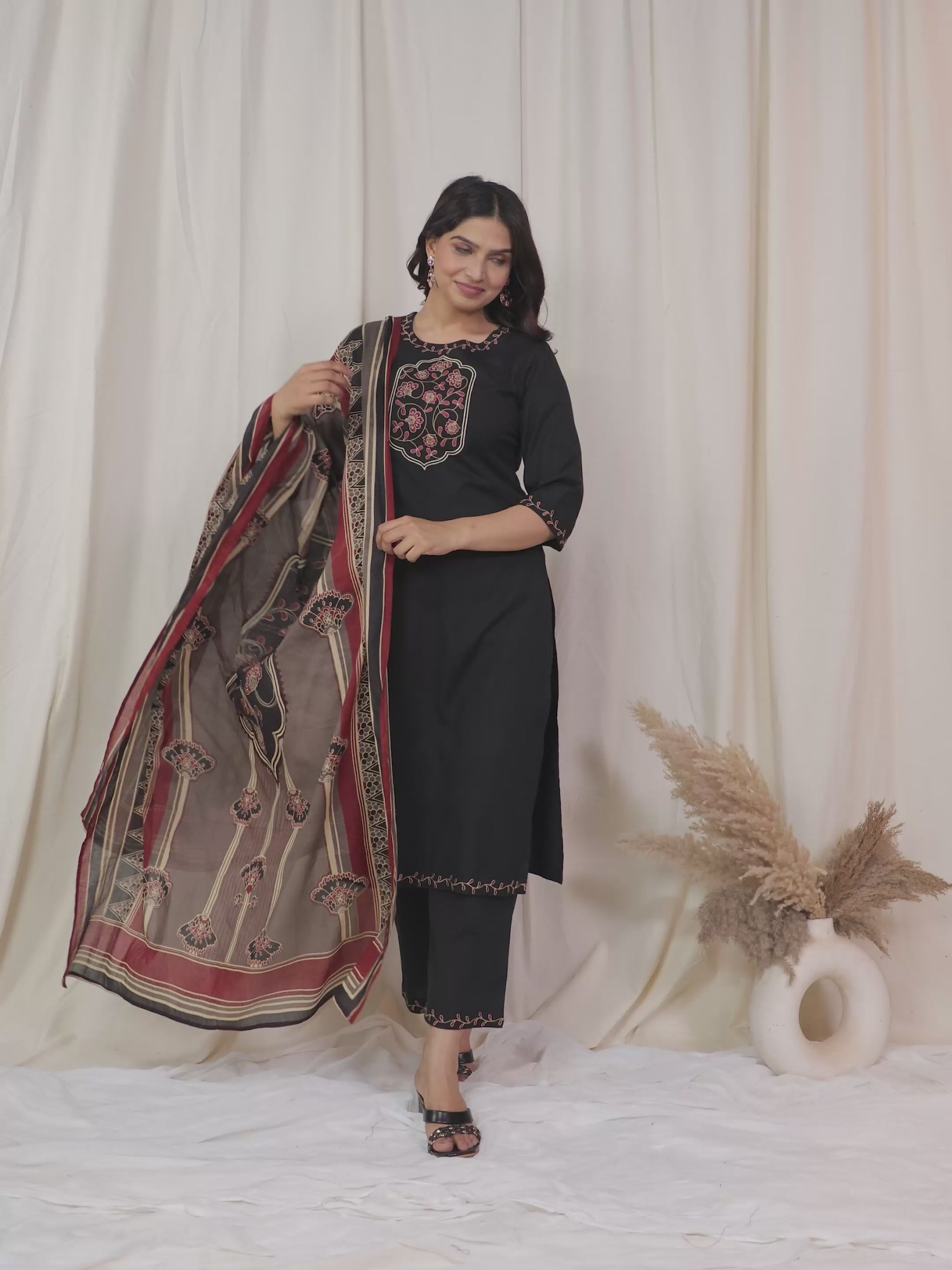 Embroidered Linen Cotton Solid Straight Black Kurta