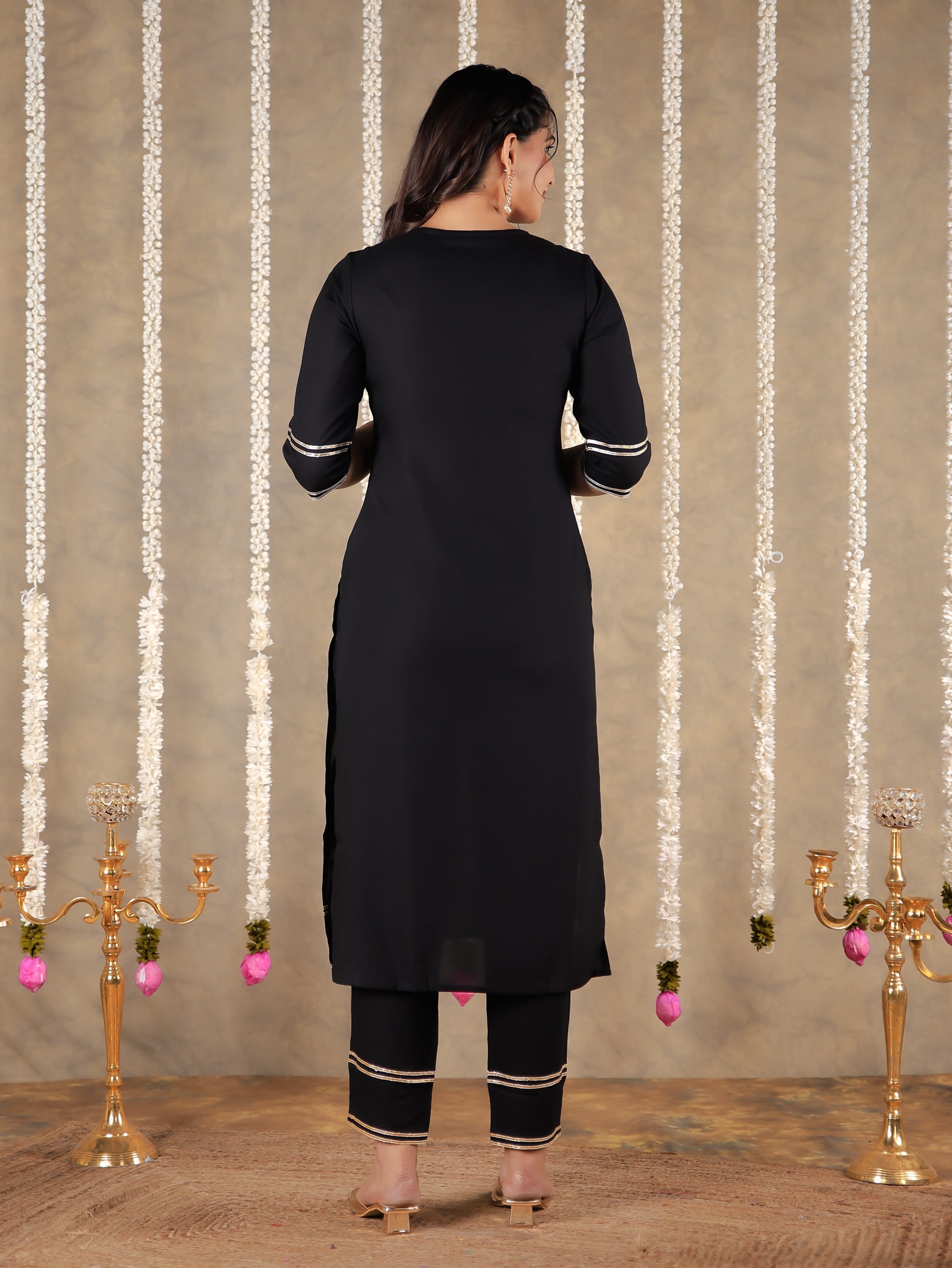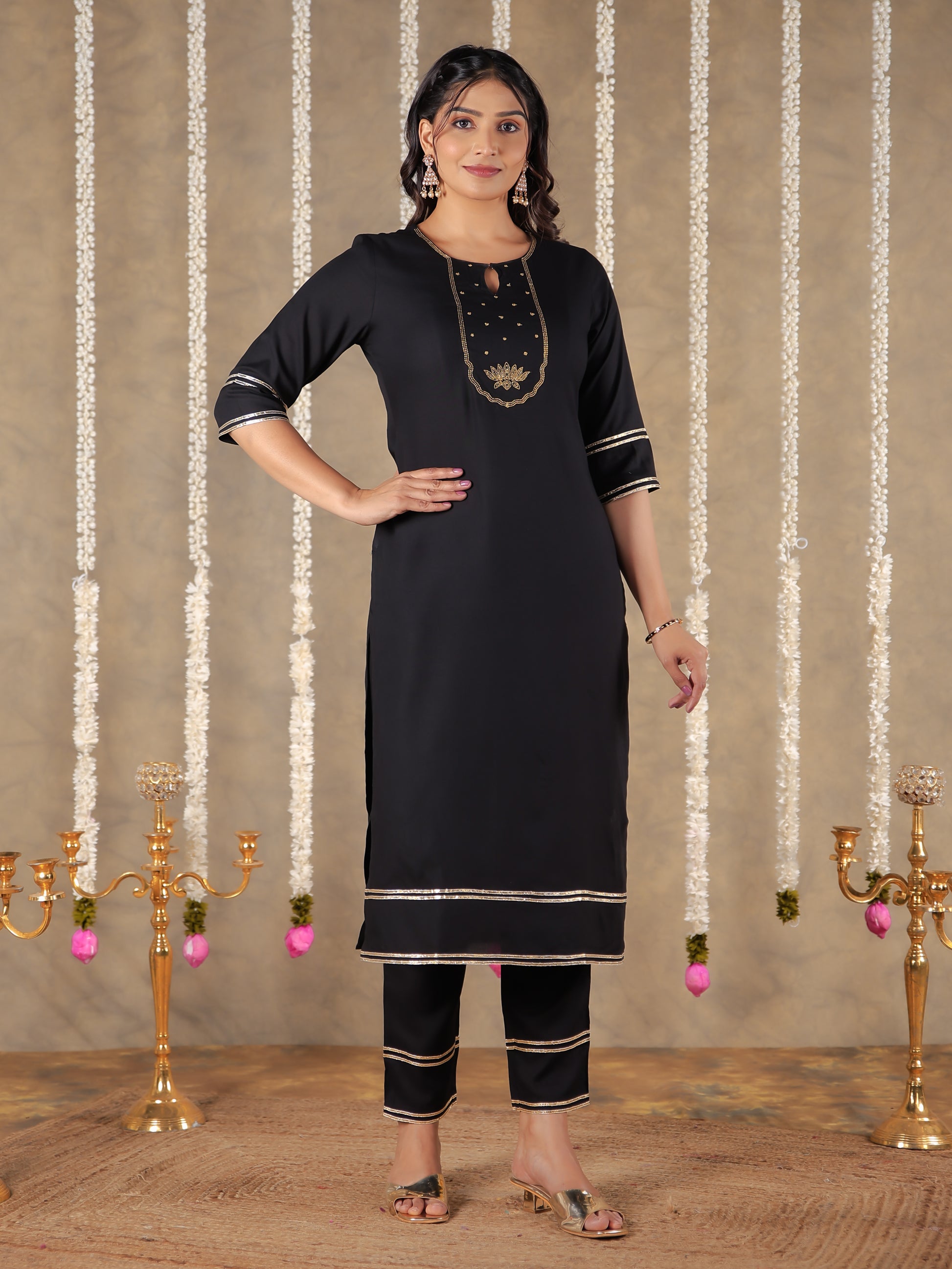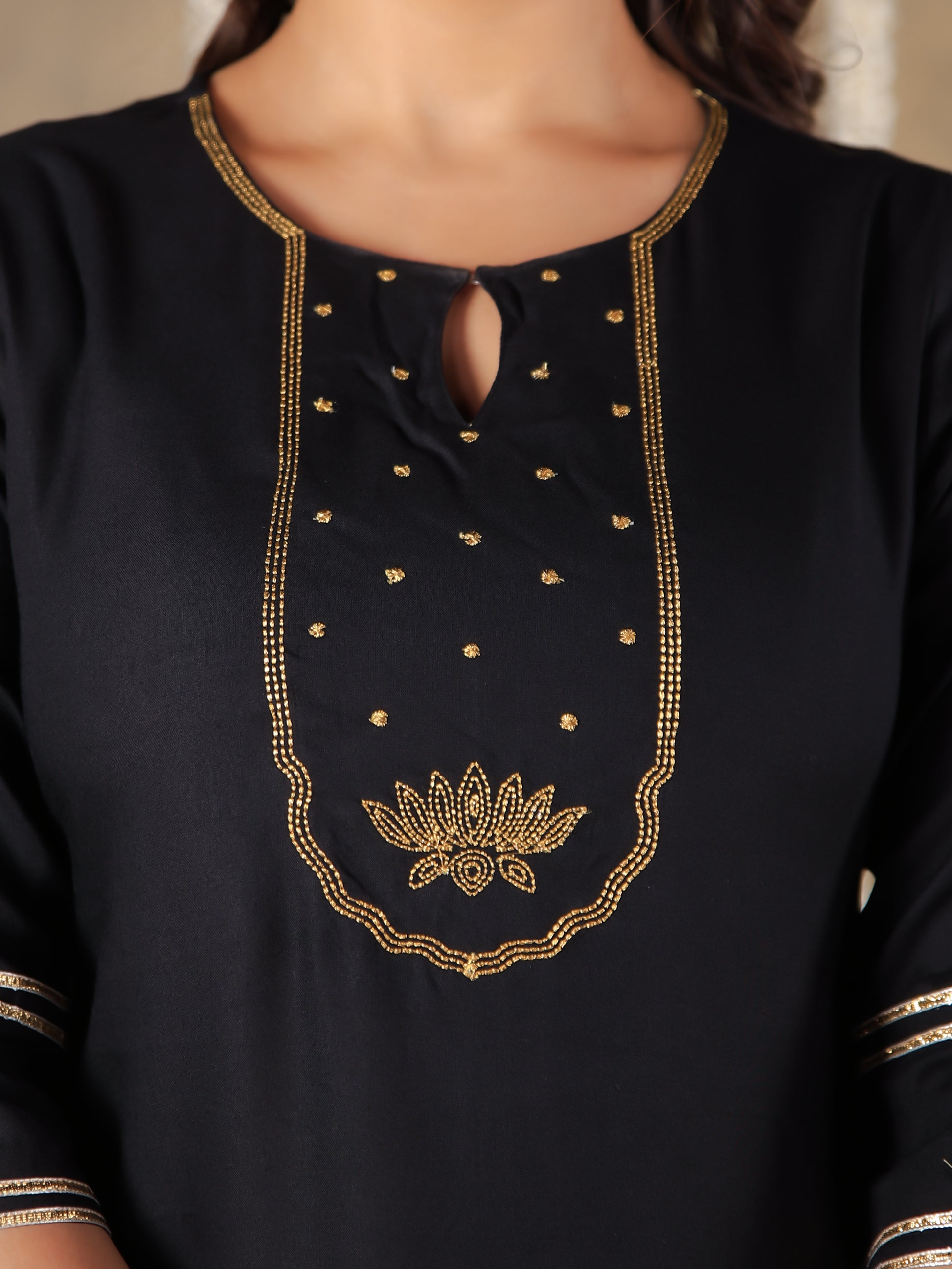 This Black Straight kurta in soft Viscose is a timeless pick for festive and casual wear. Designed with a Keyhole neckline and 3/4 Sleeve sleeves, its graceful Calf Length cut flatters all body types. The delicate Solid detailing adds a touch of sophistication. Pair it with statement earrings and juttis for a polished look. Maintain its pristine look by following proper care instructions.