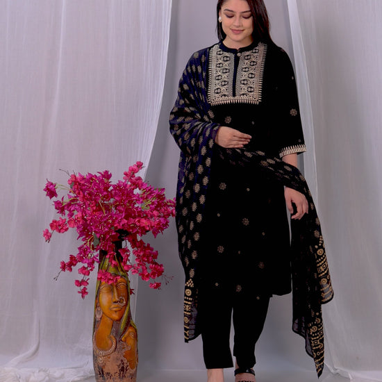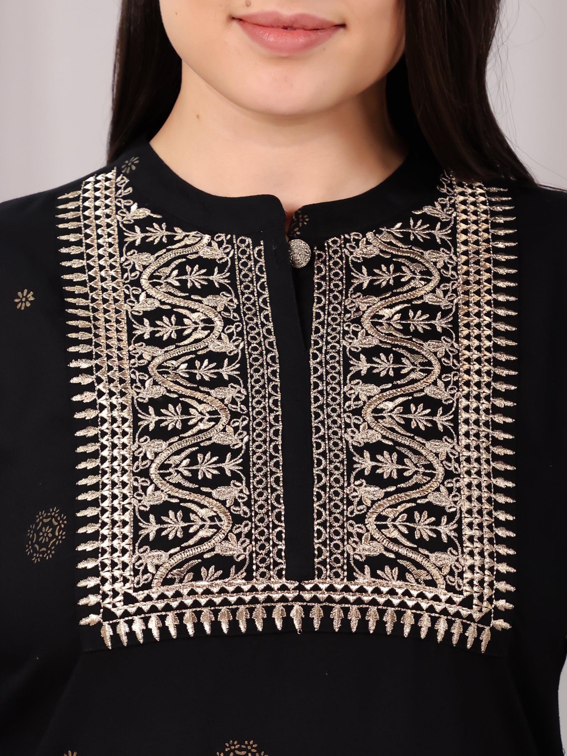 Crafted from breathable Viscose, this Straight kurta in Black blends traditional design with everyday comfort. The Rogan finish adds artisanal charm, while the Calf Length silhouette ensures effortless elegance. Style with palazzos or leggings for versatile looks, from workdays to weekend outings. Designed for easy care, this kurta stays beautiful with simple care instructions.