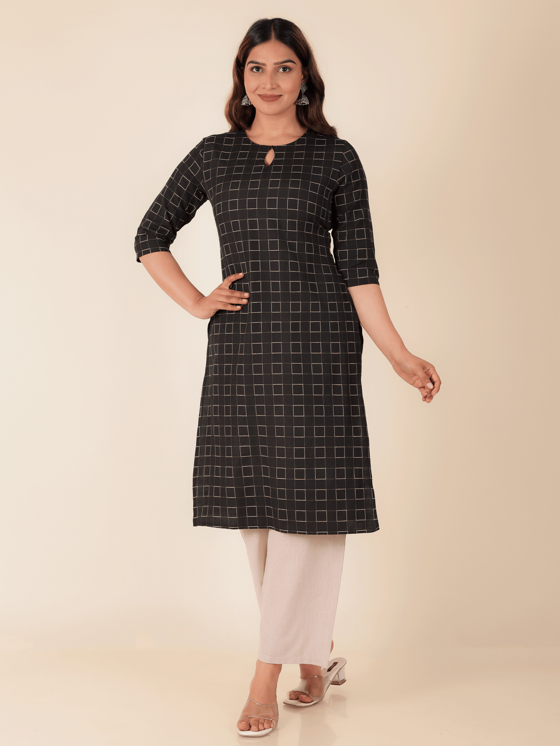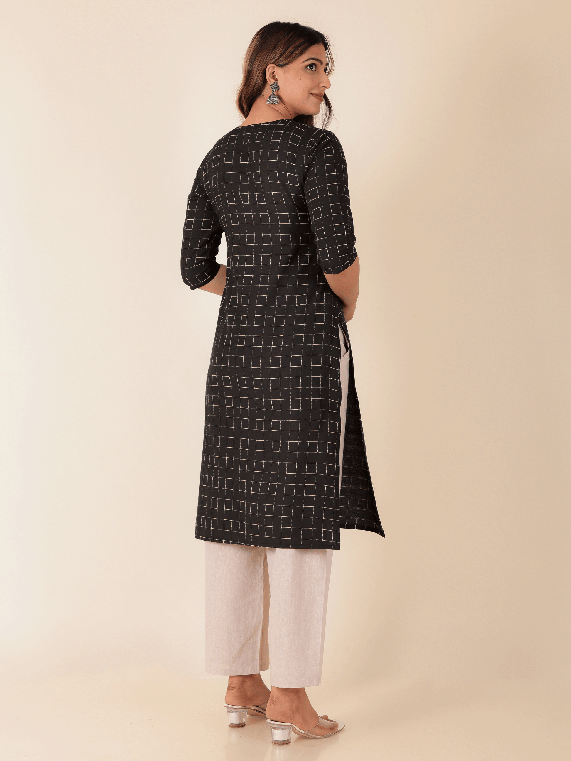 This Black Straight kurta in soft Blend Cotton is a timeless pick for festive and casual wear. Designed with a Keyhole neckline and 3/4 Sleeve sleeves, its graceful Calf Length cut flatters all body types. The delicate Woven Design detailing adds a touch of sophistication. Pair it with statement earrings and juttis for a polished look. Maintain its pristine look by following proper care instructions.