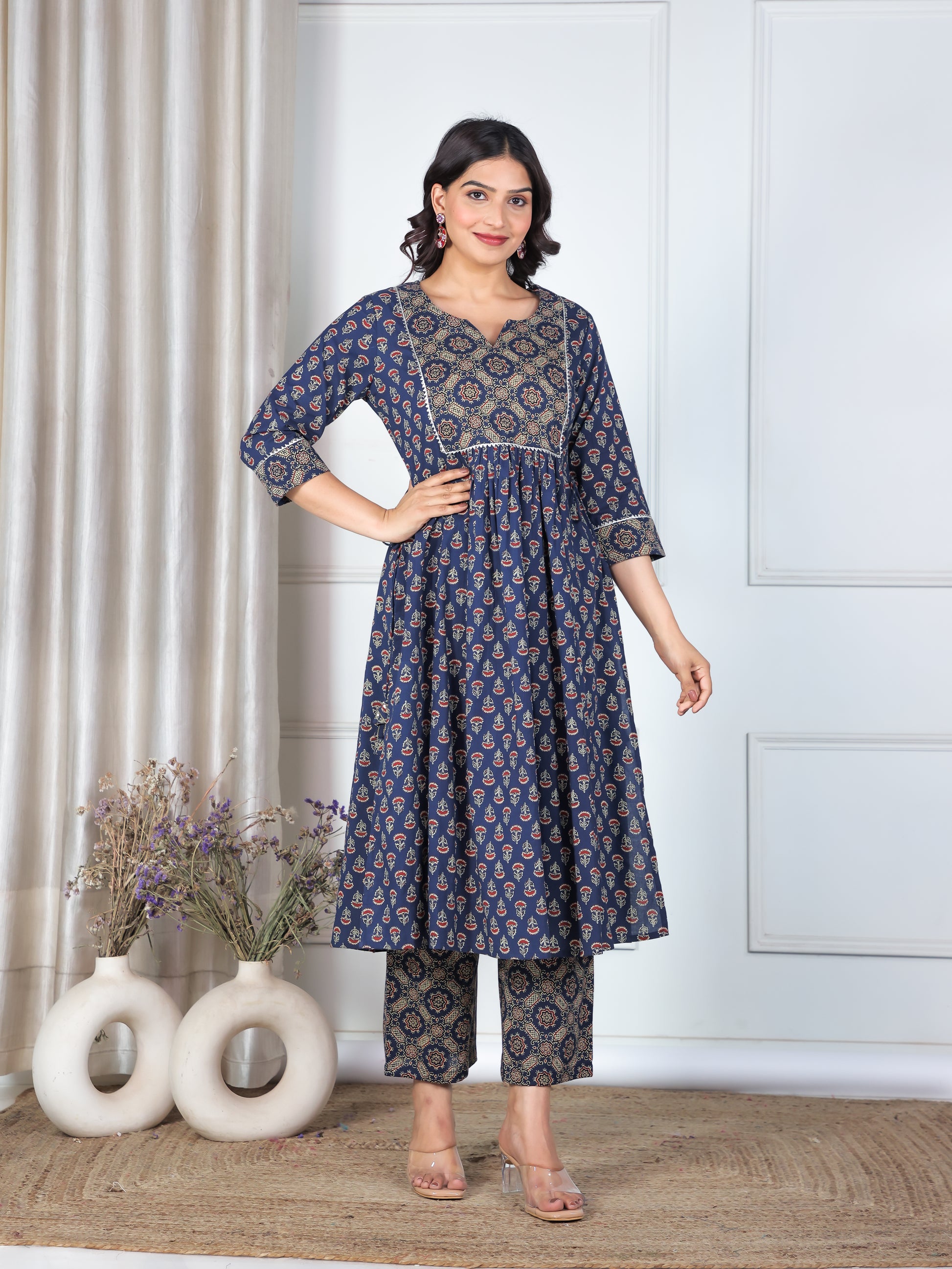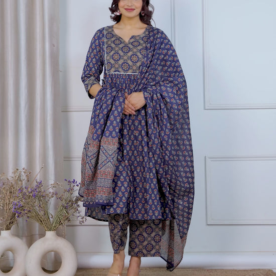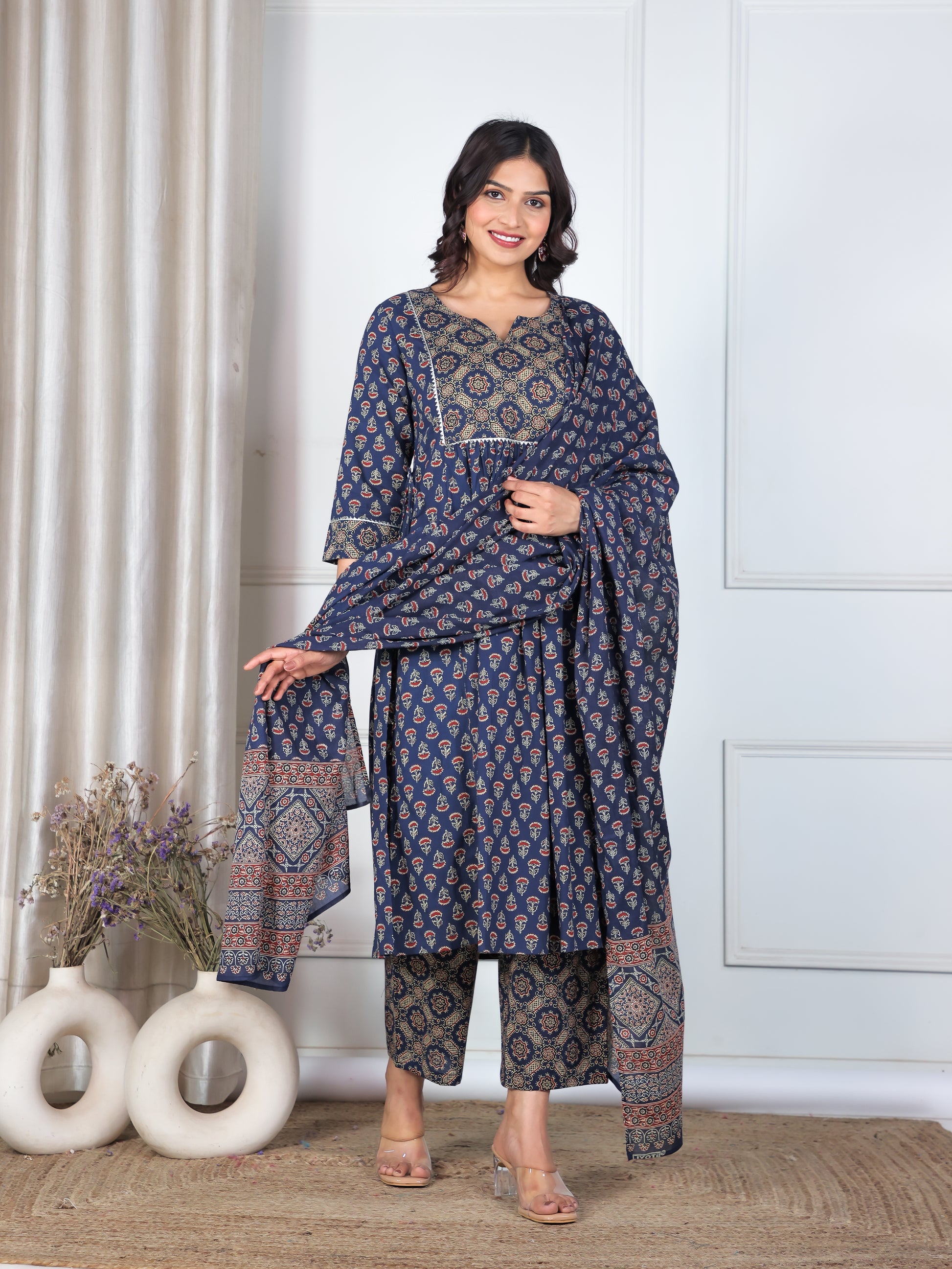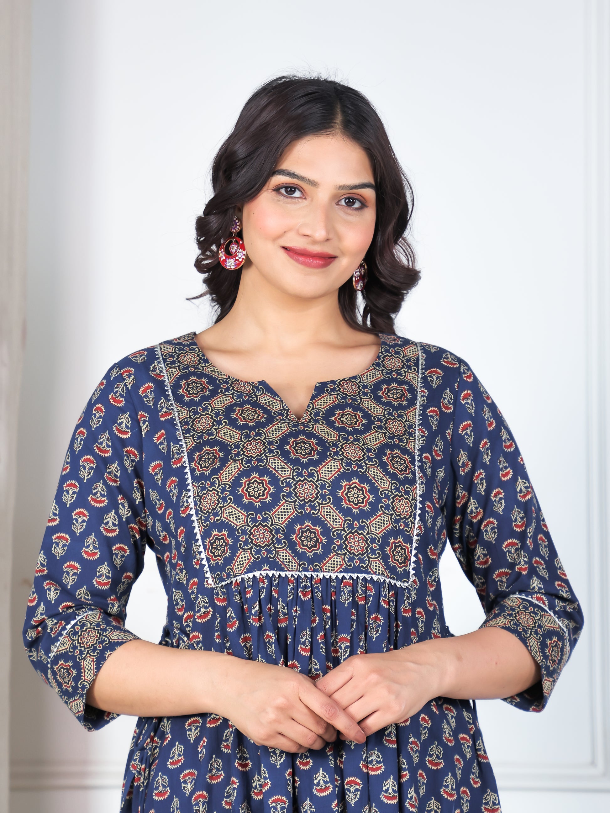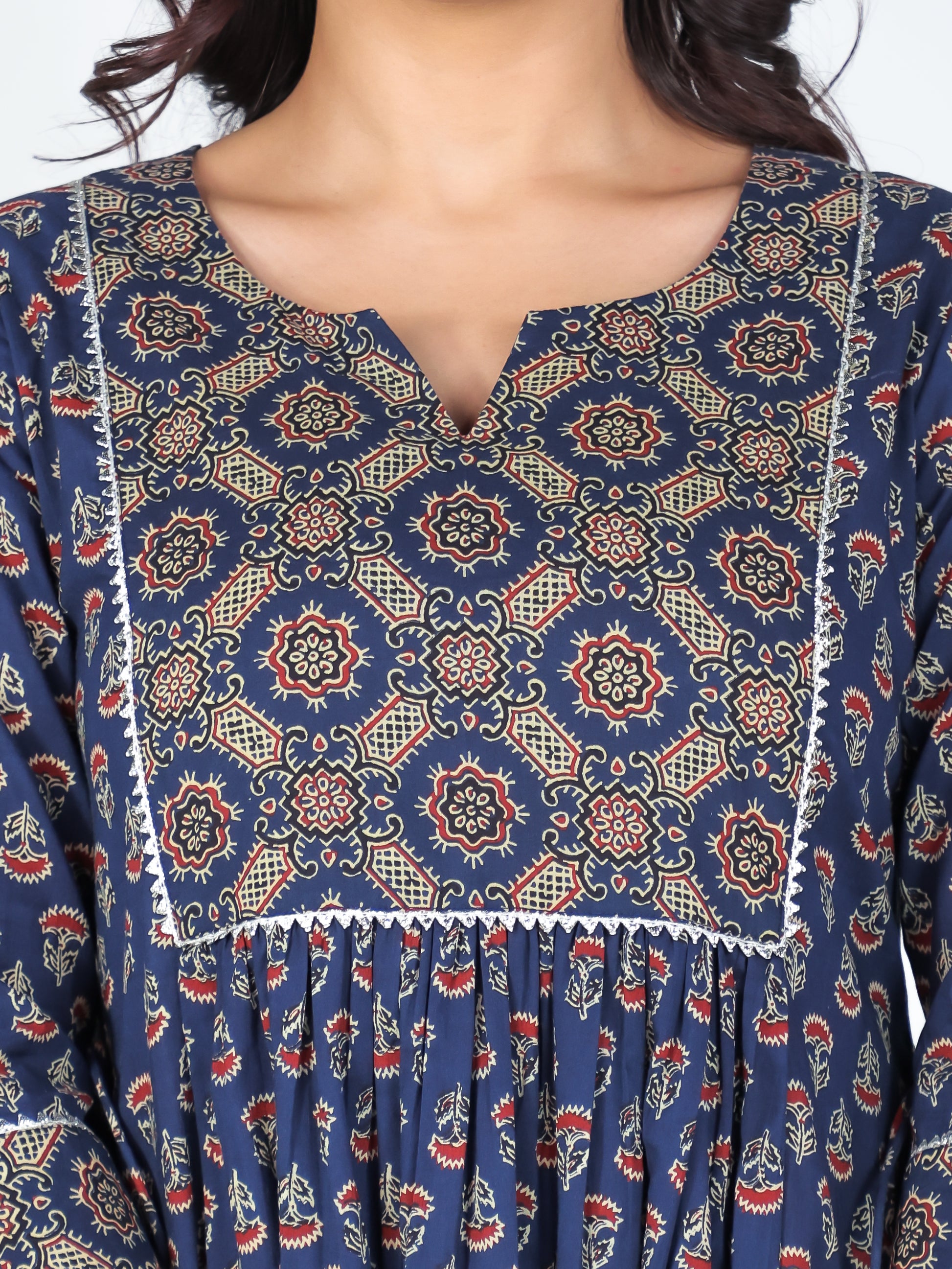 Embroidered Soft Cotton Ajrakh A-line Blue Kurta