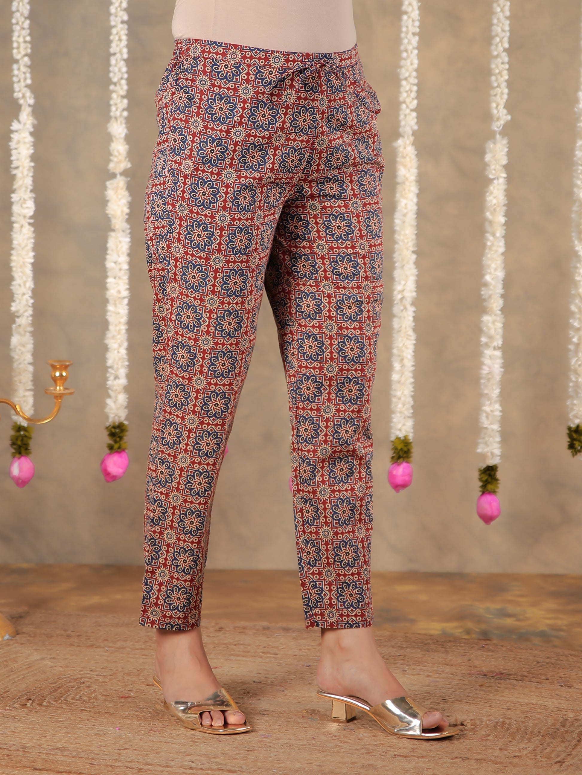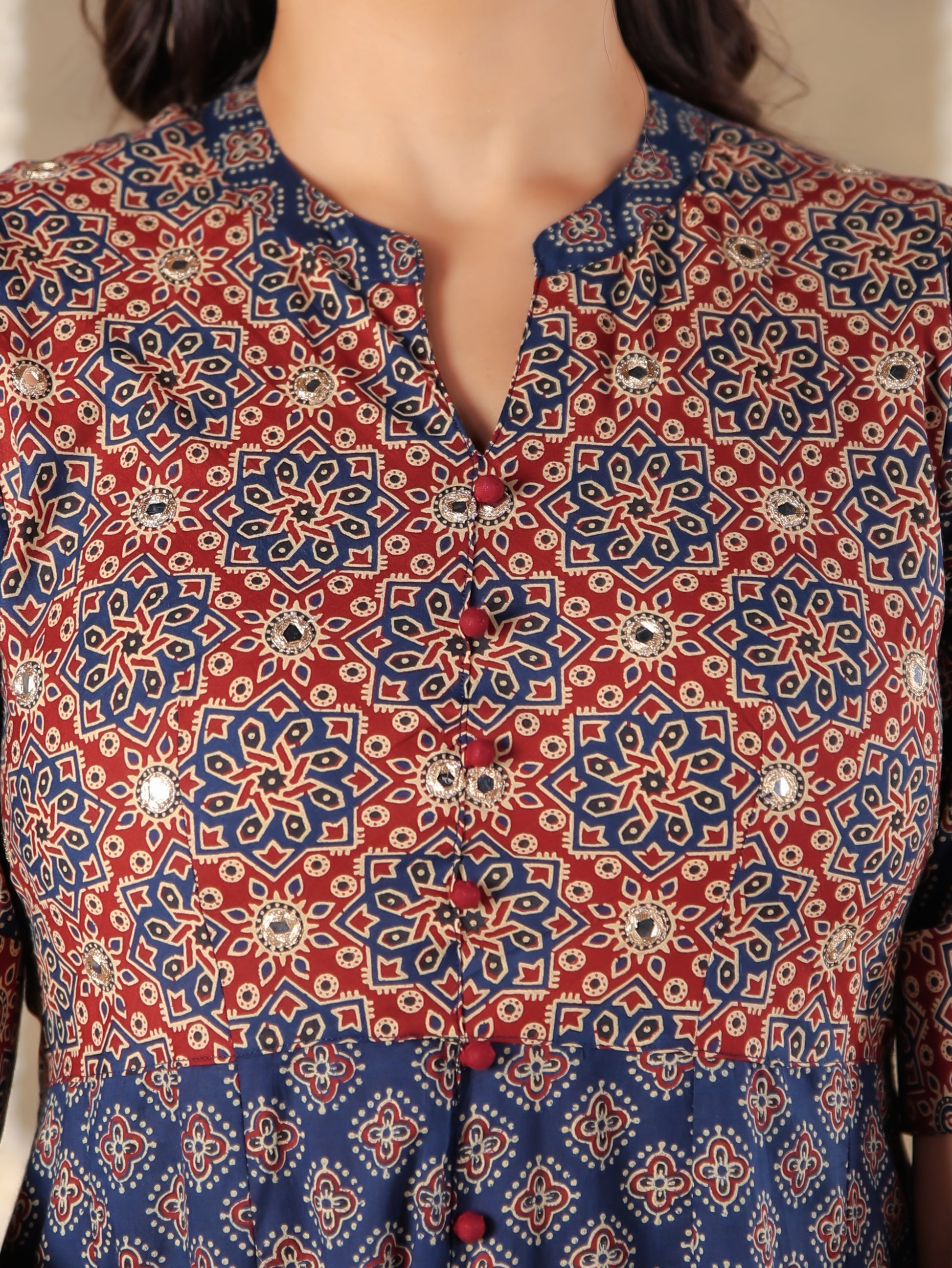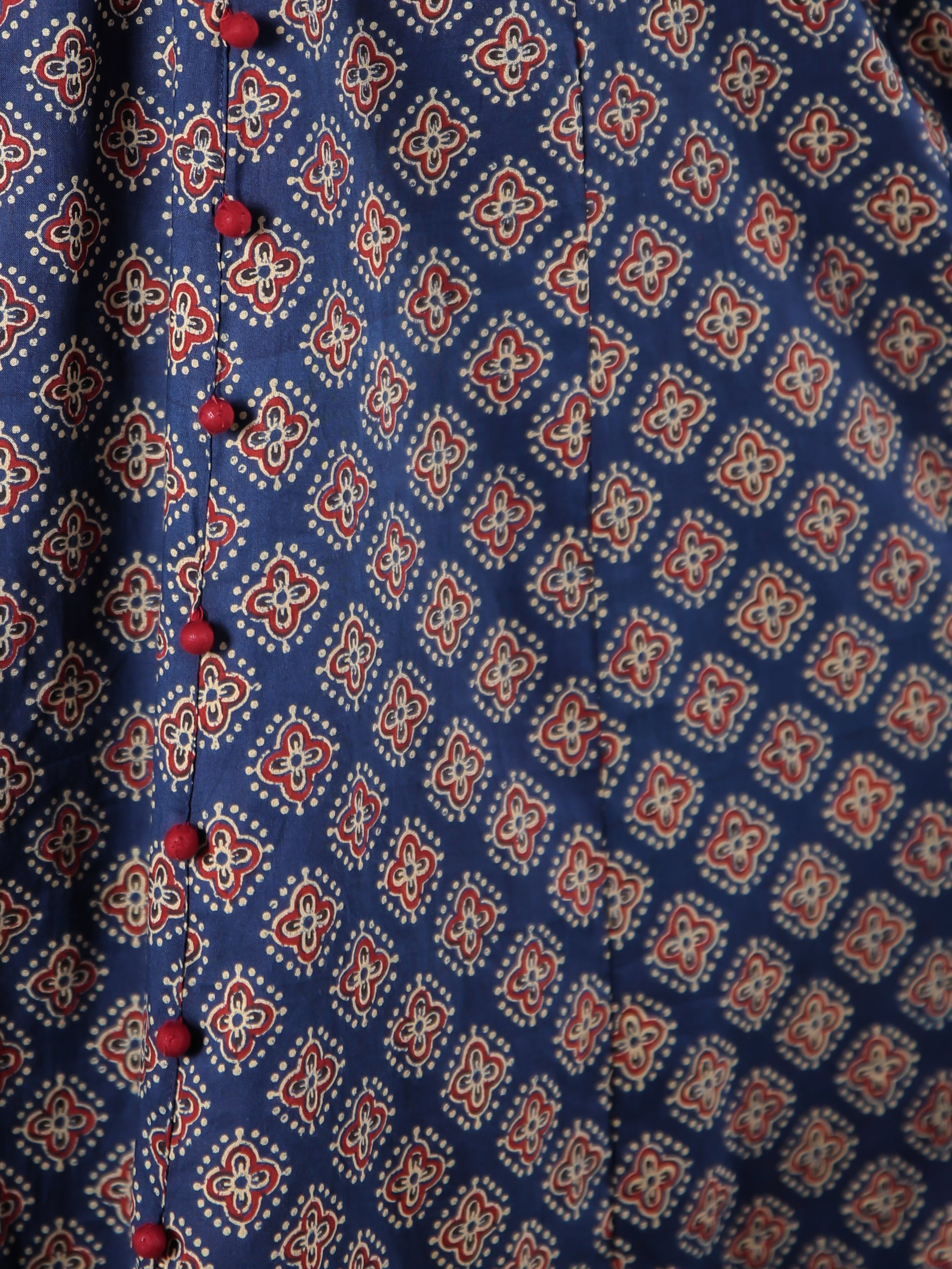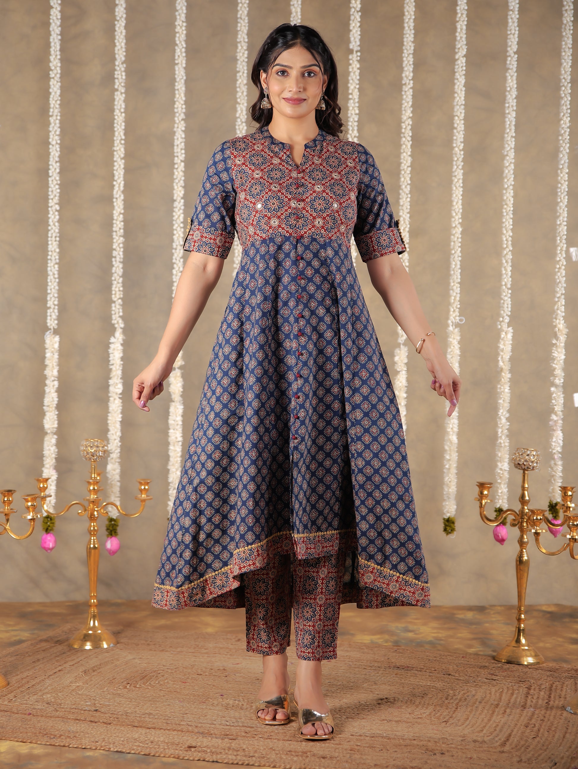 Embroidered Soft Cotton Ajrakh High Low Blue Kurta