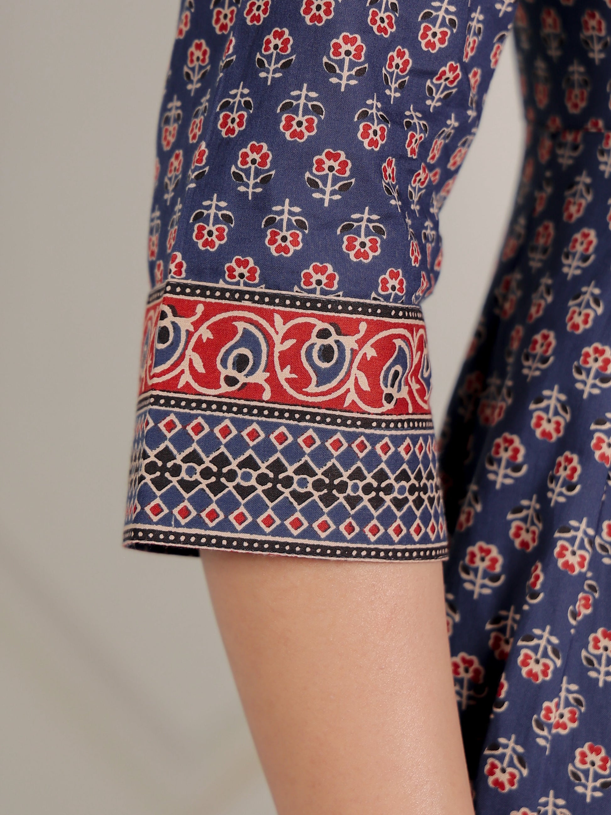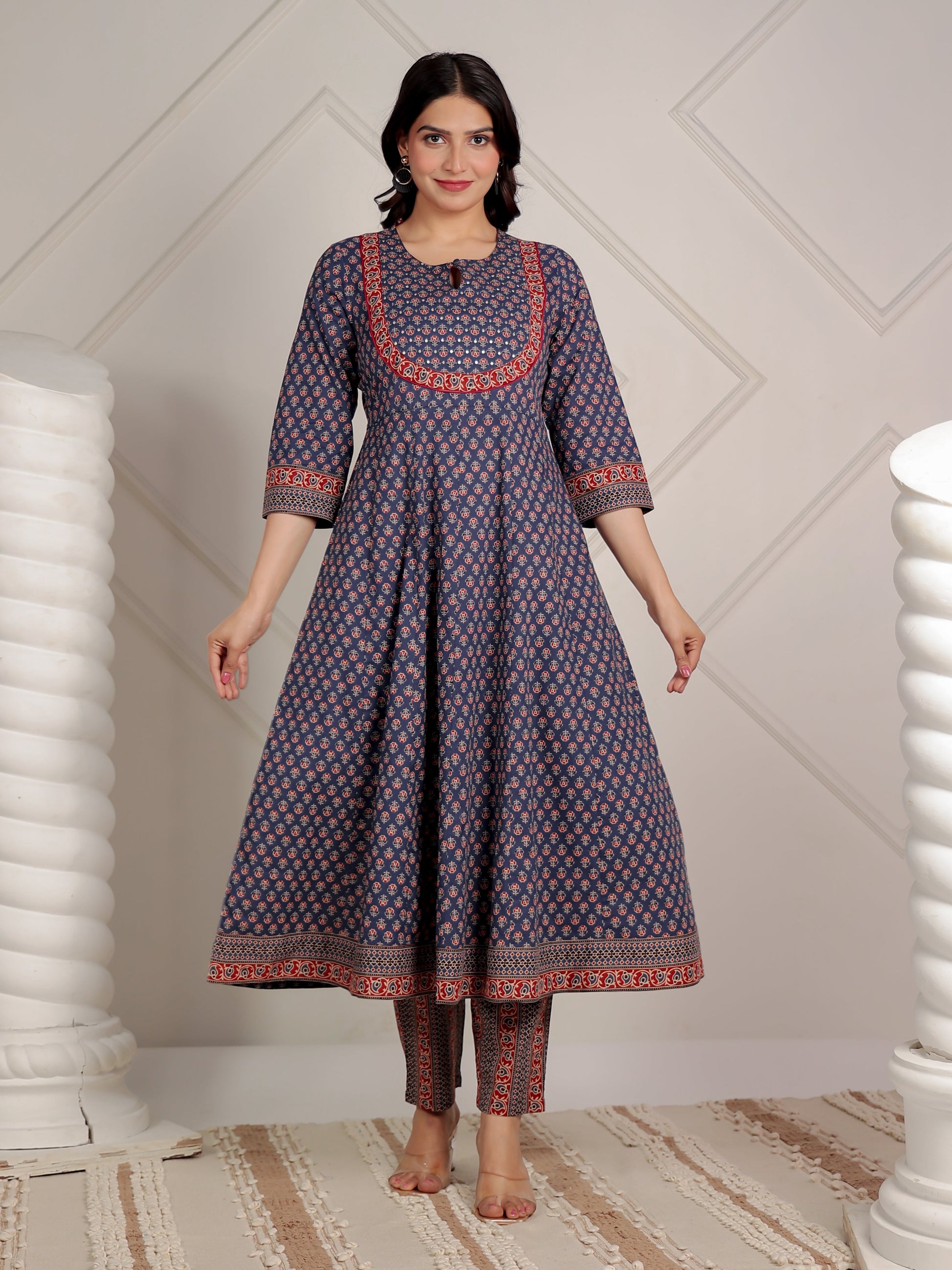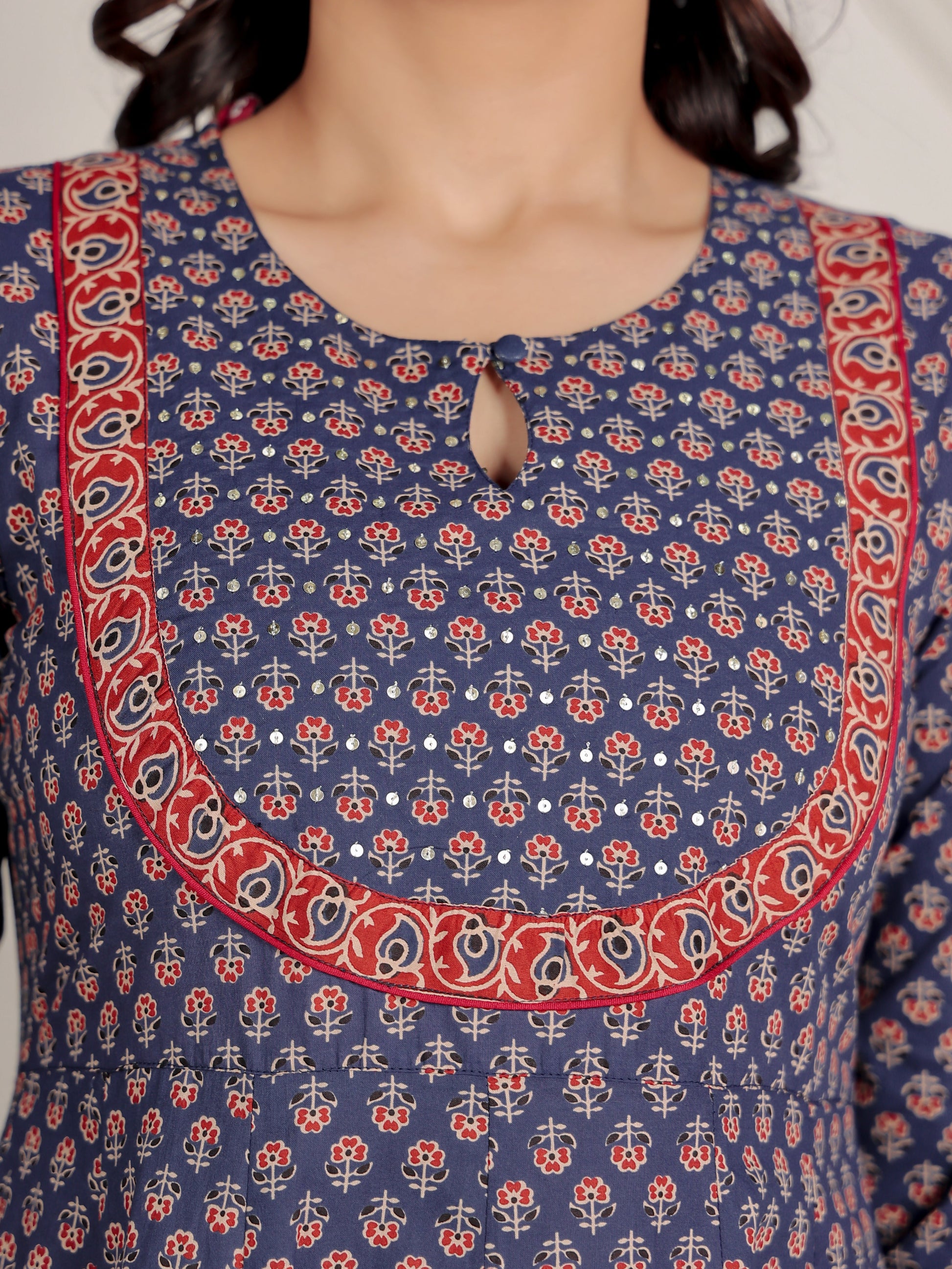 Embroidered Soft Cotton Ajrakh Anarkali Blue Kurta
