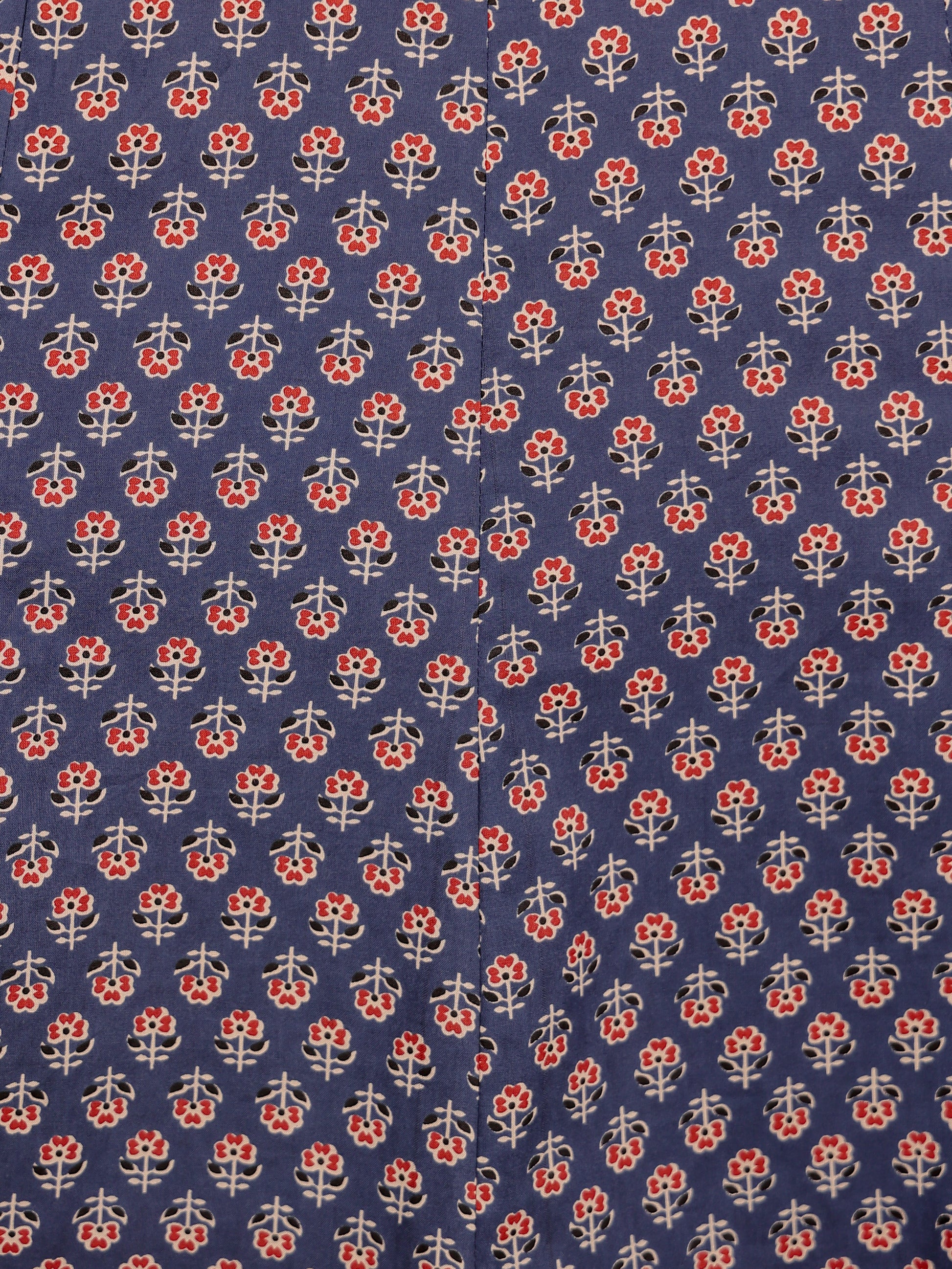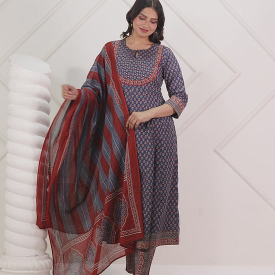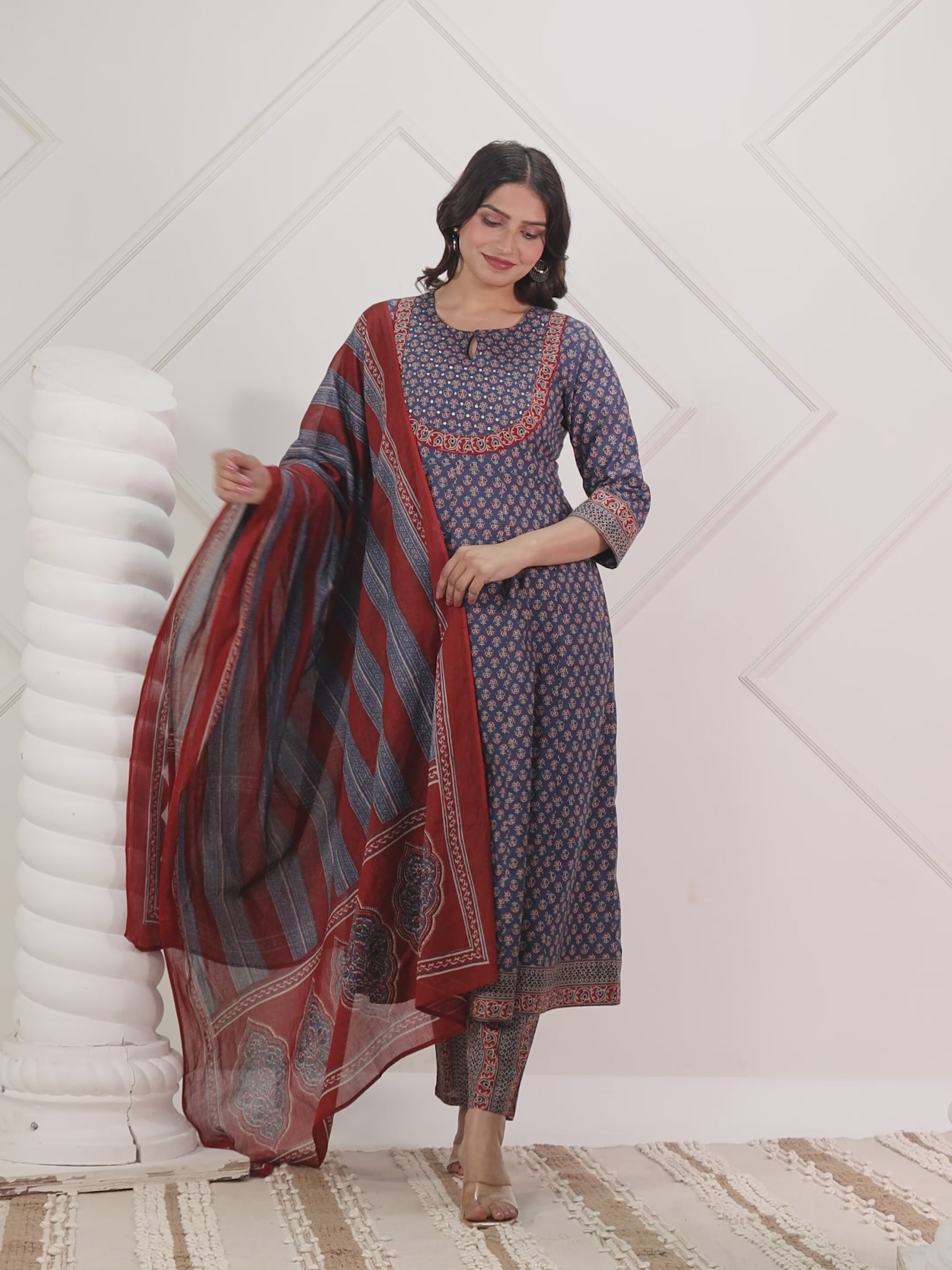 Embroidered Soft Cotton Ajrakh Anarkali Blue Kurta