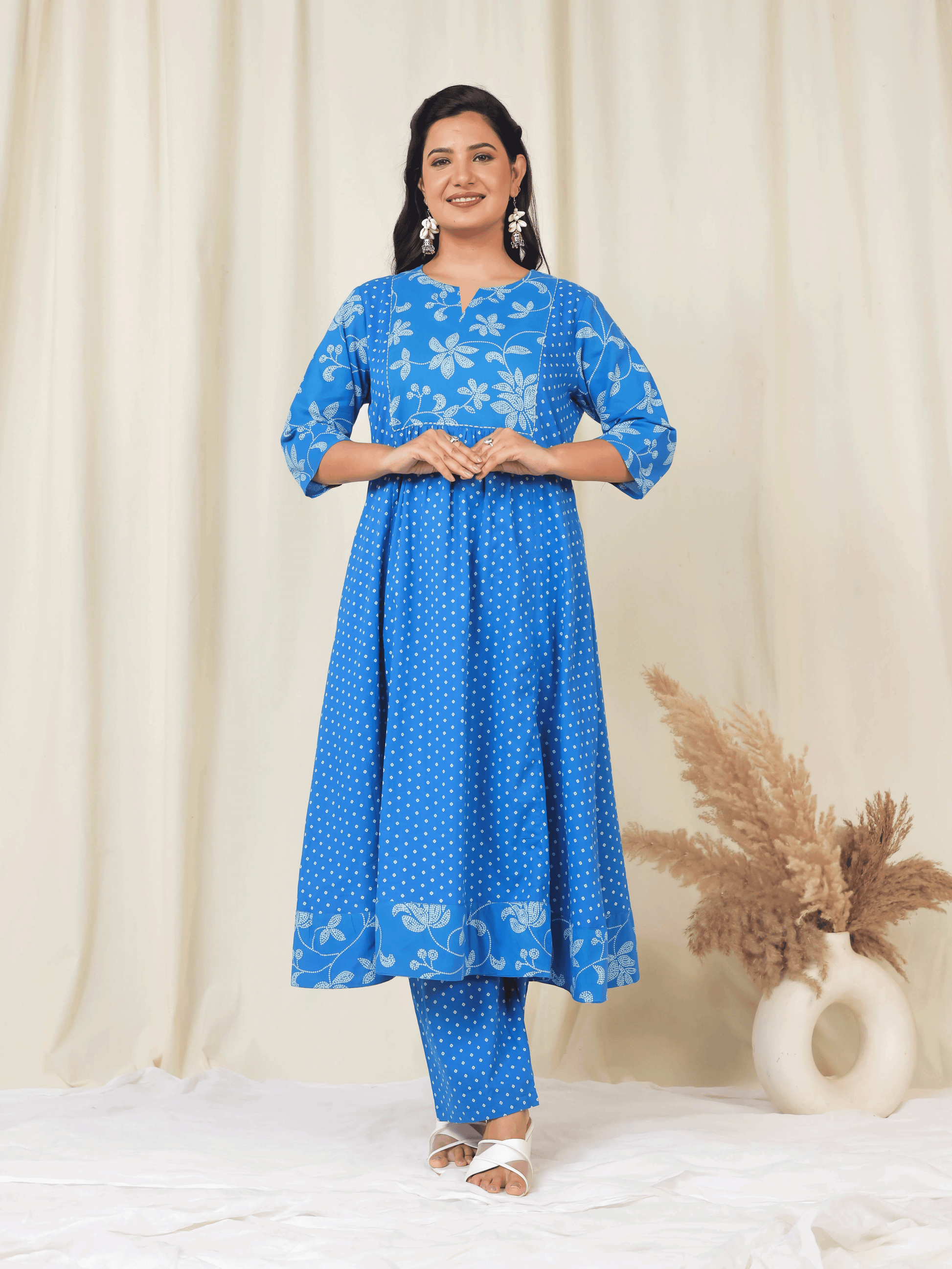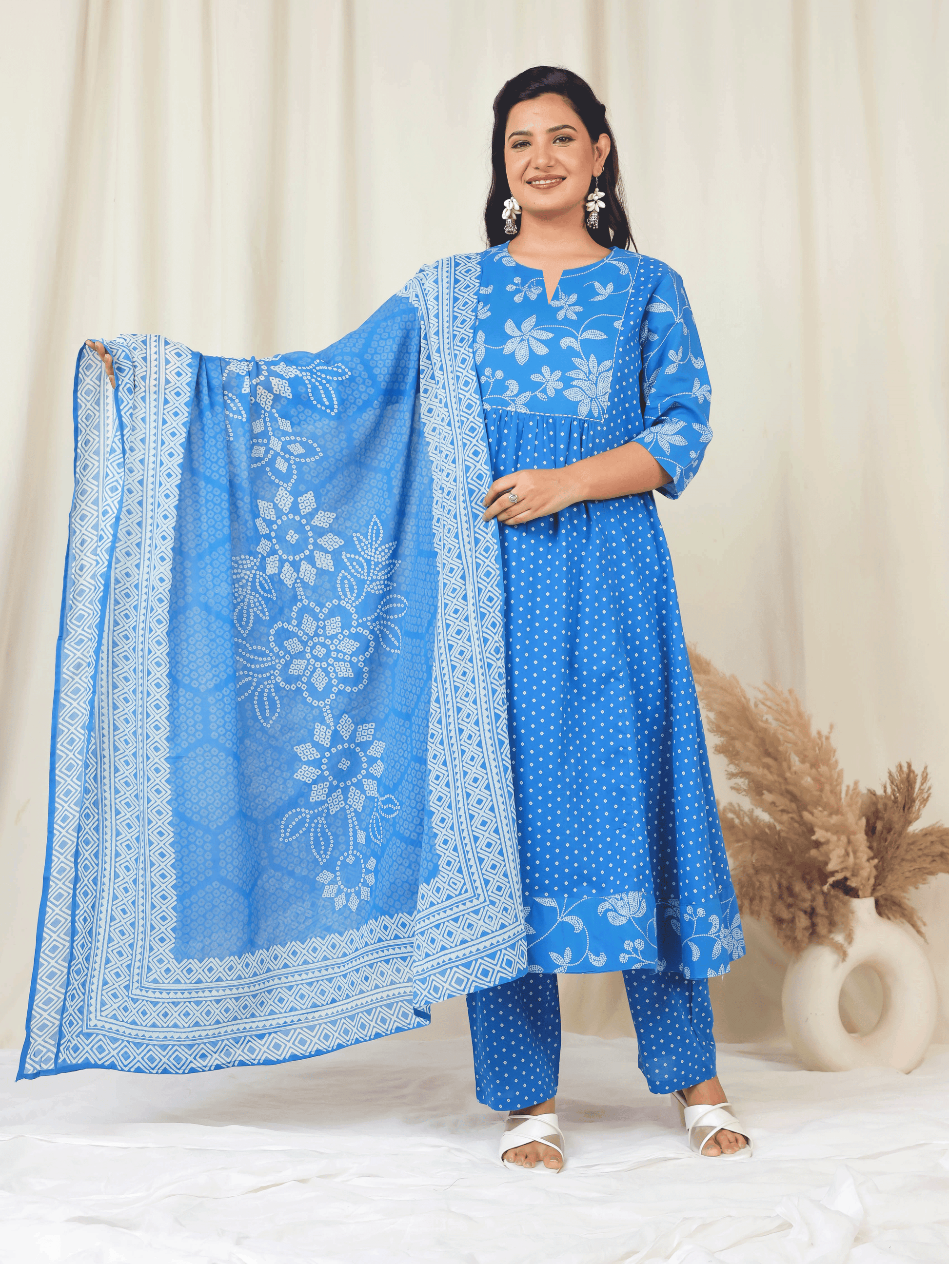 Embroidered Soft Cotton Bandhani Flared Blue Kurta