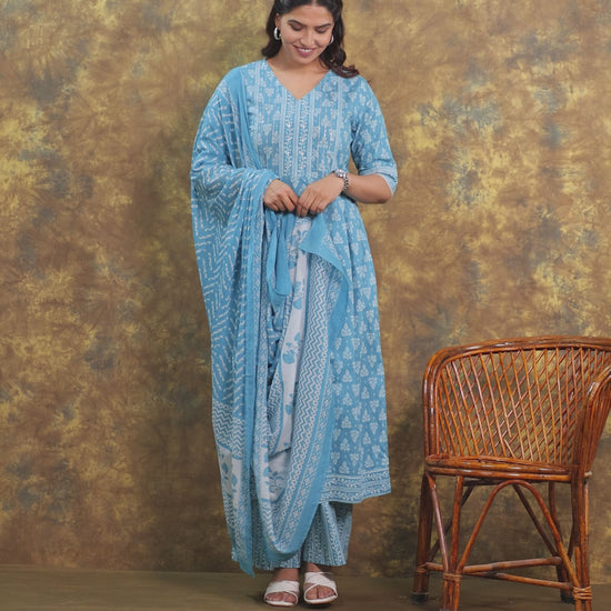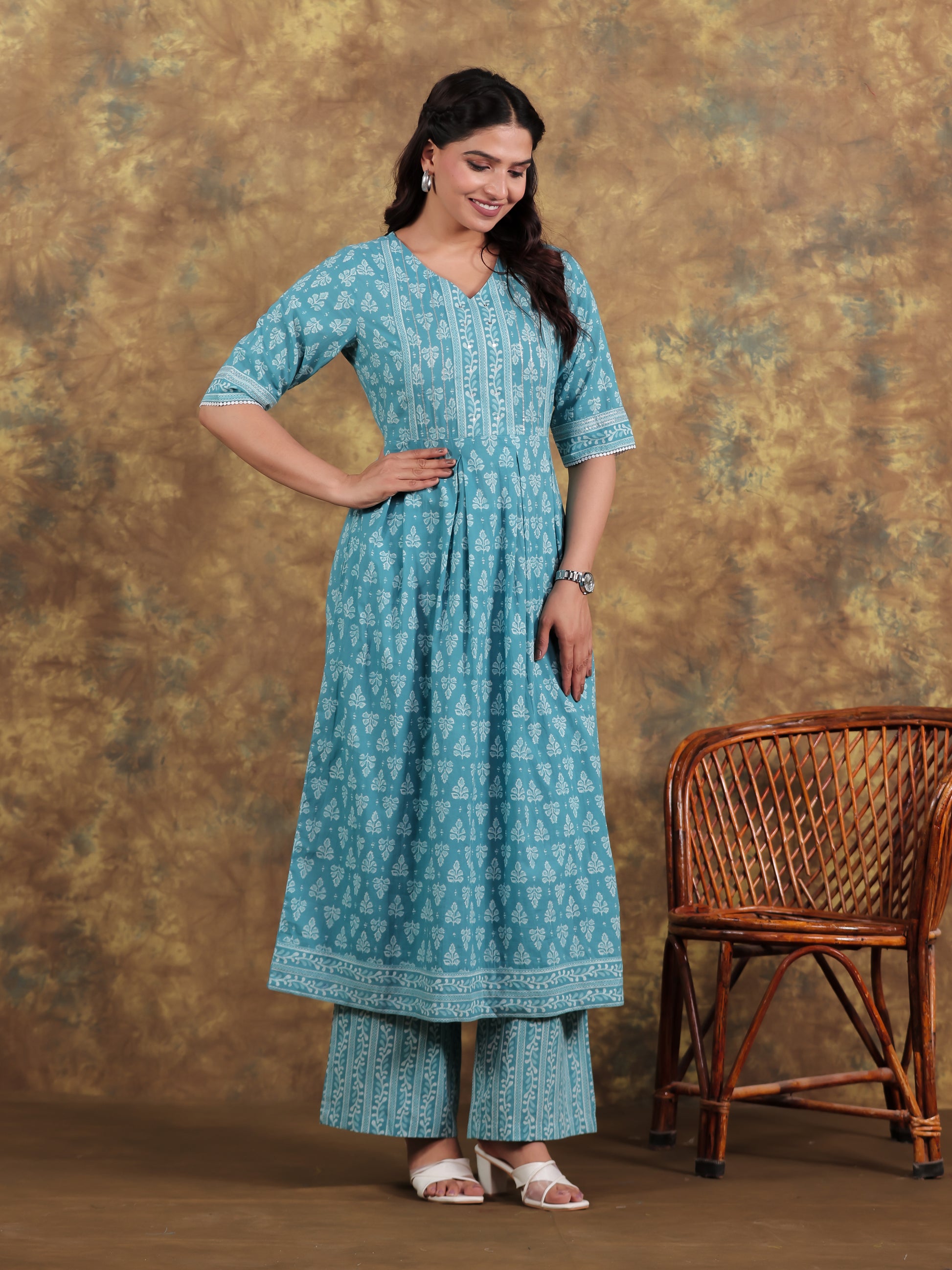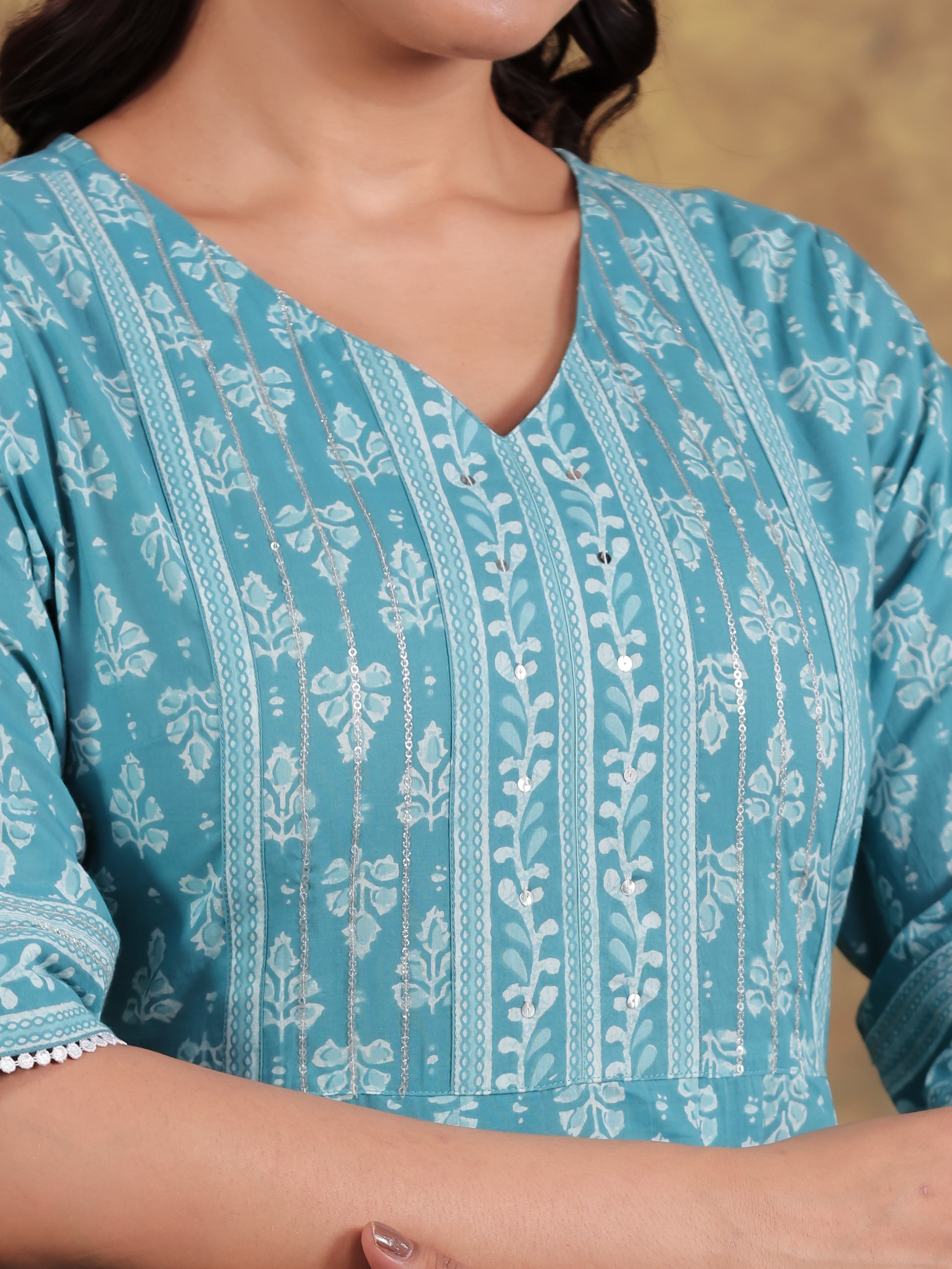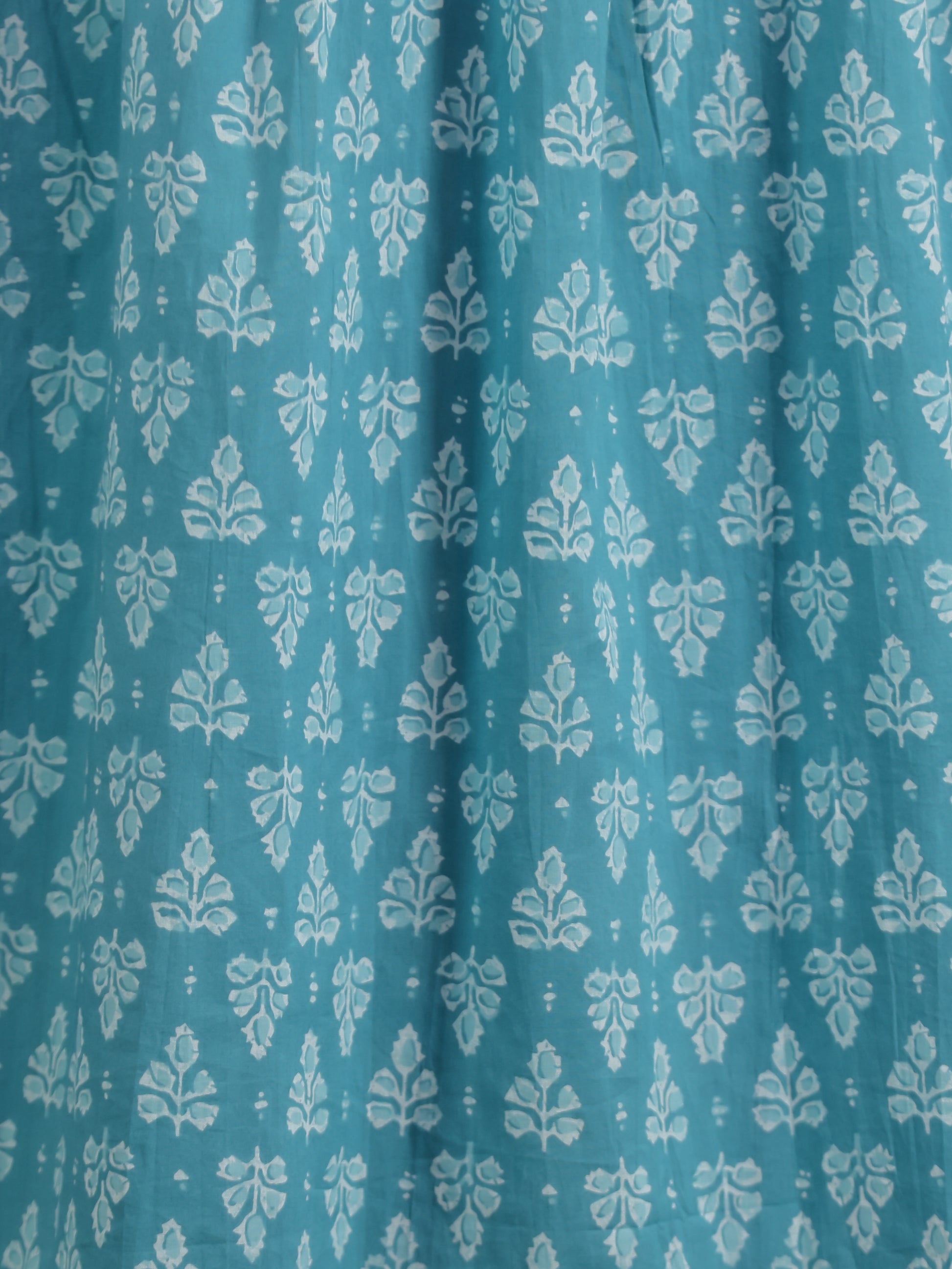 This Turquoise A-line kurta in soft Soft Cotton is a timeless pick for festive and casual wear. Designed with a V neckline and Elbow Length Sleeve sleeves, its graceful Calf Length cut flatters all body types. The delicate Block detailing adds a touch of sophistication. Pair it with statement earrings and juttis for a polished look. Maintain its pristine look by following proper care instructions.