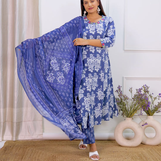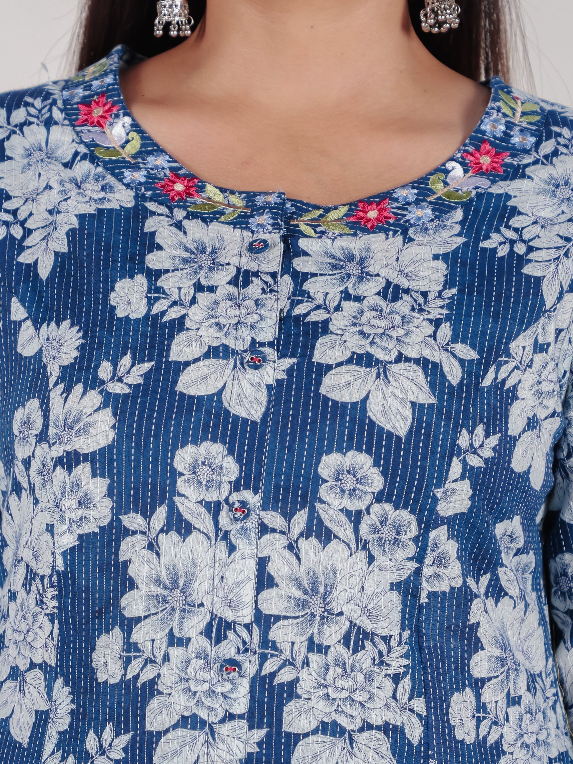 Embroidered Kantha Cotton Floral A-line Blue Kurta