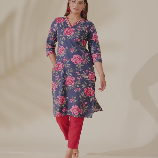 Linen Cotton Floral Straight Blue Kurta