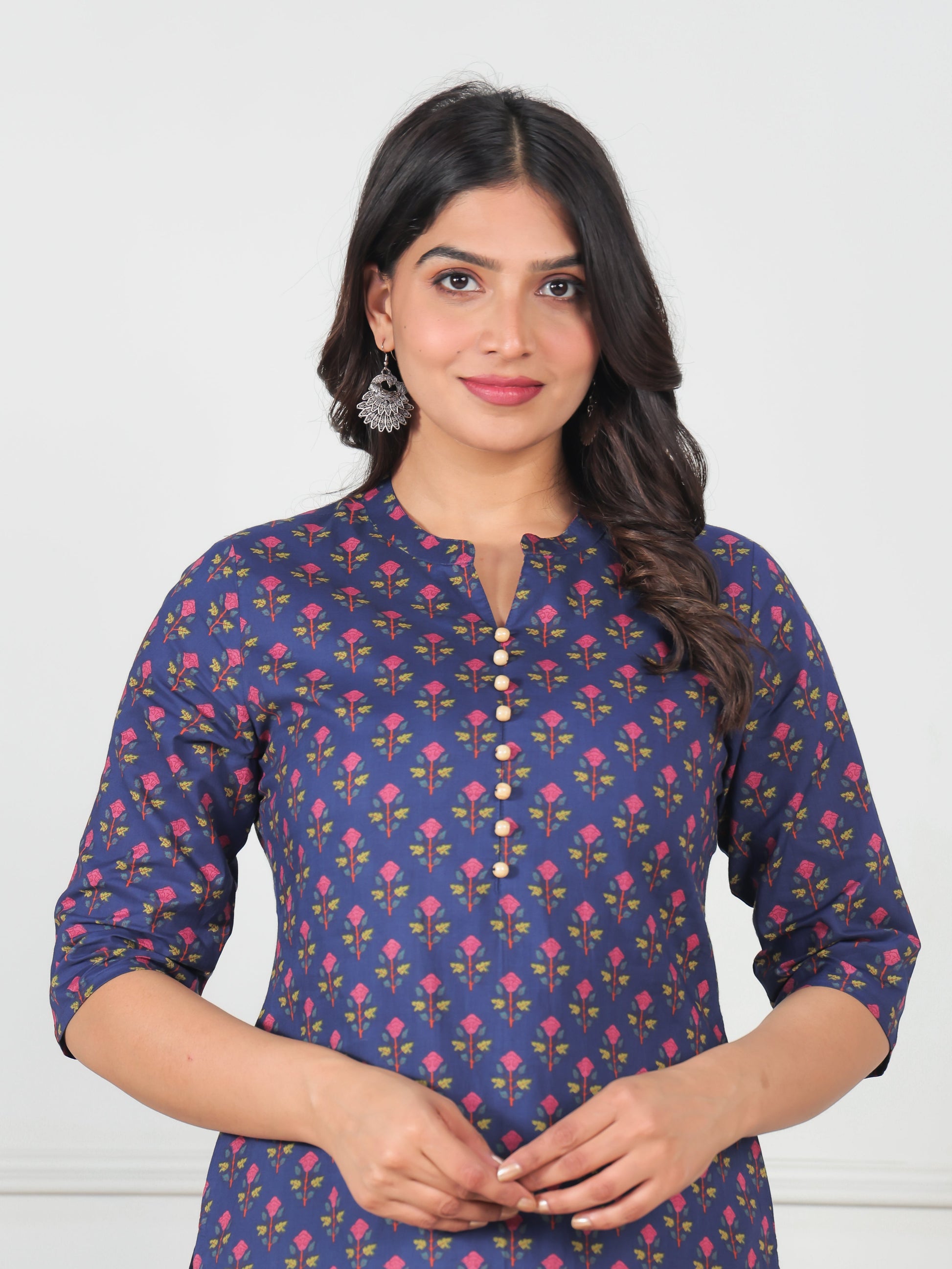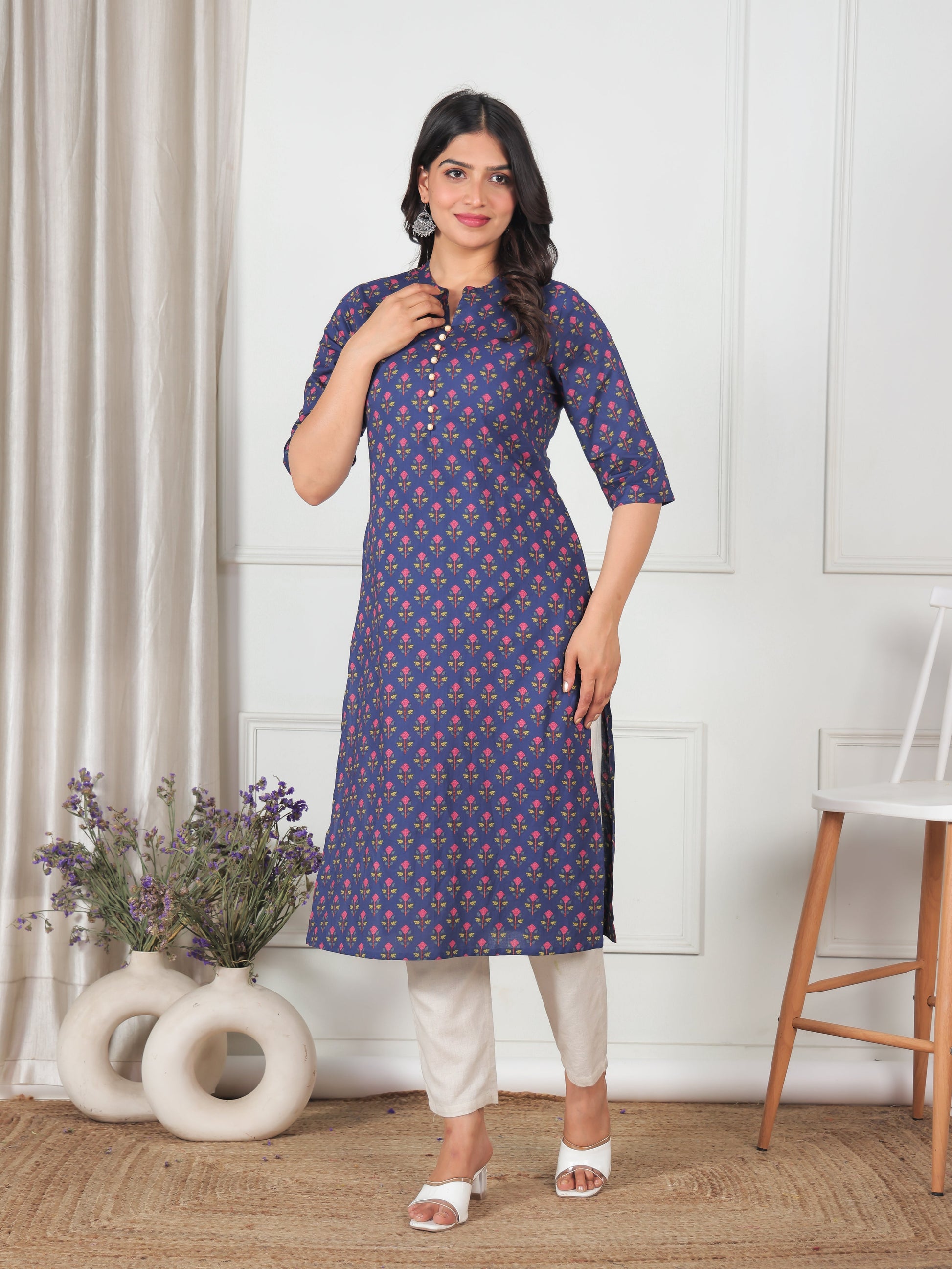 This Blue Straight kurta in soft Soft Cotton is a timeless pick for festive and casual wear. Designed with a Mandarin Collar neckline and 3/4 Sleeve sleeves, its graceful Calf Length cut flatters all body types. The delicate Floral detailing adds a touch of sophistication. Pair it with statement earrings and juttis for a polished look. Maintain its pristine look by following proper care instructions.