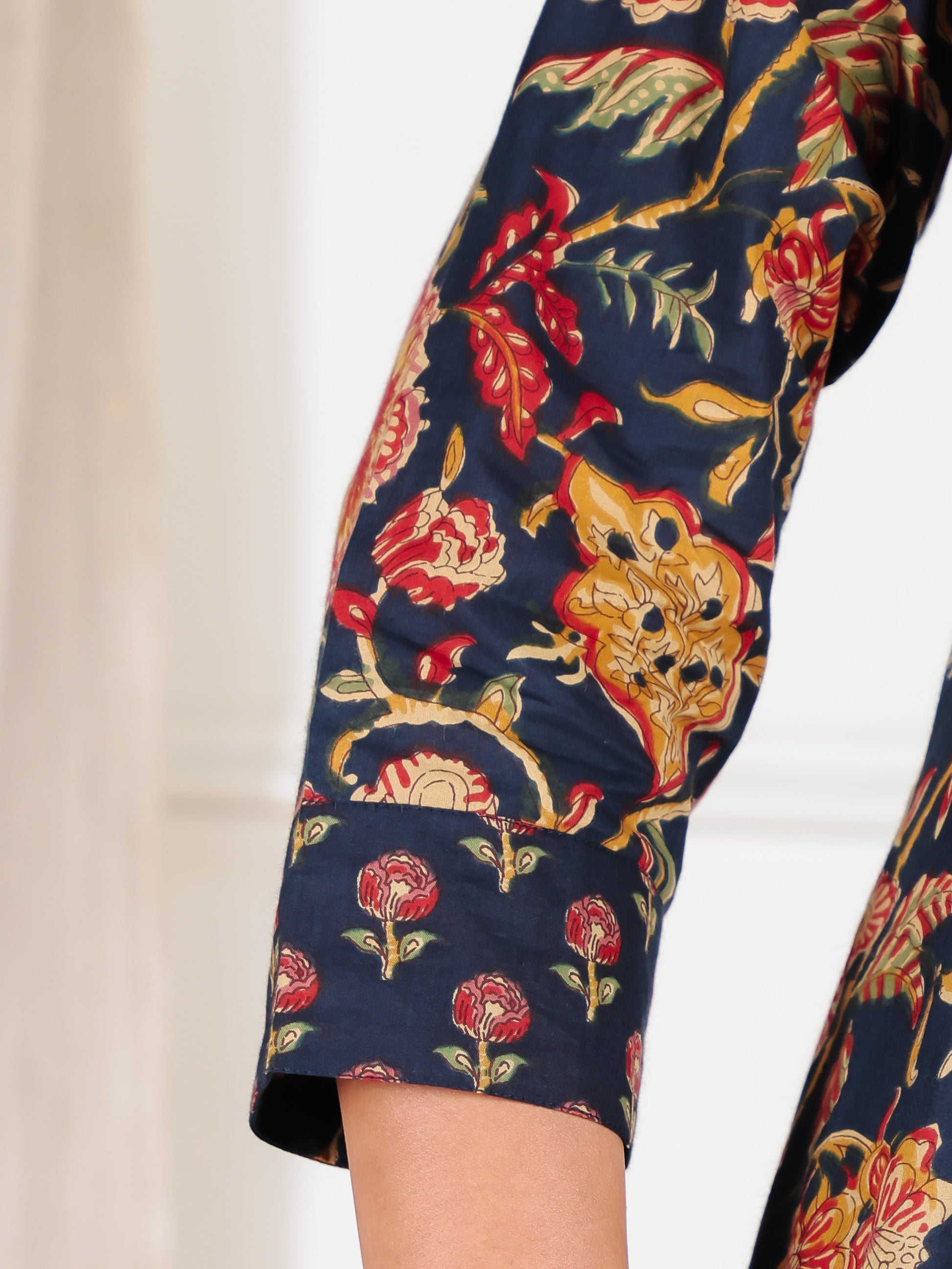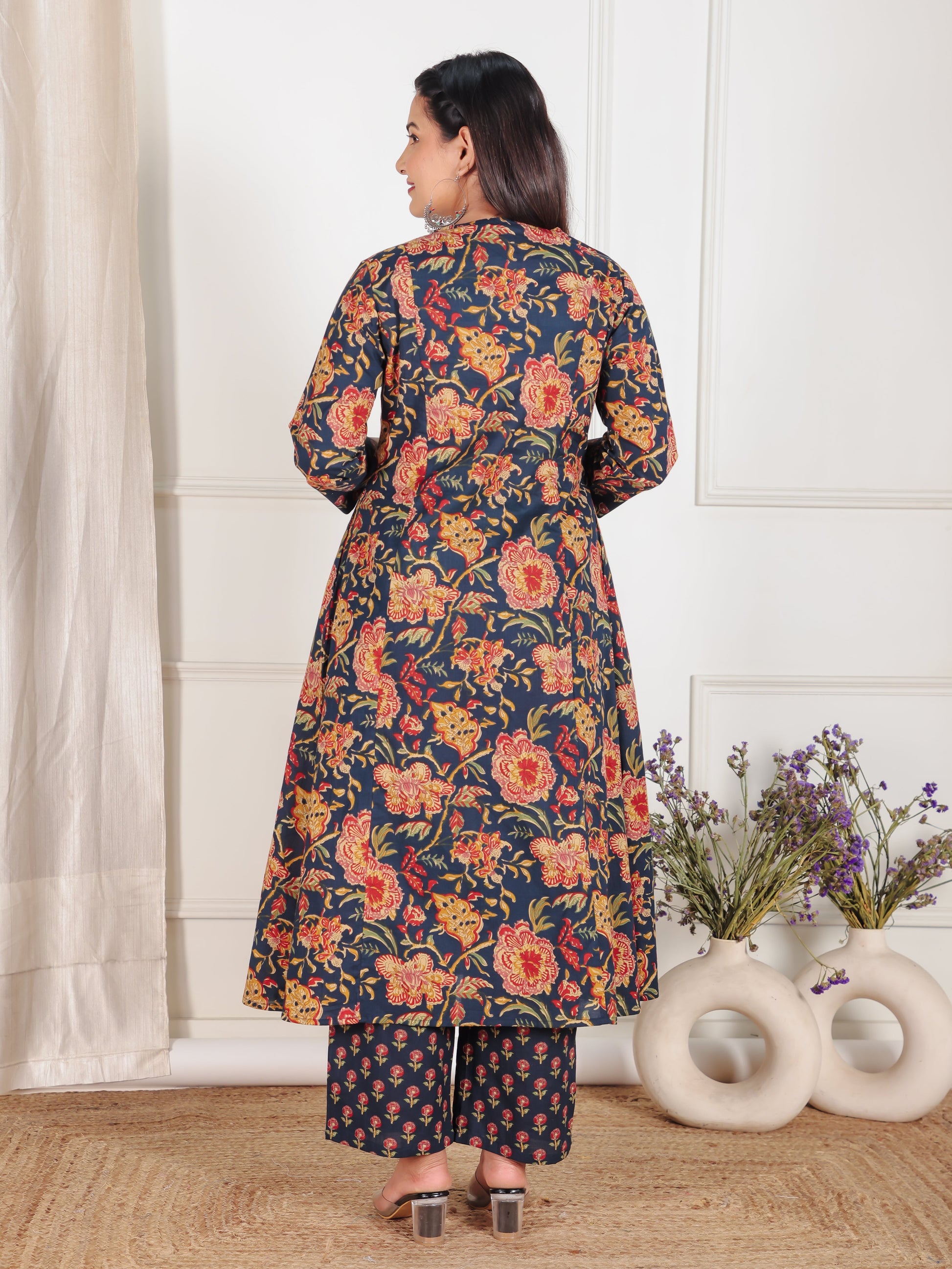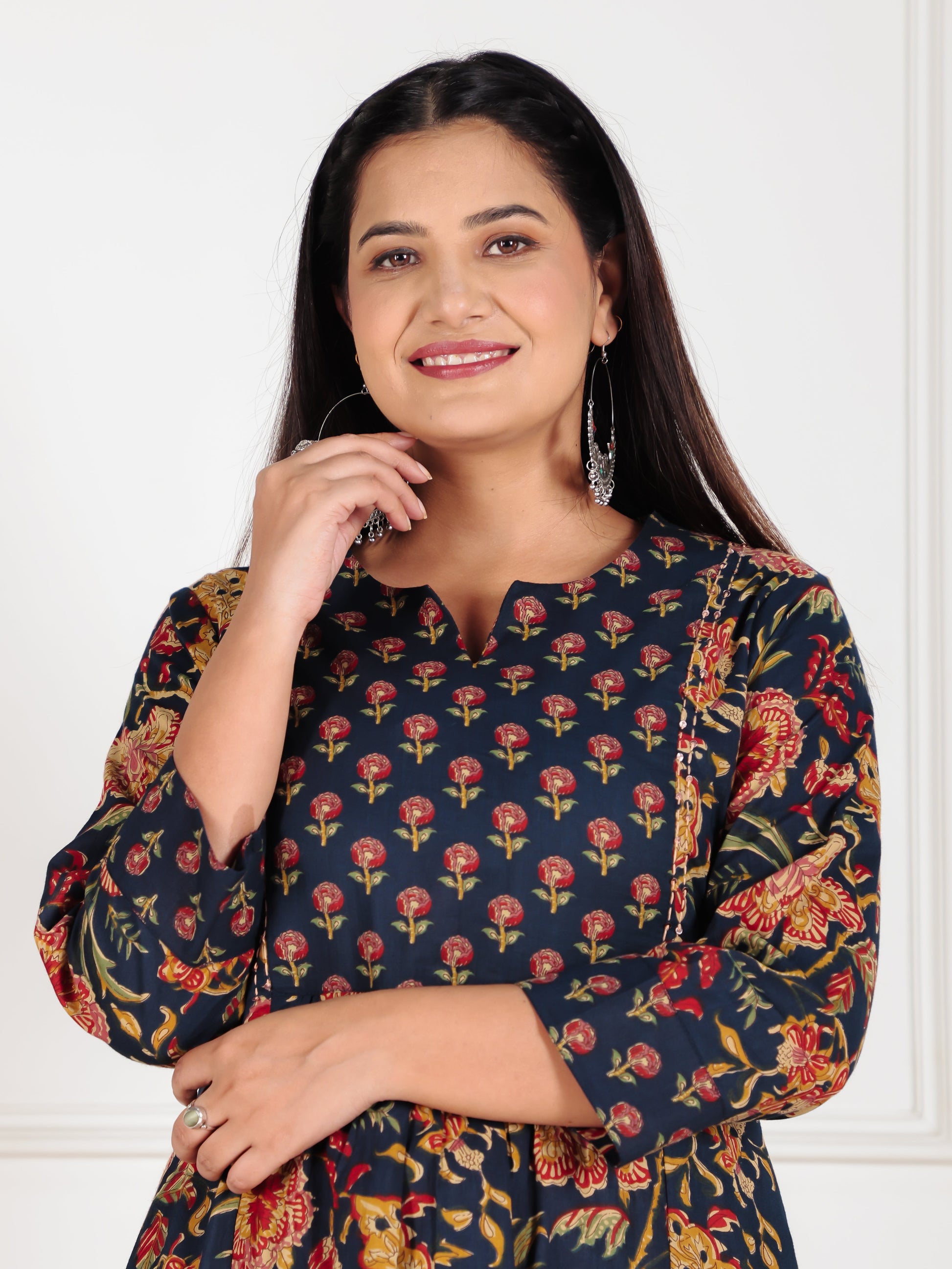 Embroidered Soft Cotton Floral Flared Blue Kurta