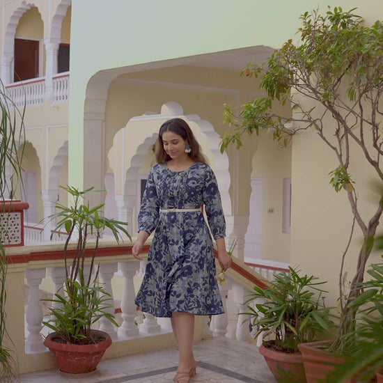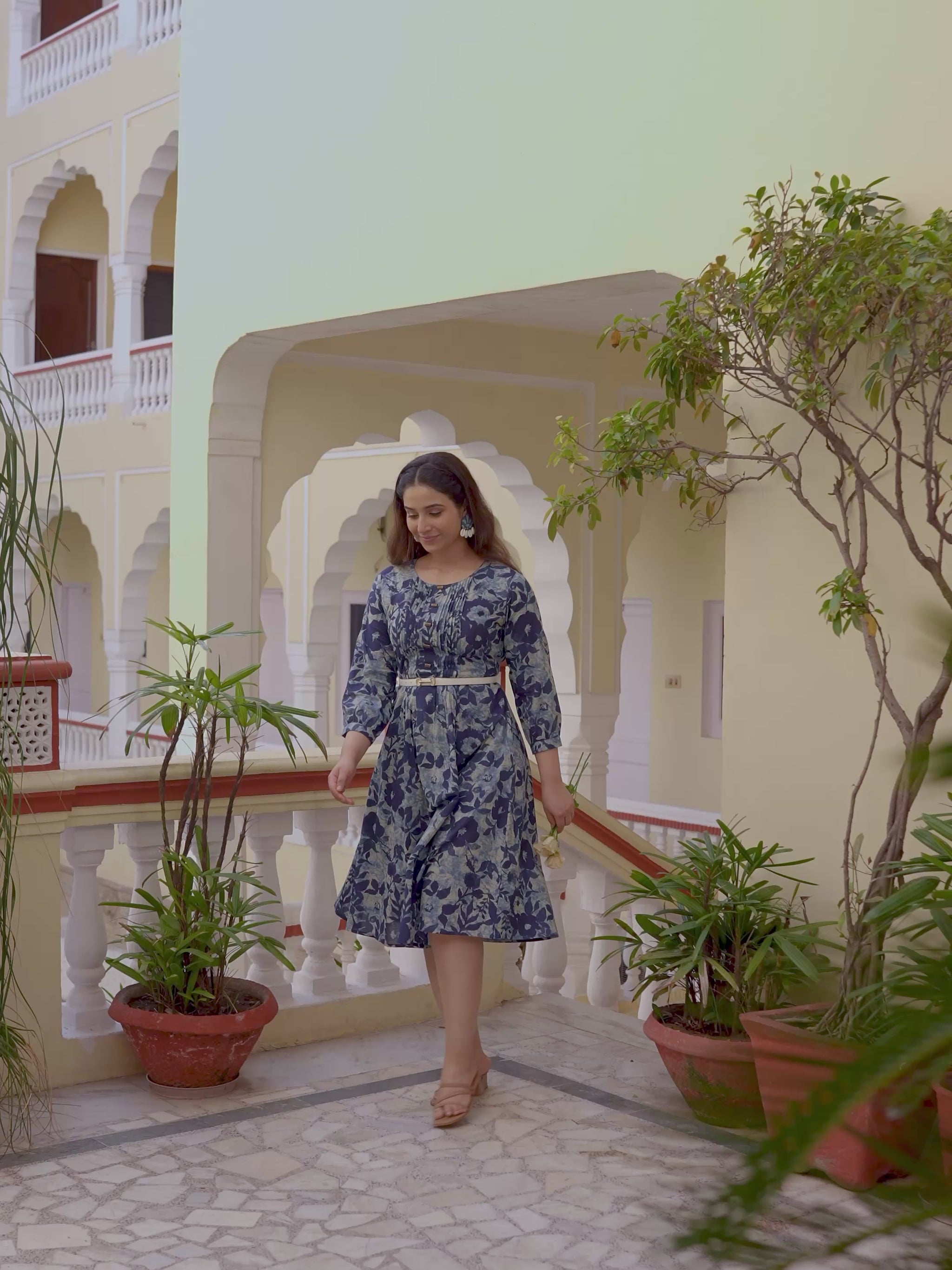 This Blue dress crafted from soft Soft Cotton is designed for comfort and versatility. The A-line cut and Floral patterns add a playful vibe, while work accents make it unique. Perfect for holidays, shopping trips, or relaxed evenings. Style with a sling bag and chic sandals. Care is effortless with simple instructions.