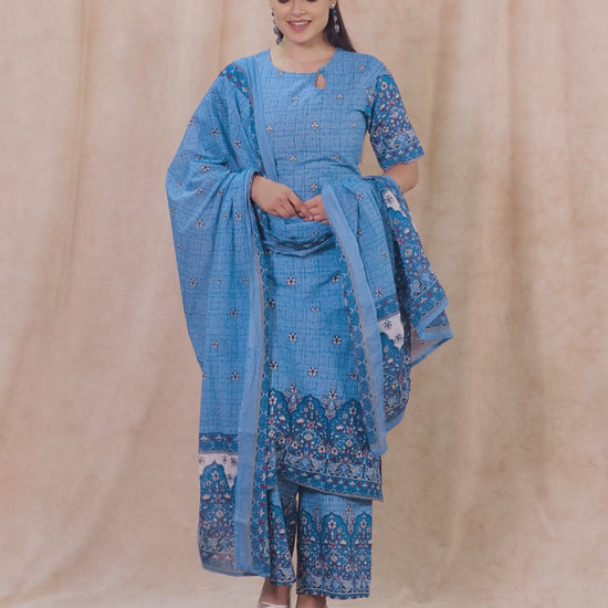 This blue floral kurta offers the perfect blend of comfort and style. The beautiful floral pattern complements the elegant keyhole neckline. The decorative button work adds functional elegance to the design. This straight kurta design offers effortless elegance with its streamlined proportions. This knee length kurta features 3/4 sleeve that provide a balanced look. Suitable for daily wear or casual outings, and easily maintained with machine wash.