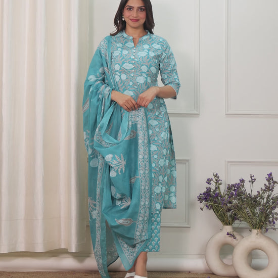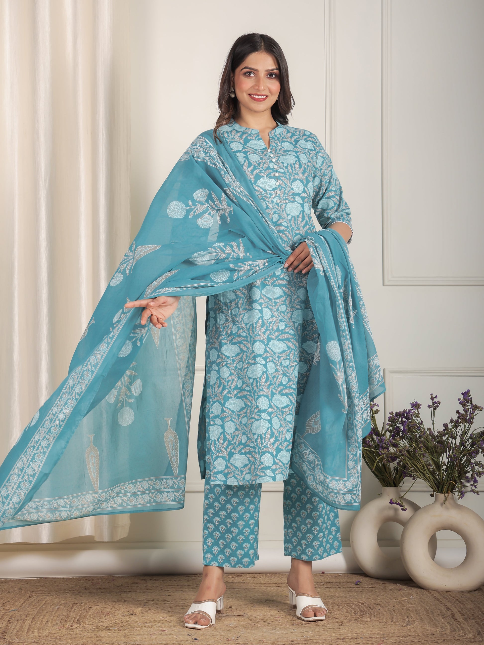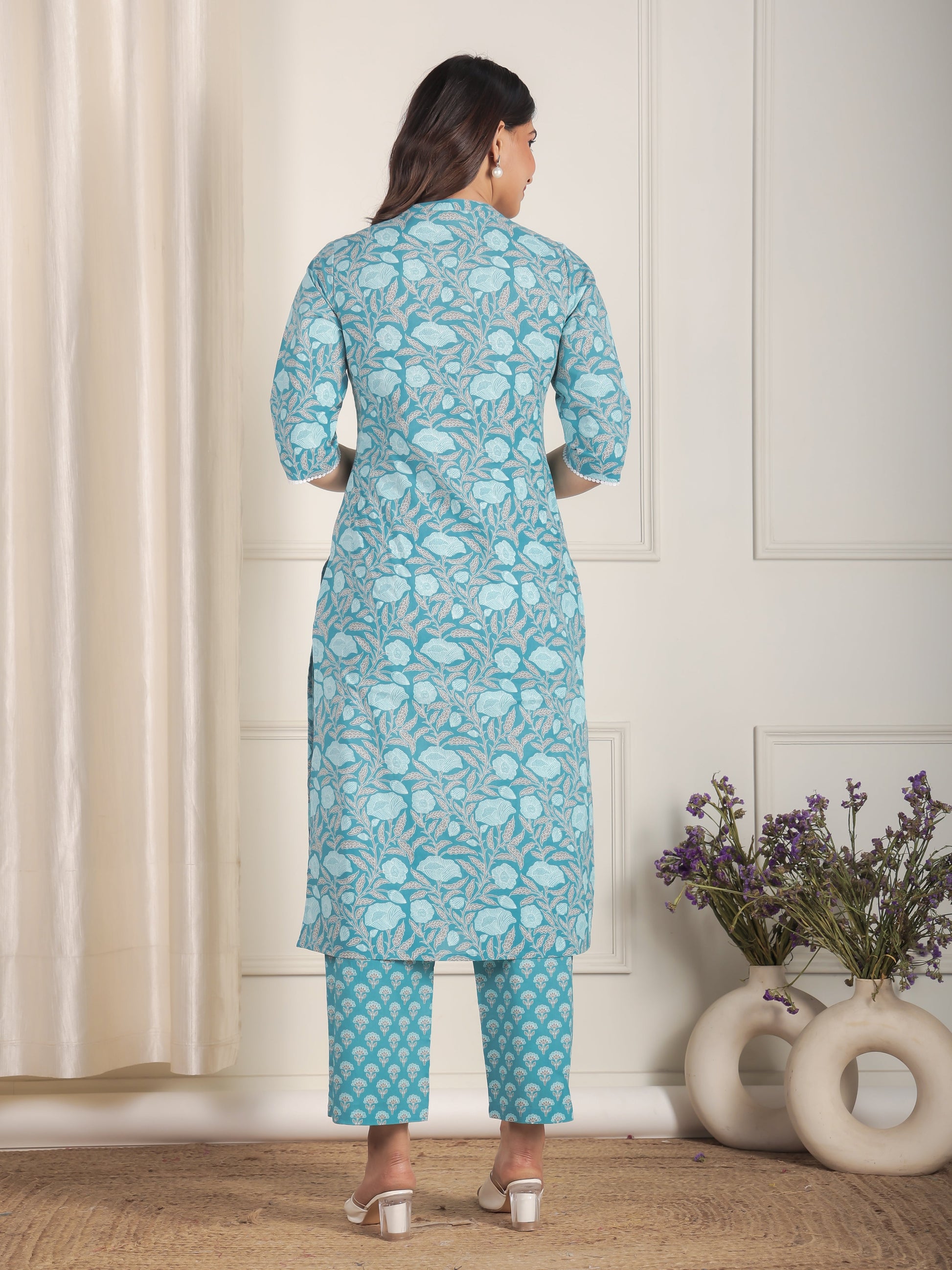 Elevate your ethnic wardrobe with this blue soft cotton kurta & trousers. The beautiful floral pattern complements the elegant mandarin collar neckline. The trousers offer a contemporary twist with their clean, streamlined fit. These ornate button, lace embellishments create textural interest with elegant appeal. The straight cut kurta design provides a sleek profile that elongates your frame beautifully. Perfectly tailored with 3/4 sleeve and a calf length for versatile styling.