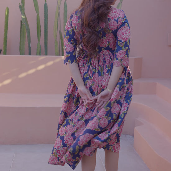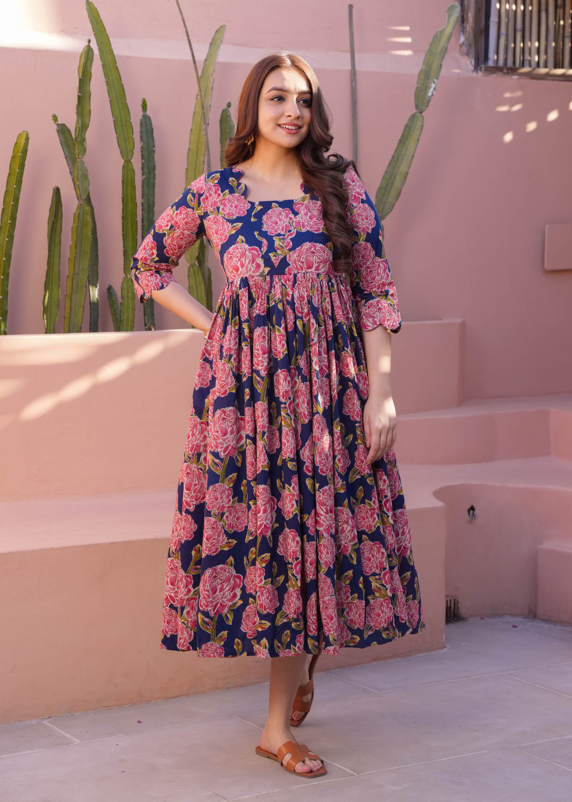 Elevate your ethnic wardrobe with this blue soft cotton kurta. The beautiful floral pattern complements the elegant v neckline. Adorned with intricate gathers work that showcases fine craftsmanship. The elegant flared cut adds volume and drama to your traditional look. This calf length kurta features 3/4 sleeve that provide a balanced look. Suitable for daily wear or casual outings, and easily maintained with machine wash.