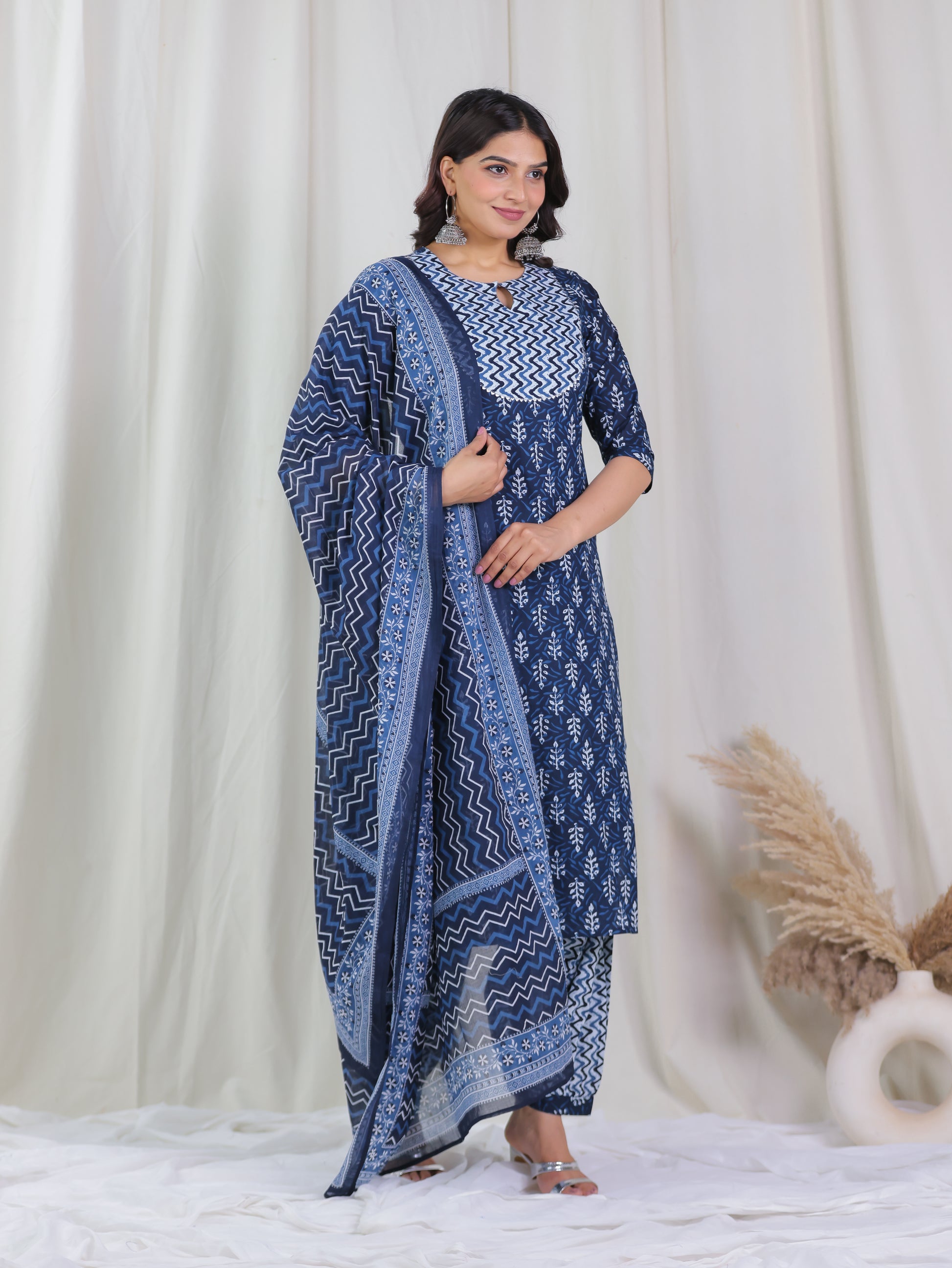 This Indigo Blue Soft Cotton kurta with a Straight flare is designed for comfort and style. Featuring a Keyhole neckline, 3/4 Sleeve sleeves, and a graceful Calf Length hemline, it’s perfect for festive wear or semi-formal gatherings. The Floral highlights add depth and texture, making it a standout piece. Accessorise with a contrasting dupatta and keep it pristine by following proper care instructions.
