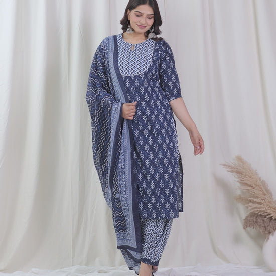 Soft Cotton Floral Straight Indigo Blue Kurta