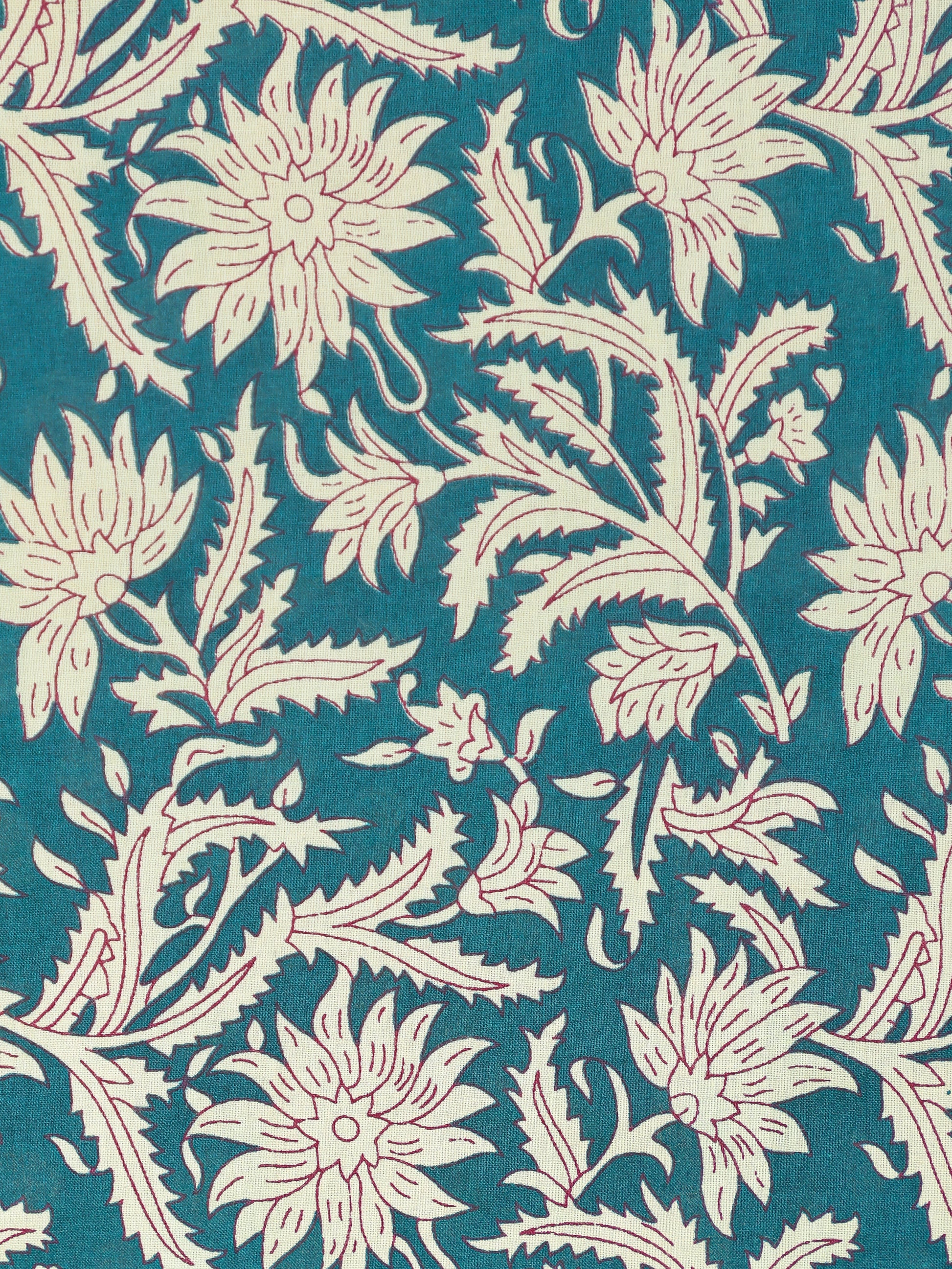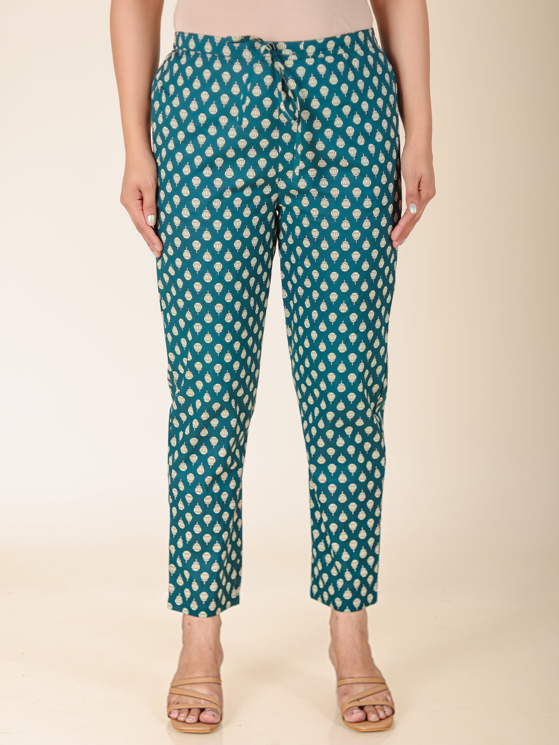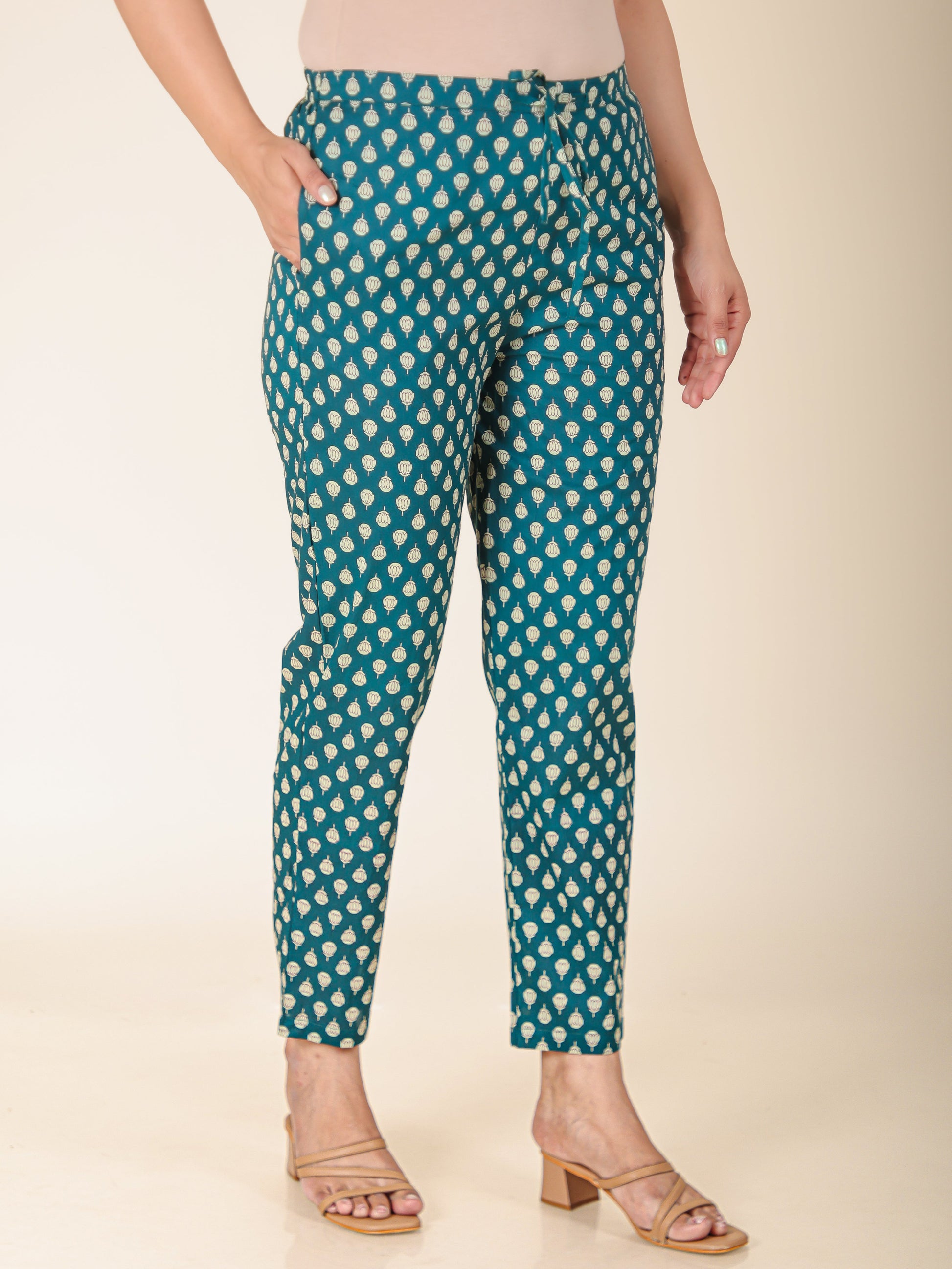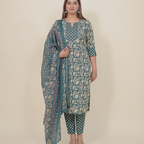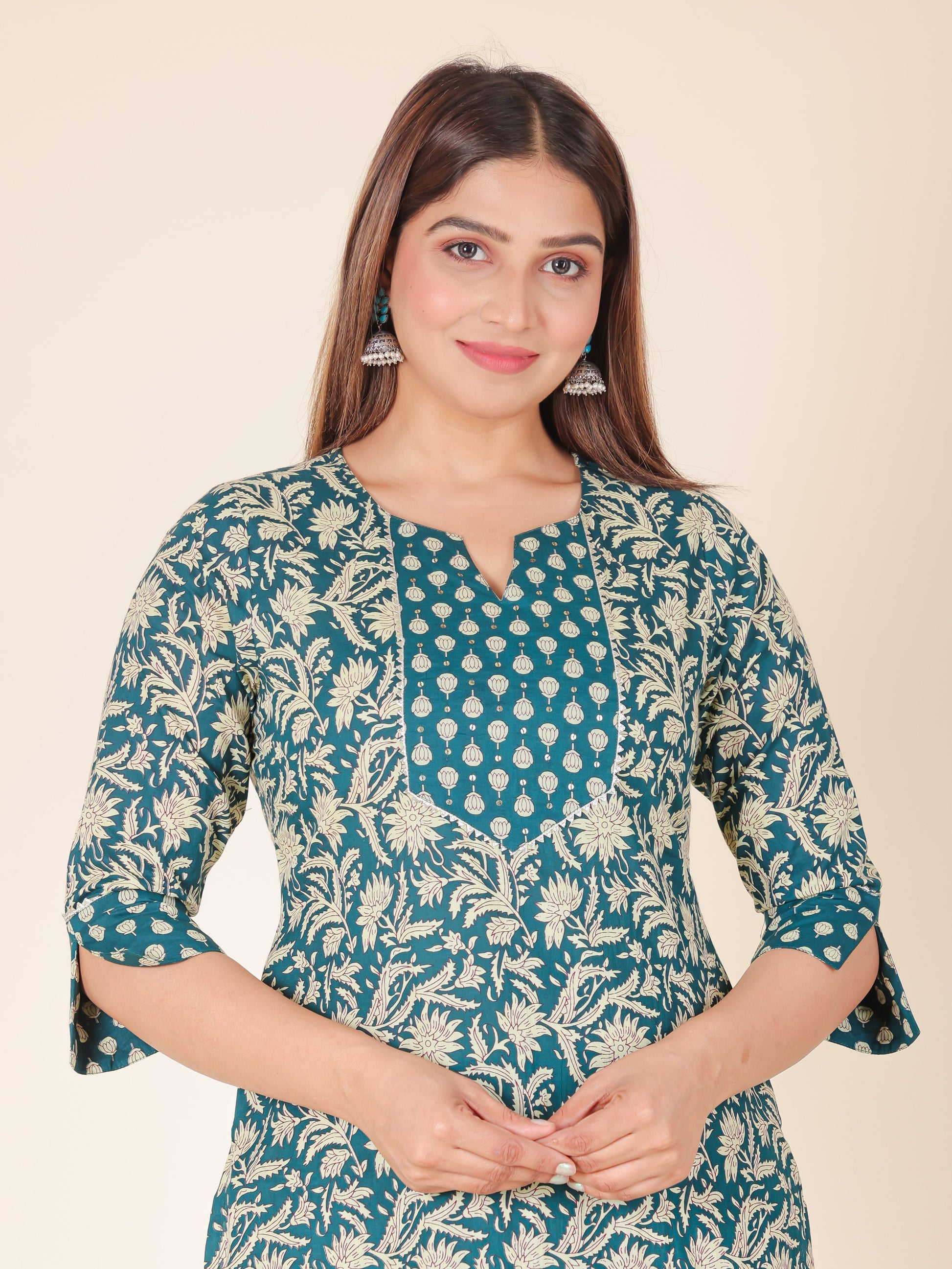 Embroidered Soft Cotton Block Print Straight Teal Kurta