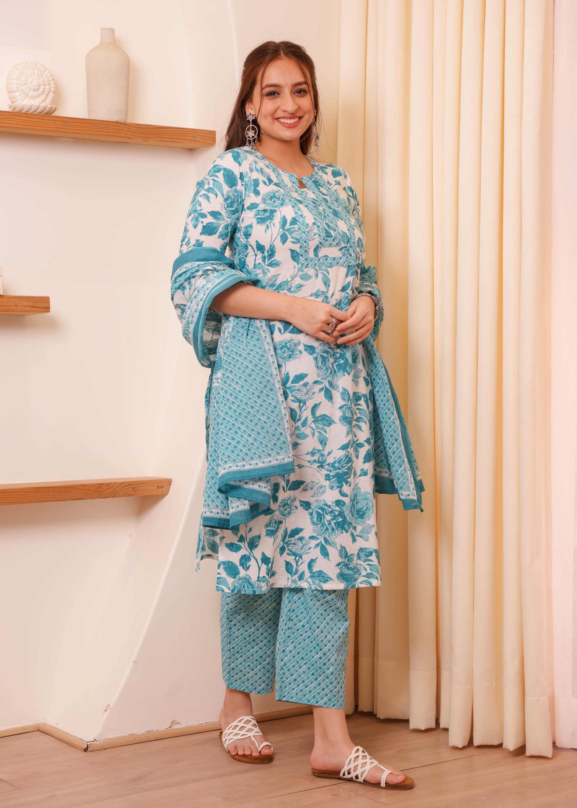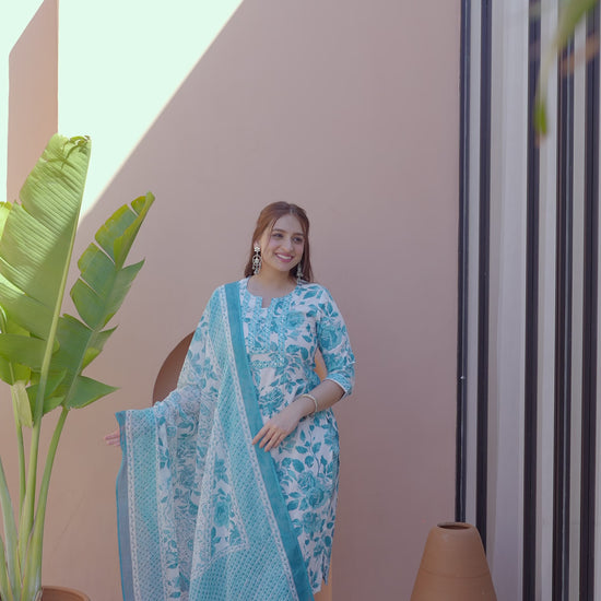 This Blue Straight kurta in soft Soft Cotton is a timeless pick for festive and casual wear. Designed with a Round neckline and 3/4 Sleeve sleeves, its graceful Calf Length cut flatters all body types. The delicate Floral detailing adds a touch of sophistication. Pair it with statement earrings and juttis for a polished look. Maintain its pristine look by following proper care instructions.
