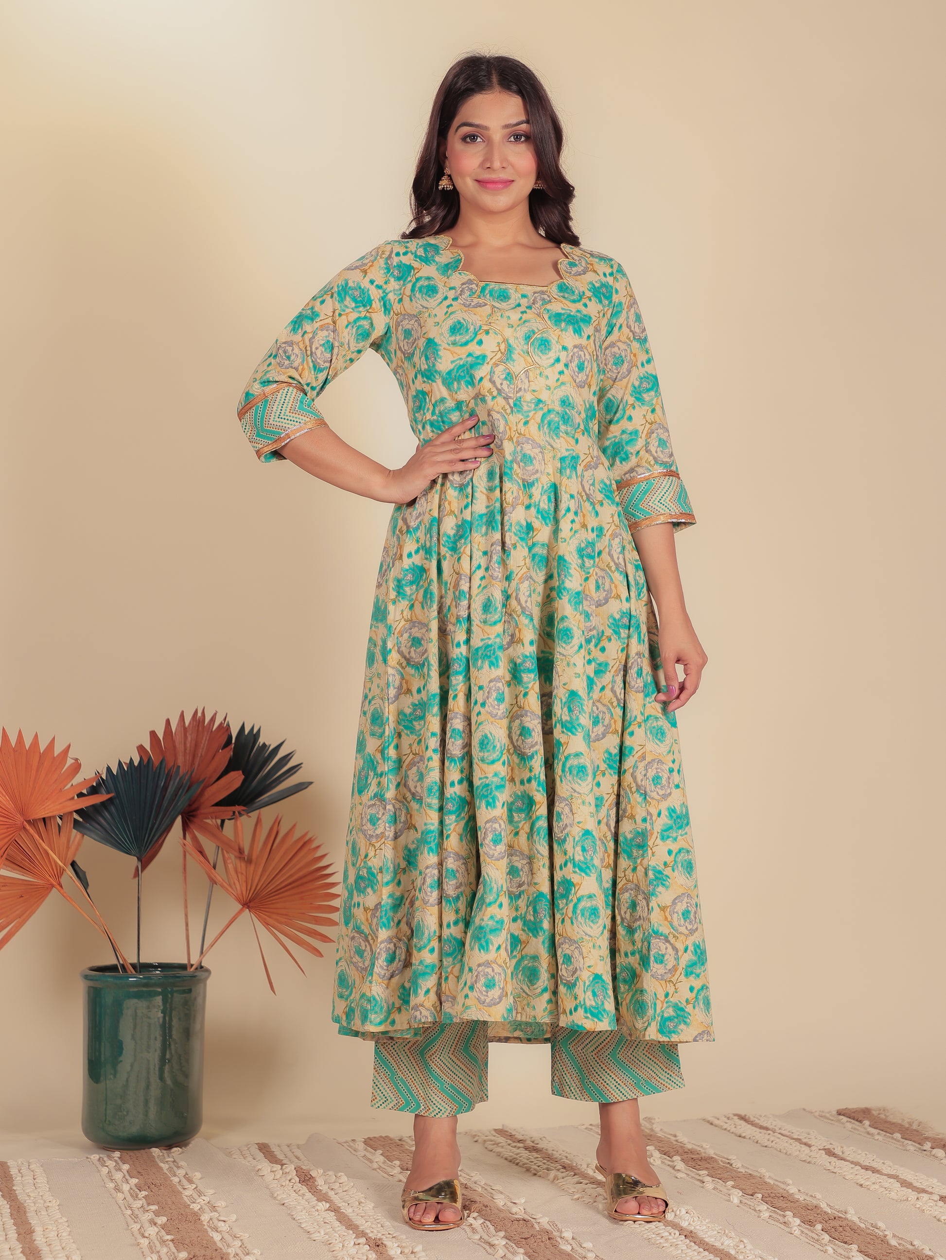 Embroidered Soft Cotton Floral Flared Blue Kurta