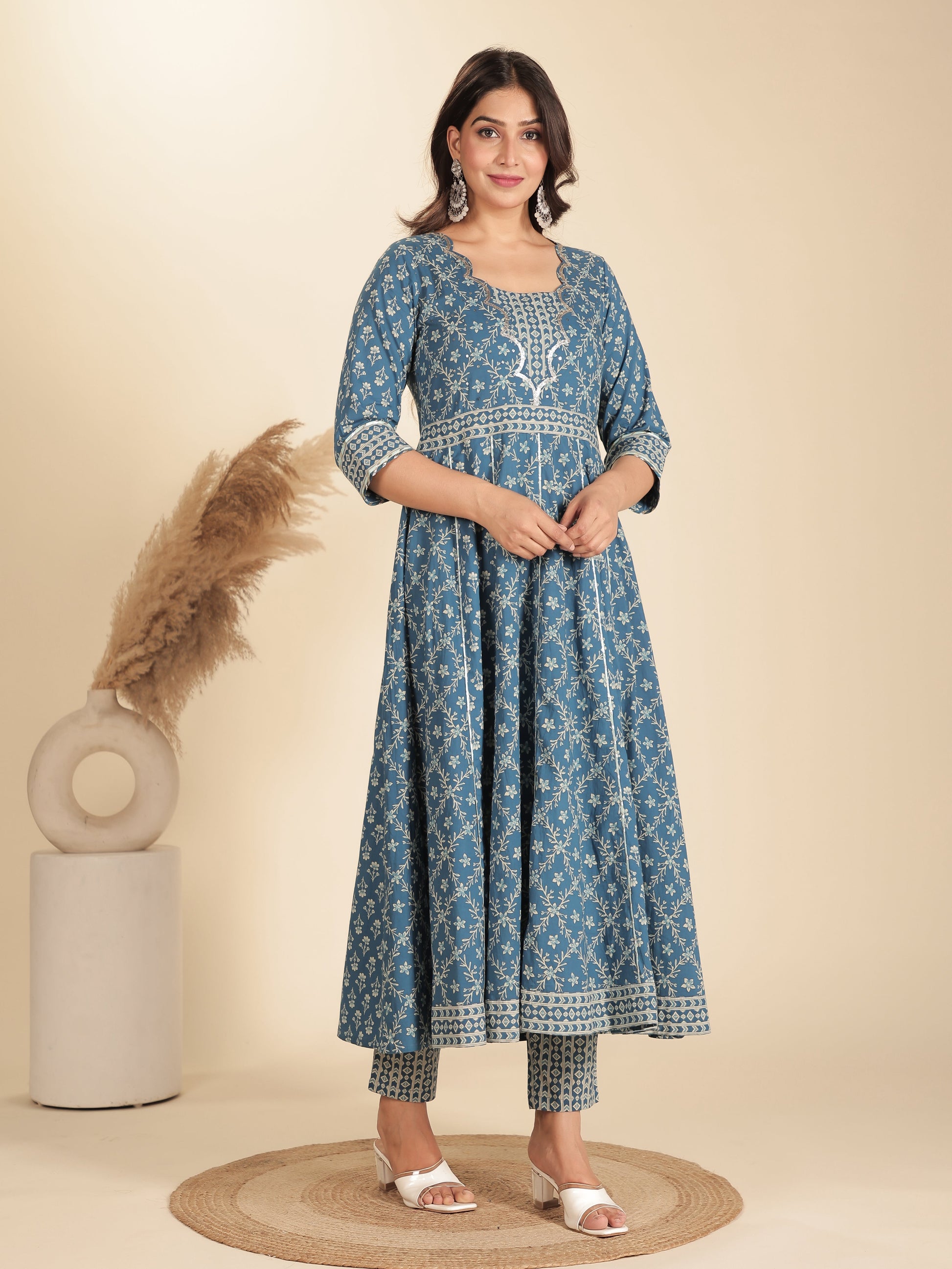 Soft Cotton Floral Flared Blue Kurta
