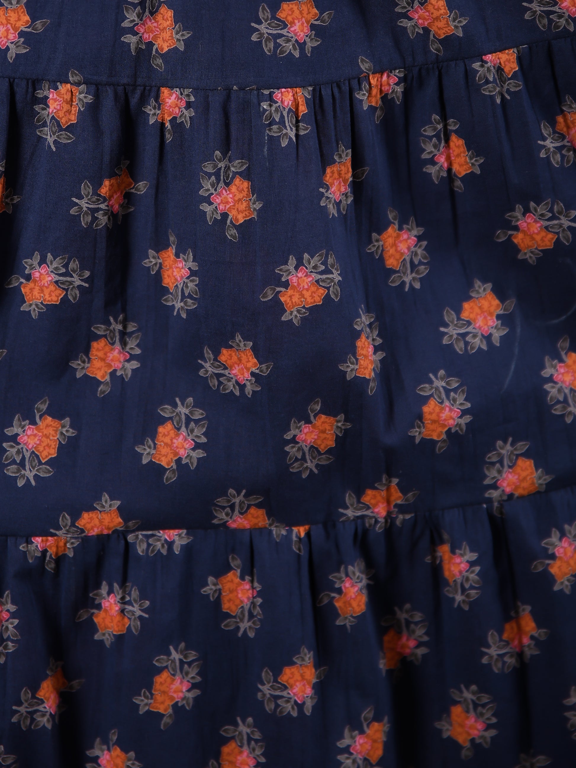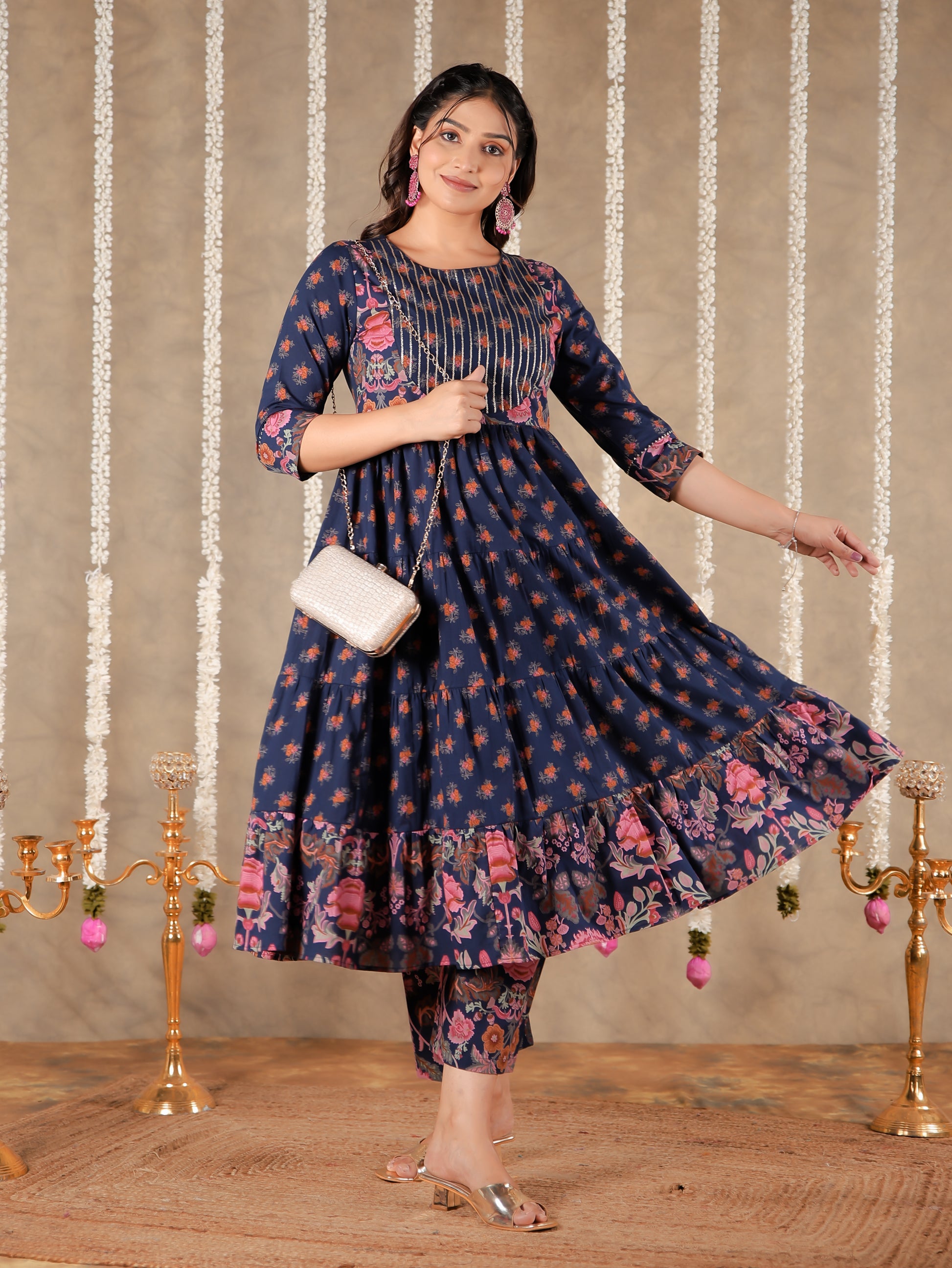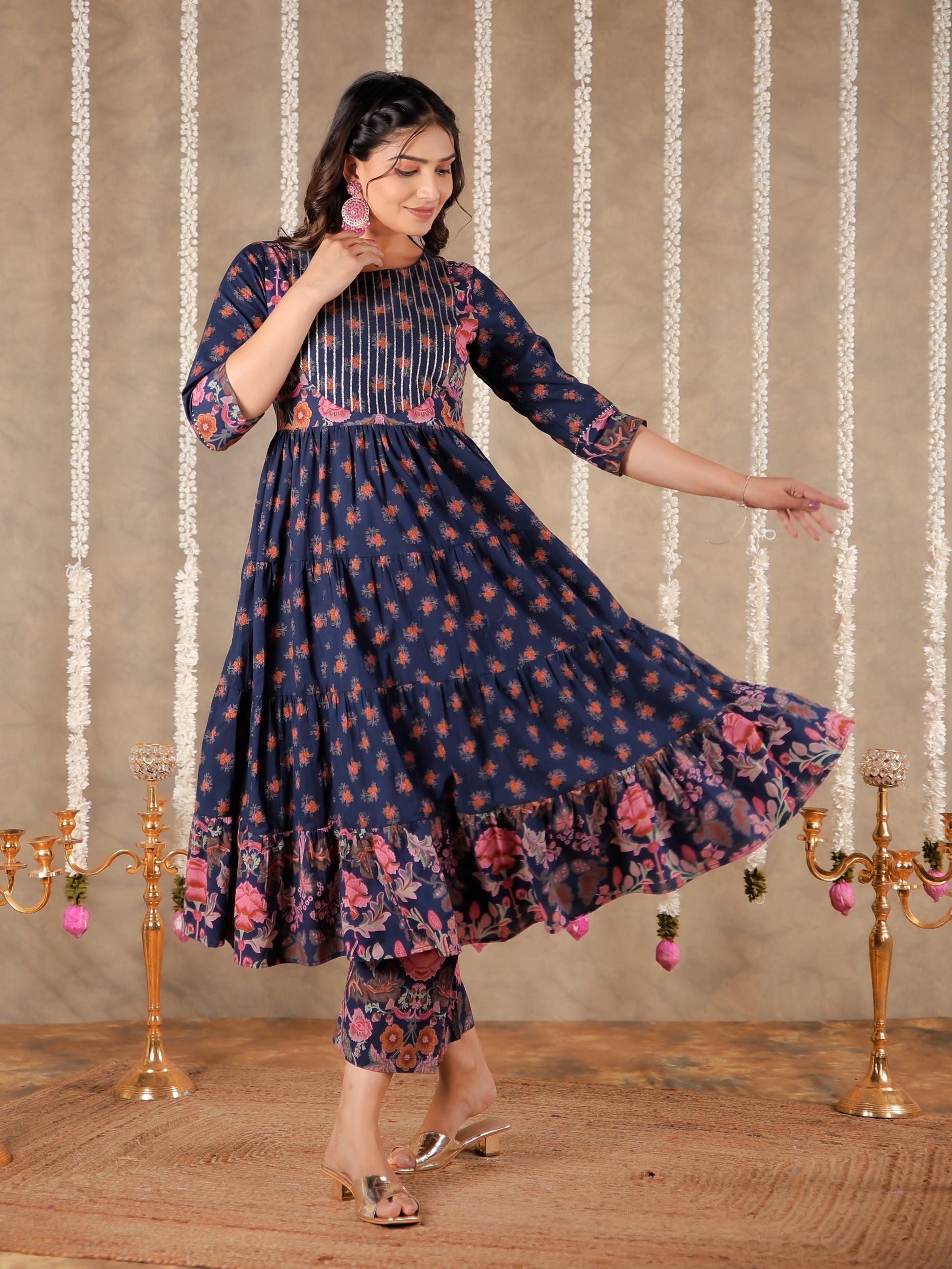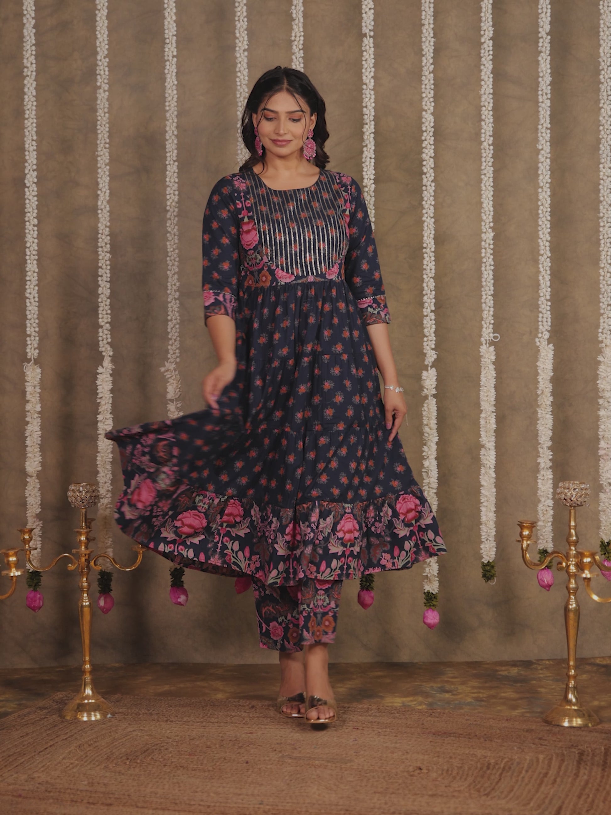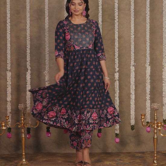 Embroidered Soft Cotton Floral Anarkali Navy Blue Kurta