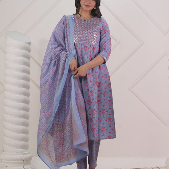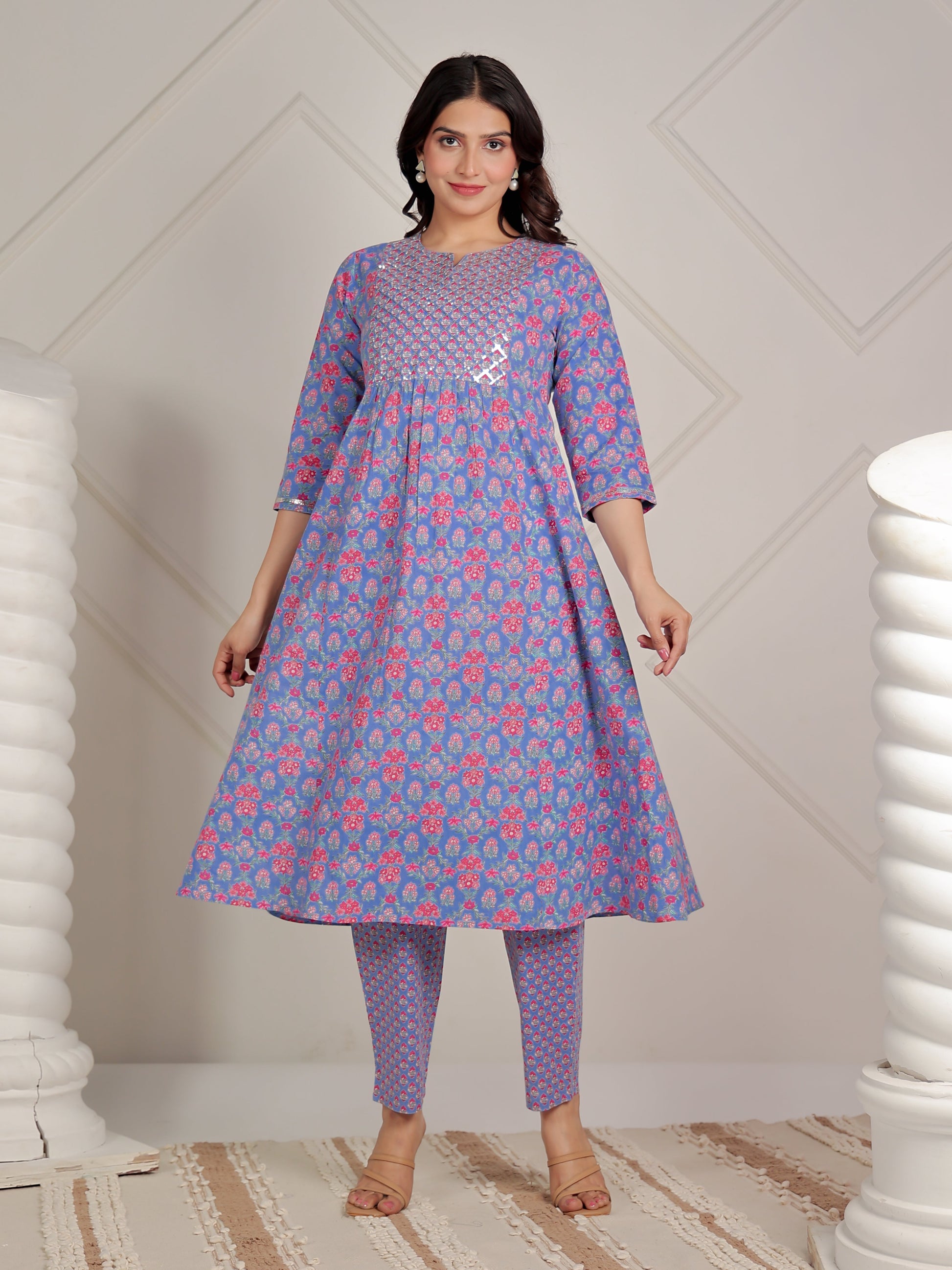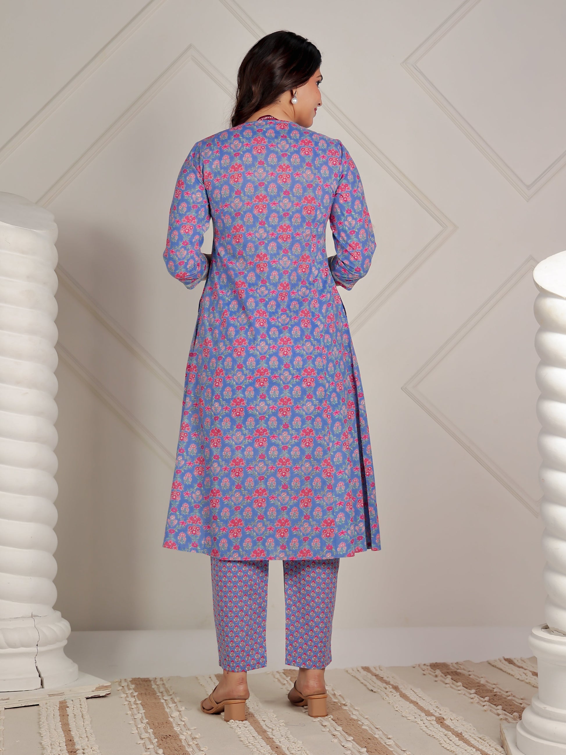 Embroidered Soft Cotton Floral Panelled Blue Kurta