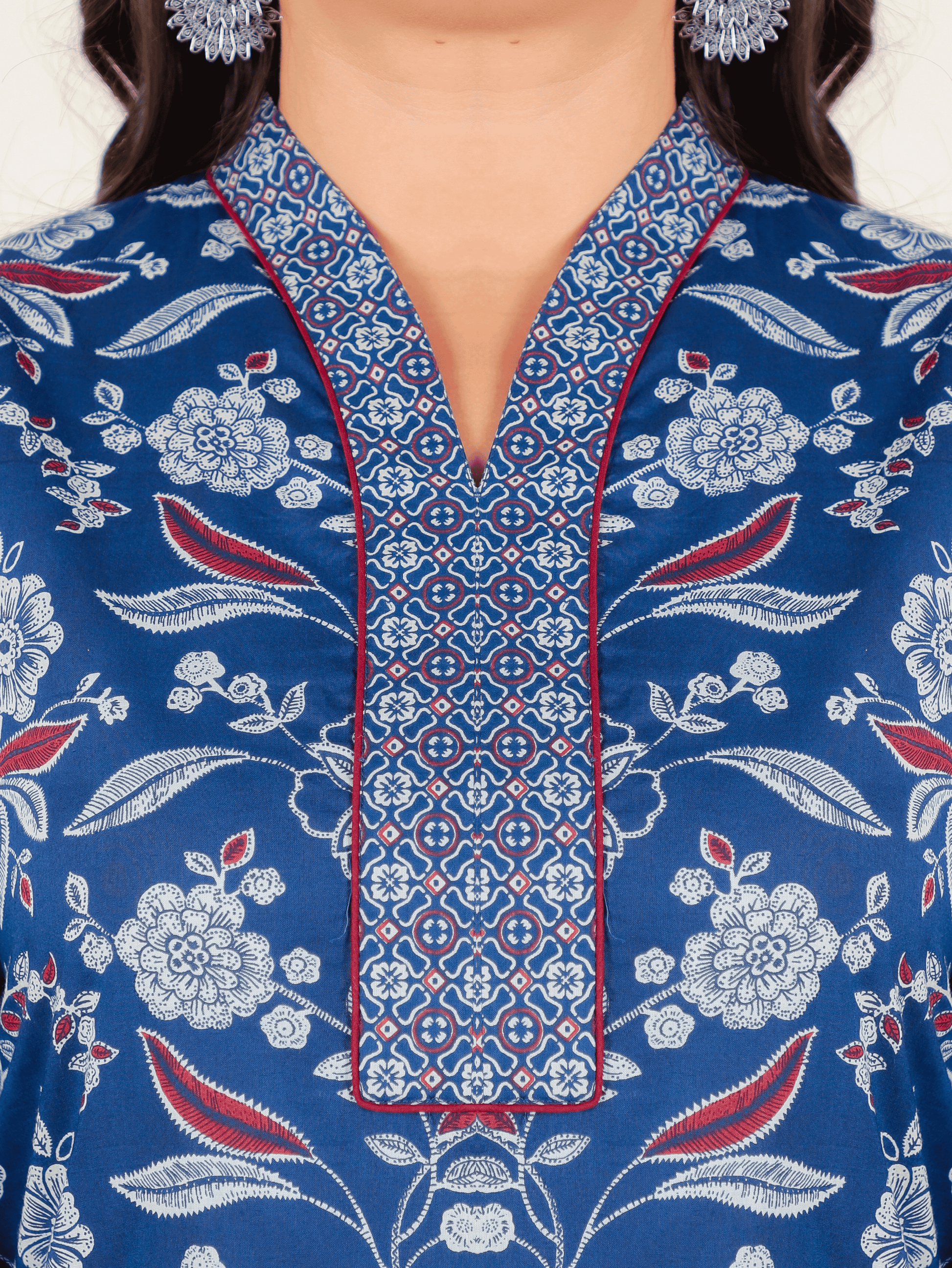 Elevate your ethnic wardrobe with this Soft Cotton kurta in a stunning Royal Blue hue. Featuring an elegant Straight fit and striking Floral accents, it’s perfect for festive celebrations or family gatherings. The V neckline and 3/4 Sleeve provide all-day comfort. Team with gold-toned accessories for an effortlessly chic vibe. Maintain its charm by following proper care instructions.