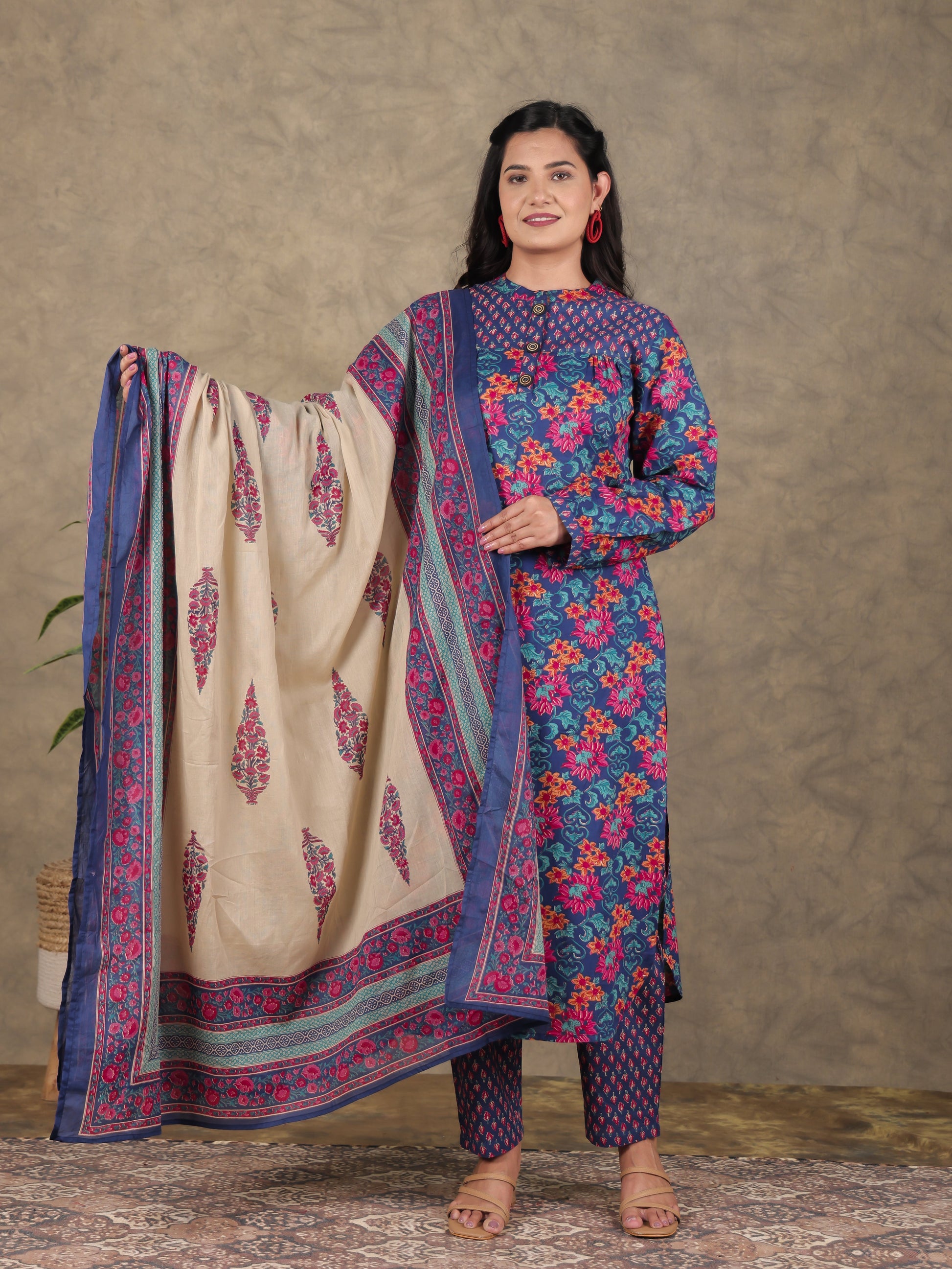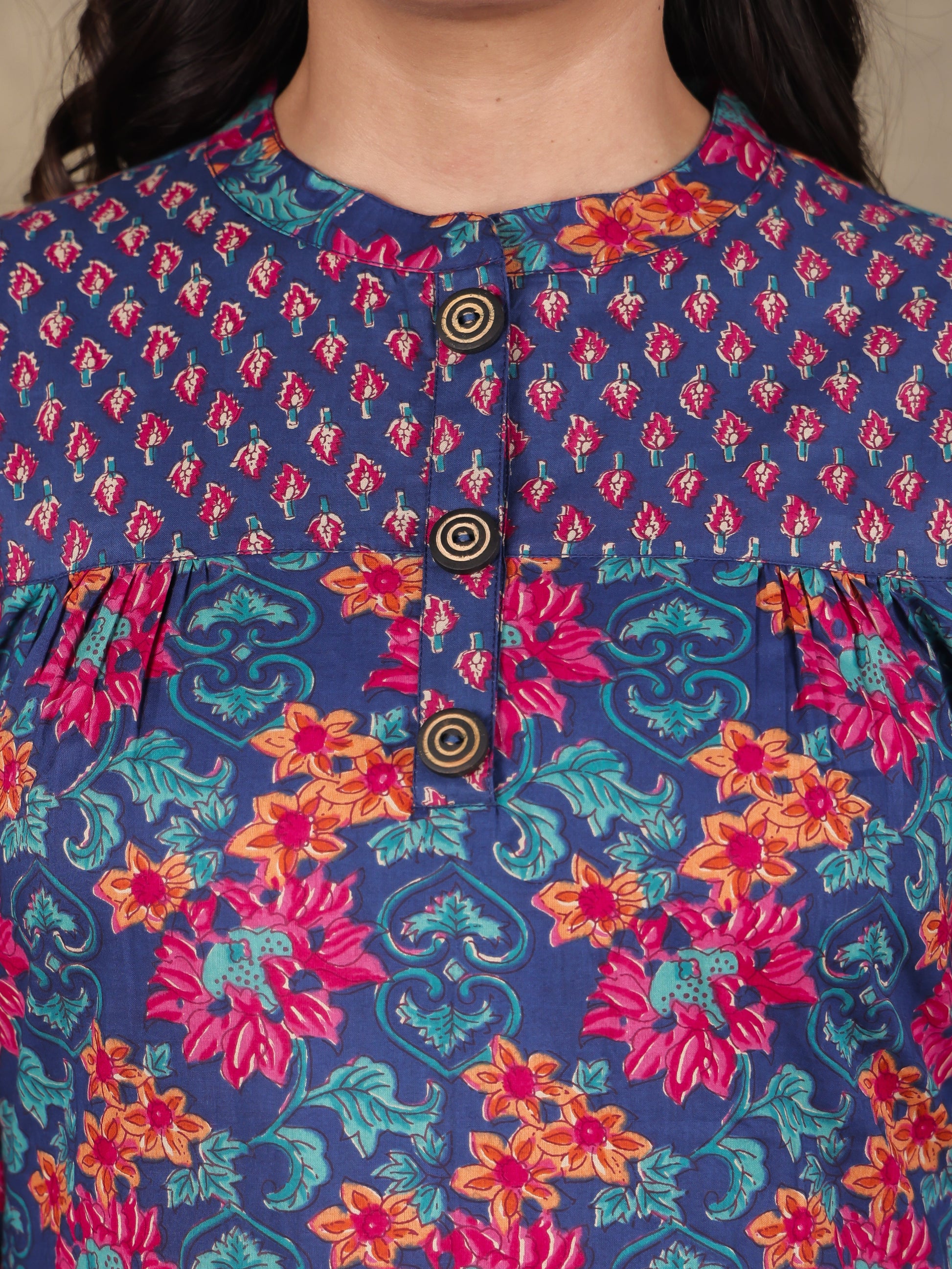 Crafted from breathable Soft Cotton, this Straight kurta in Blue blends traditional design with everyday comfort. The Floral finish adds artisanal charm, while the Calf Length silhouette ensures effortless elegance. Style with palazzos or leggings for versatile looks, from workdays to weekend outings. Designed for easy care, this kurta stays beautiful with simple care instructions.