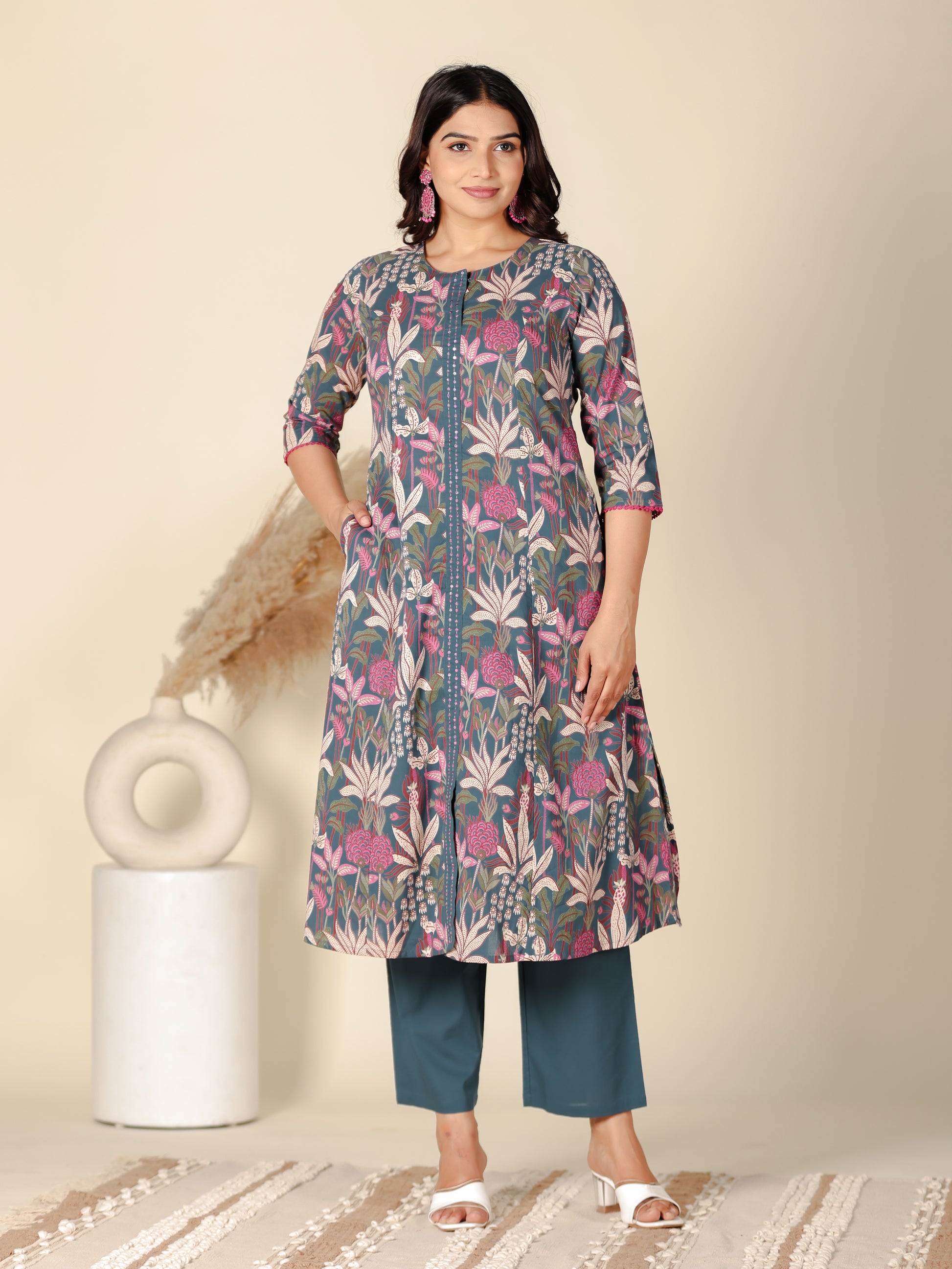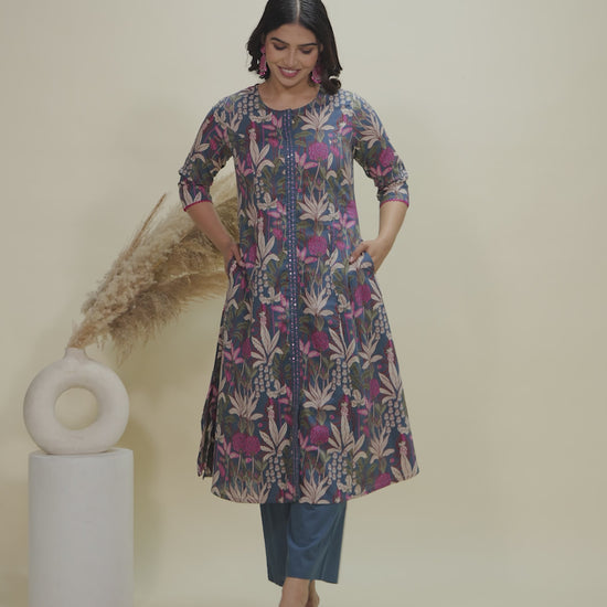 This Teal A-line kurta in soft Soft Cotton is a timeless pick for festive and casual wear. Designed with a Round neckline and 3/4 Sleeve sleeves, its graceful Calf Length cut flatters all body types. The delicate Foliage detailing adds a touch of sophistication. Pair it with statement earrings and juttis for a polished look. Maintain its pristine look by following proper care instructions.