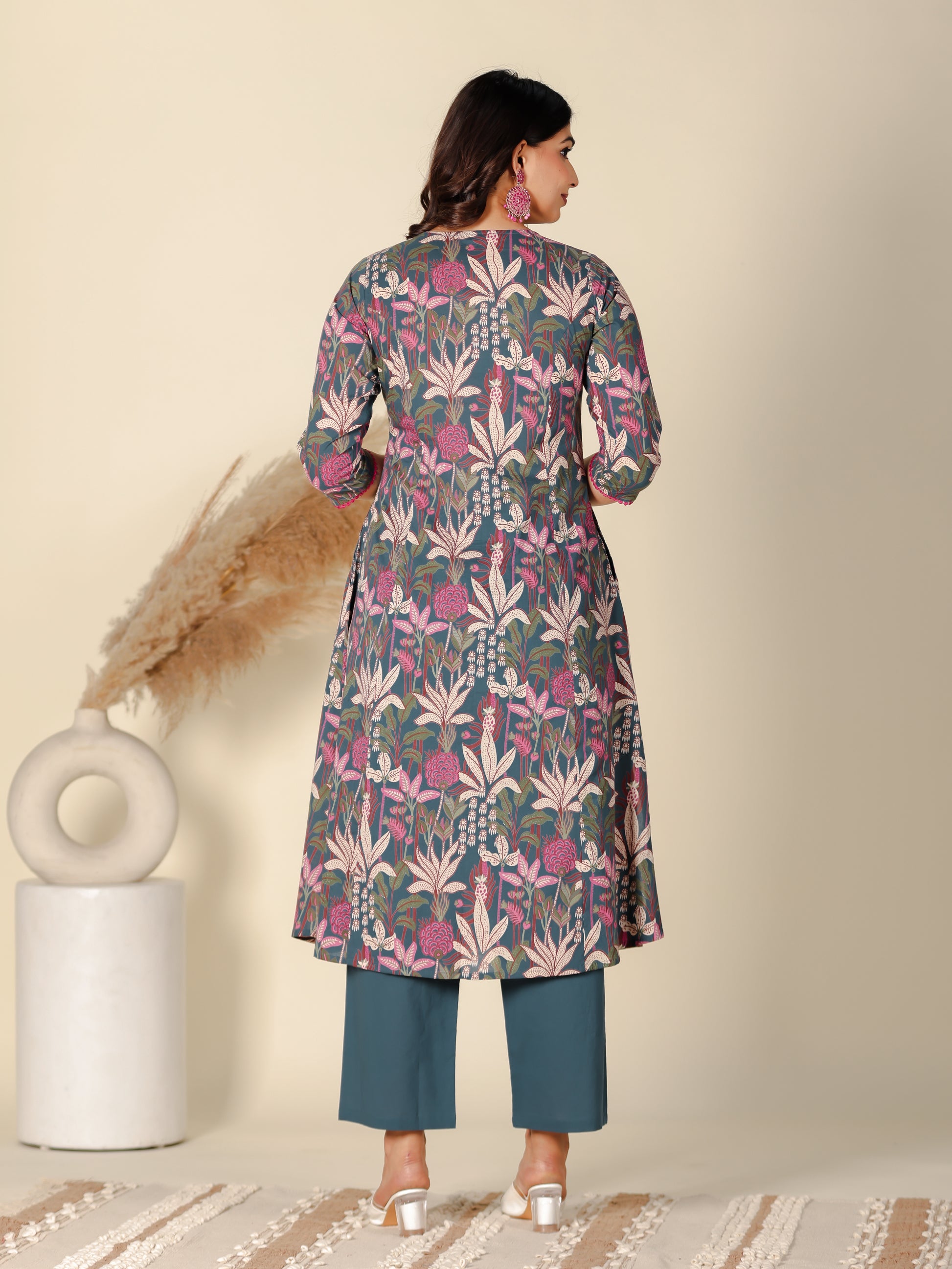 Embroidered Soft Cotton Foliage A-line Teal Kurta