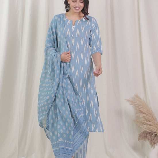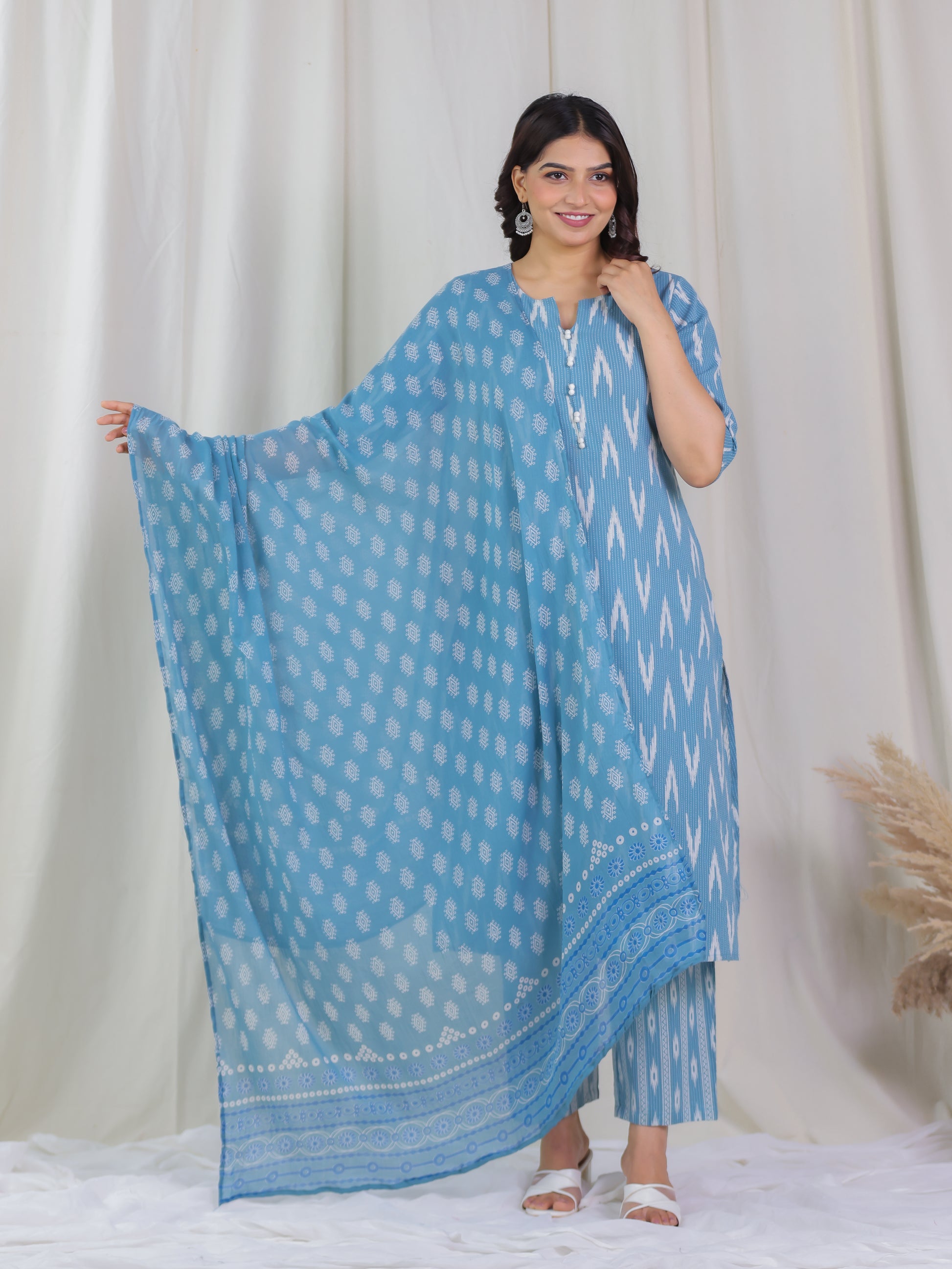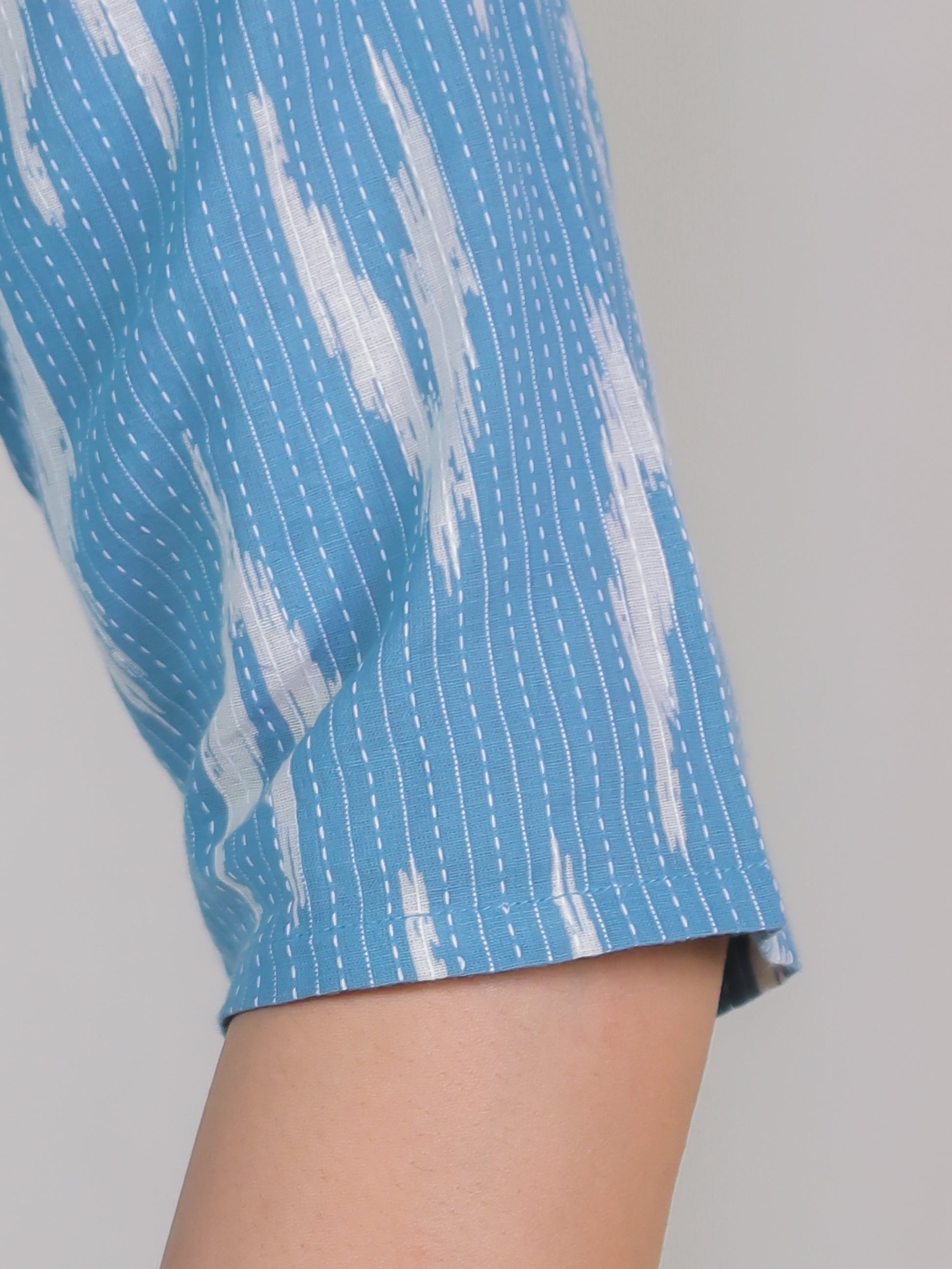 Elevate your ethnic wardrobe with this Kantha Cotton kurta in a stunning Blue hue. Featuring an elegant A-line fit and striking Ikat accents, it’s perfect for festive celebrations or family gatherings. The Round neckline and 3/4 Sleeve provide all-day comfort. Team with gold-toned accessories for an effortlessly chic vibe. Maintain its charm by following proper care instructions.