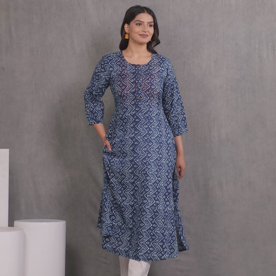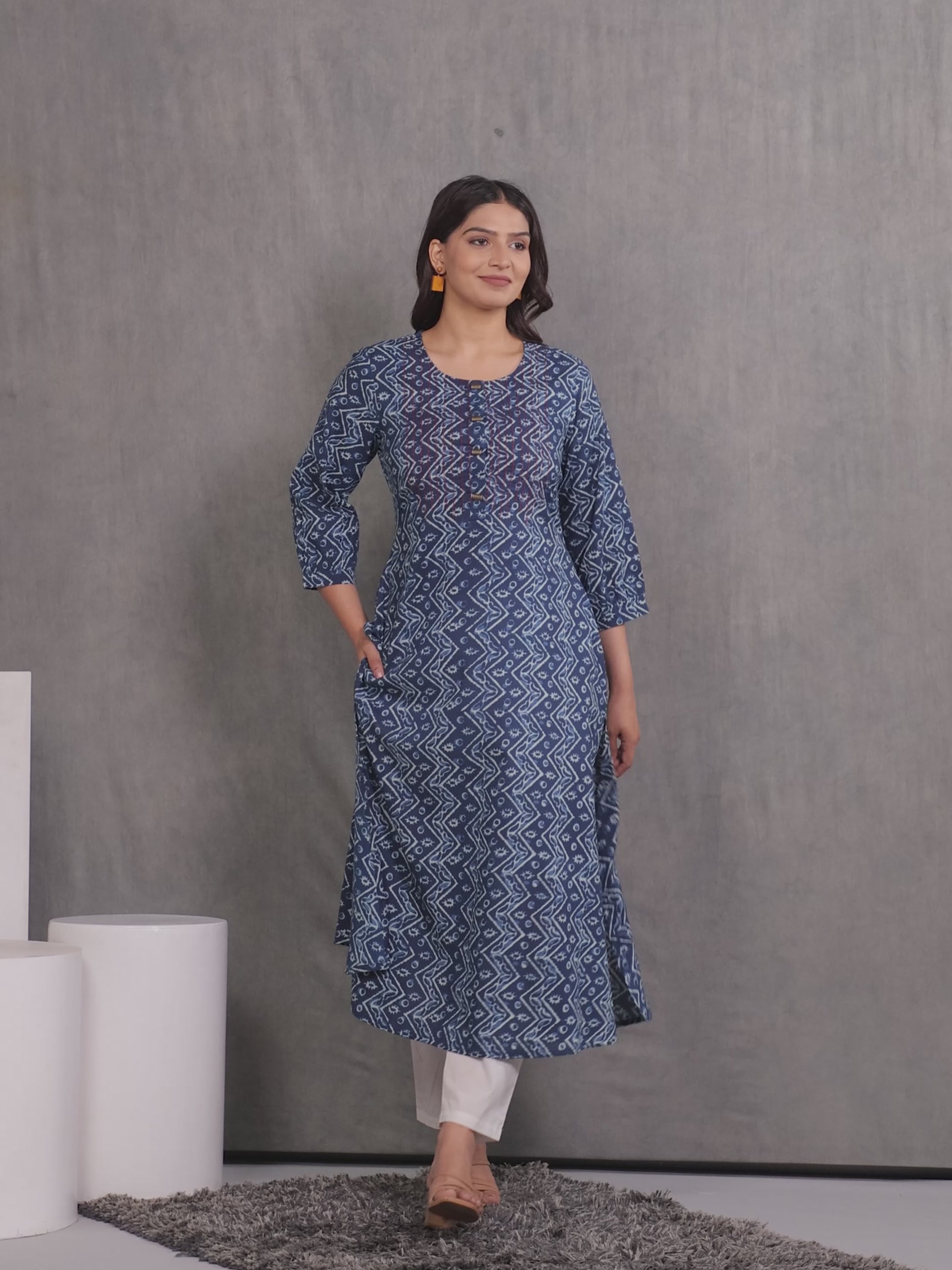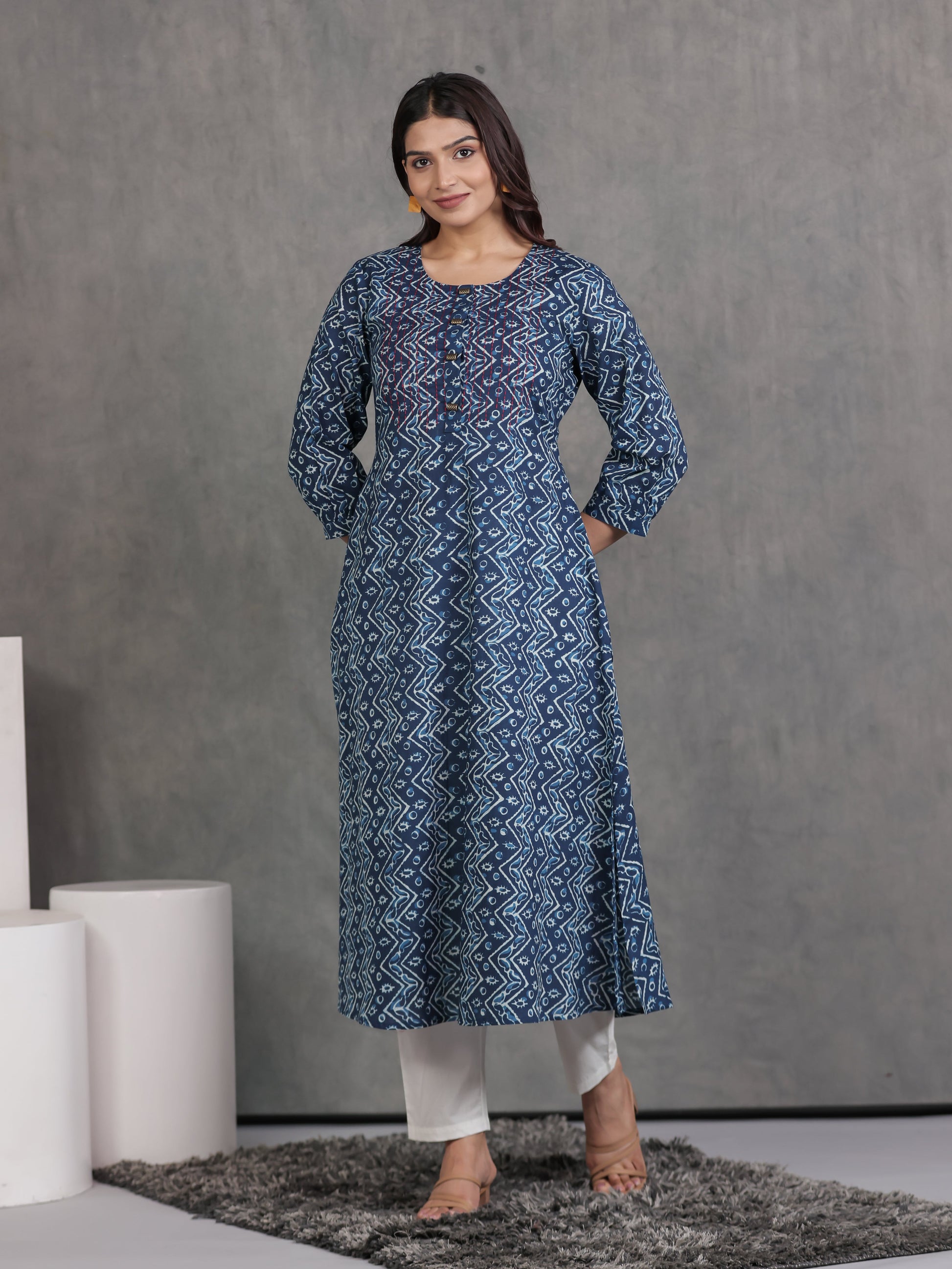 Embroidered Soft Cotton Geometric A-line Blue Kurta