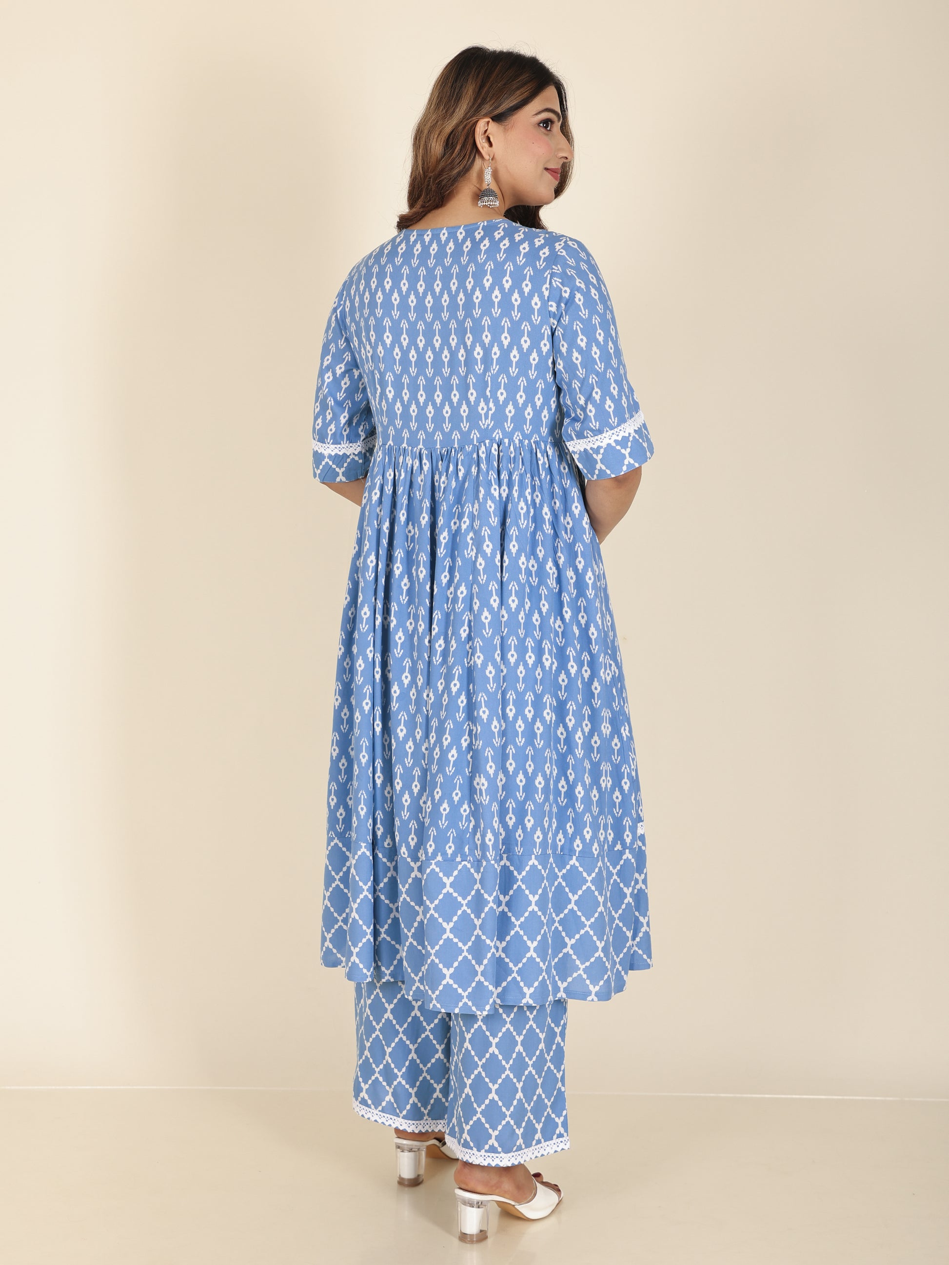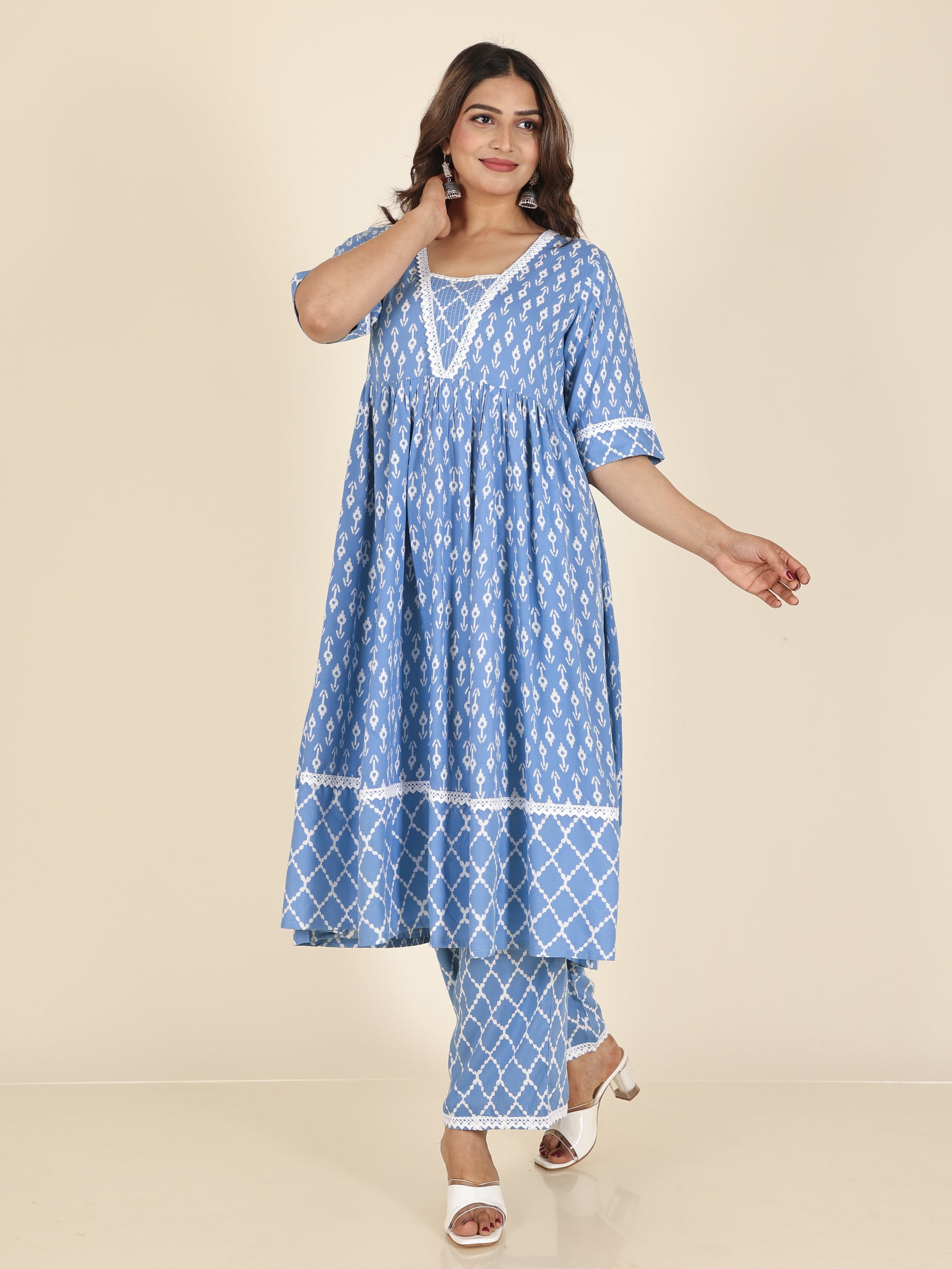 This Blue Anarkali kurta in soft Viscose is a timeless pick for festive and casual wear. Designed with a Square neckline and Full Sleeve sleeves, its graceful Calf Length cut flatters all body types. The delicate Ikat detailing adds a touch of sophistication. Pair it with statement earrings and juttis for a polished look. Maintain its pristine look by following proper care instructions.