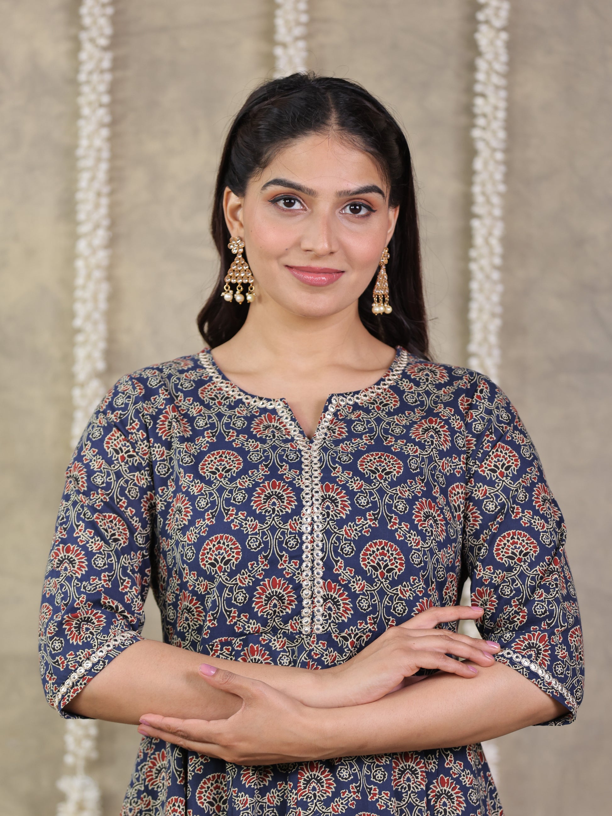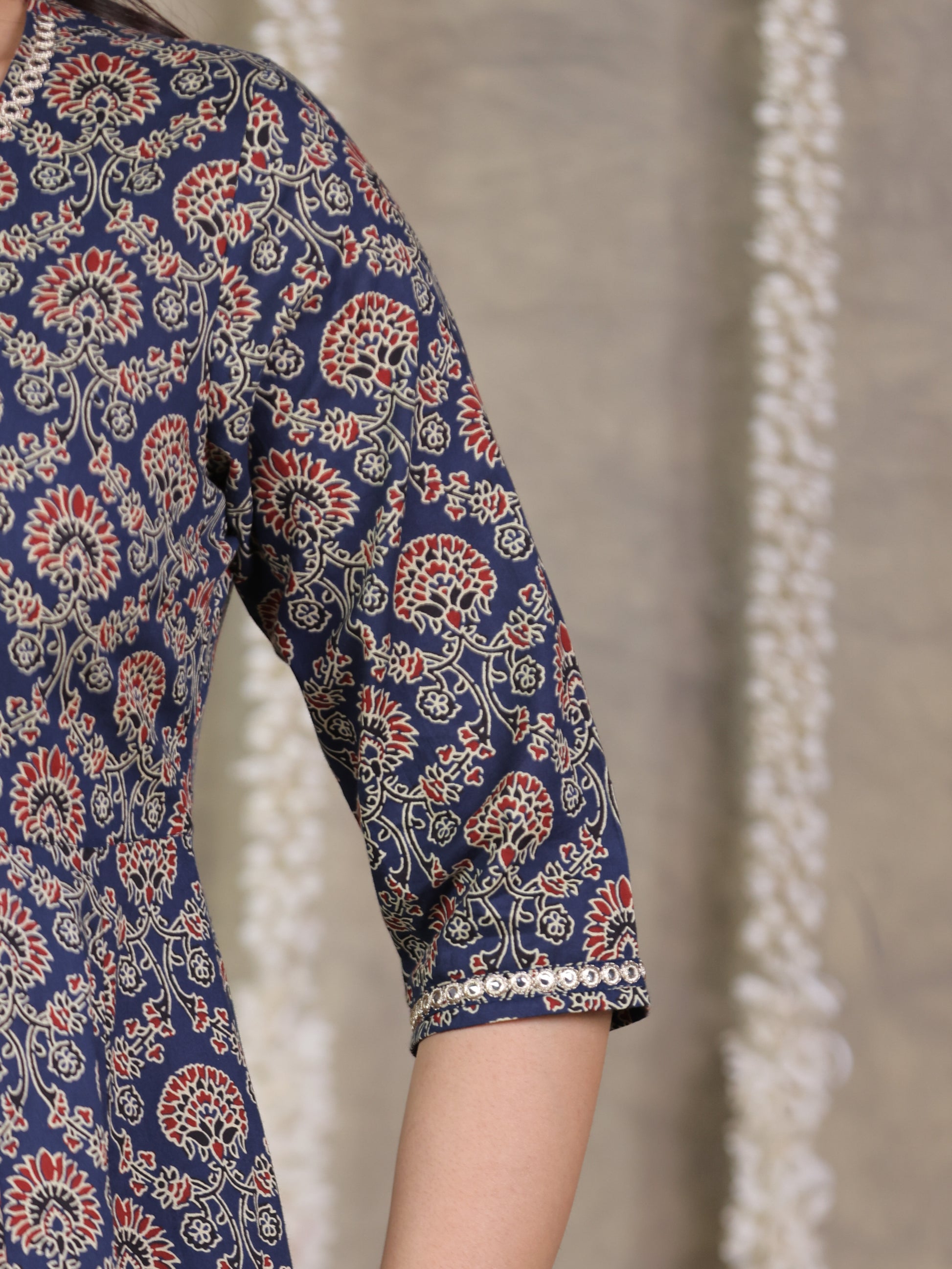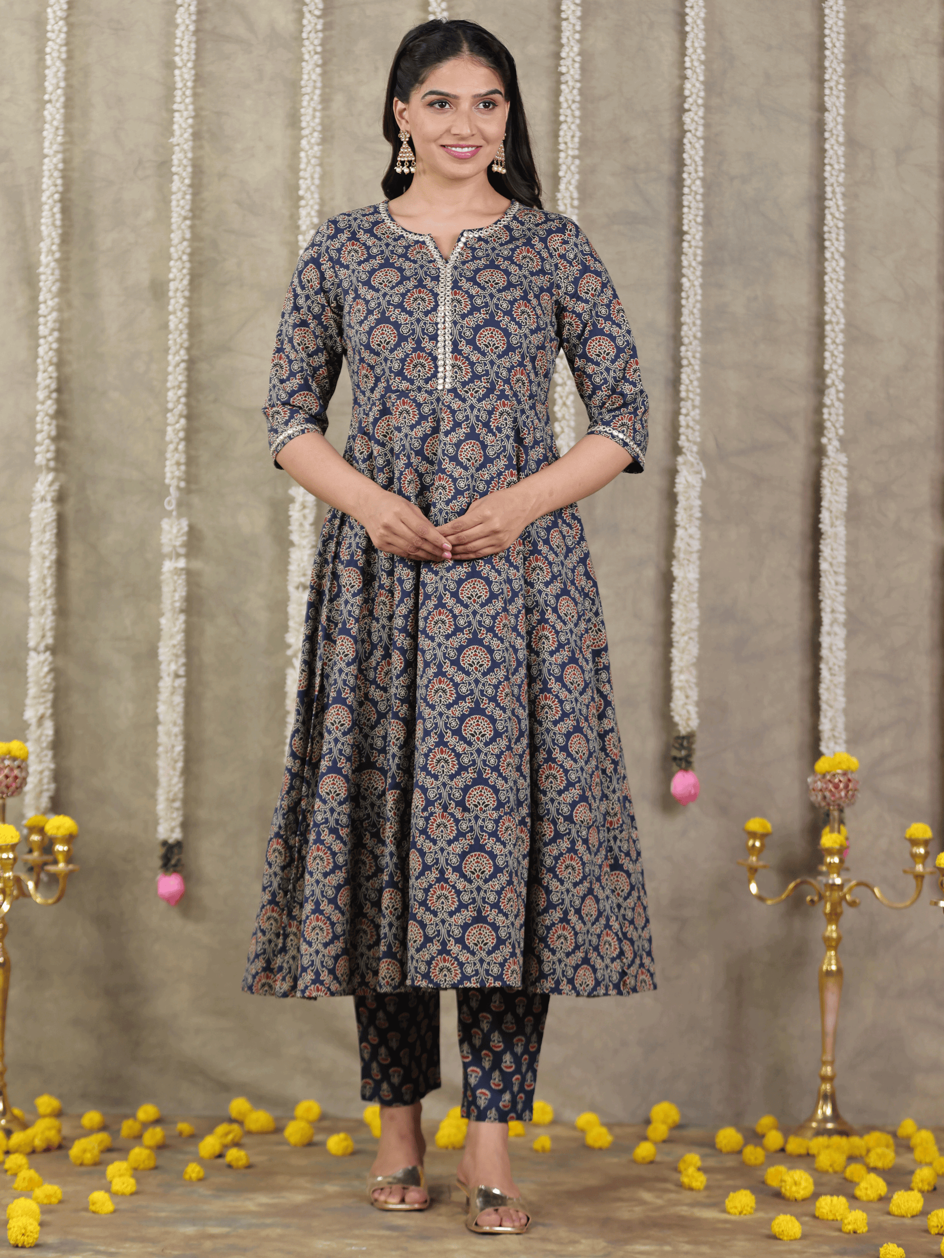 Embroidered Soft Cotton Geometric Anarkali Blue Kurta