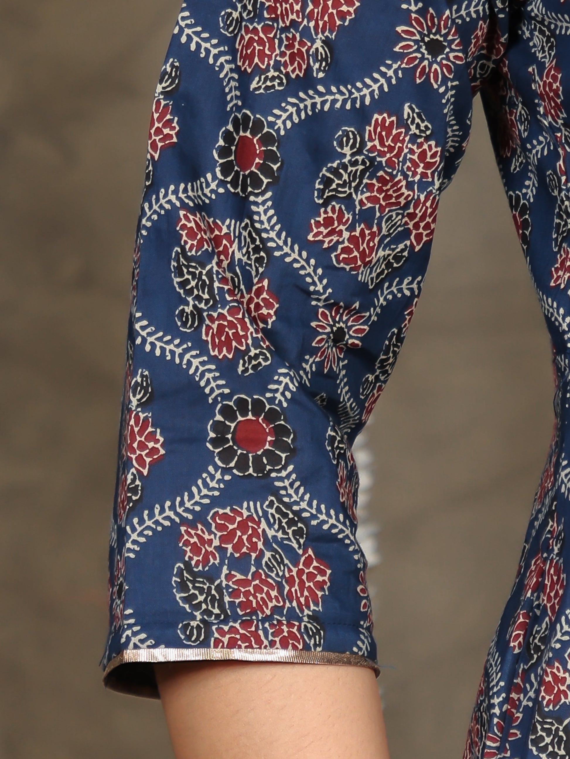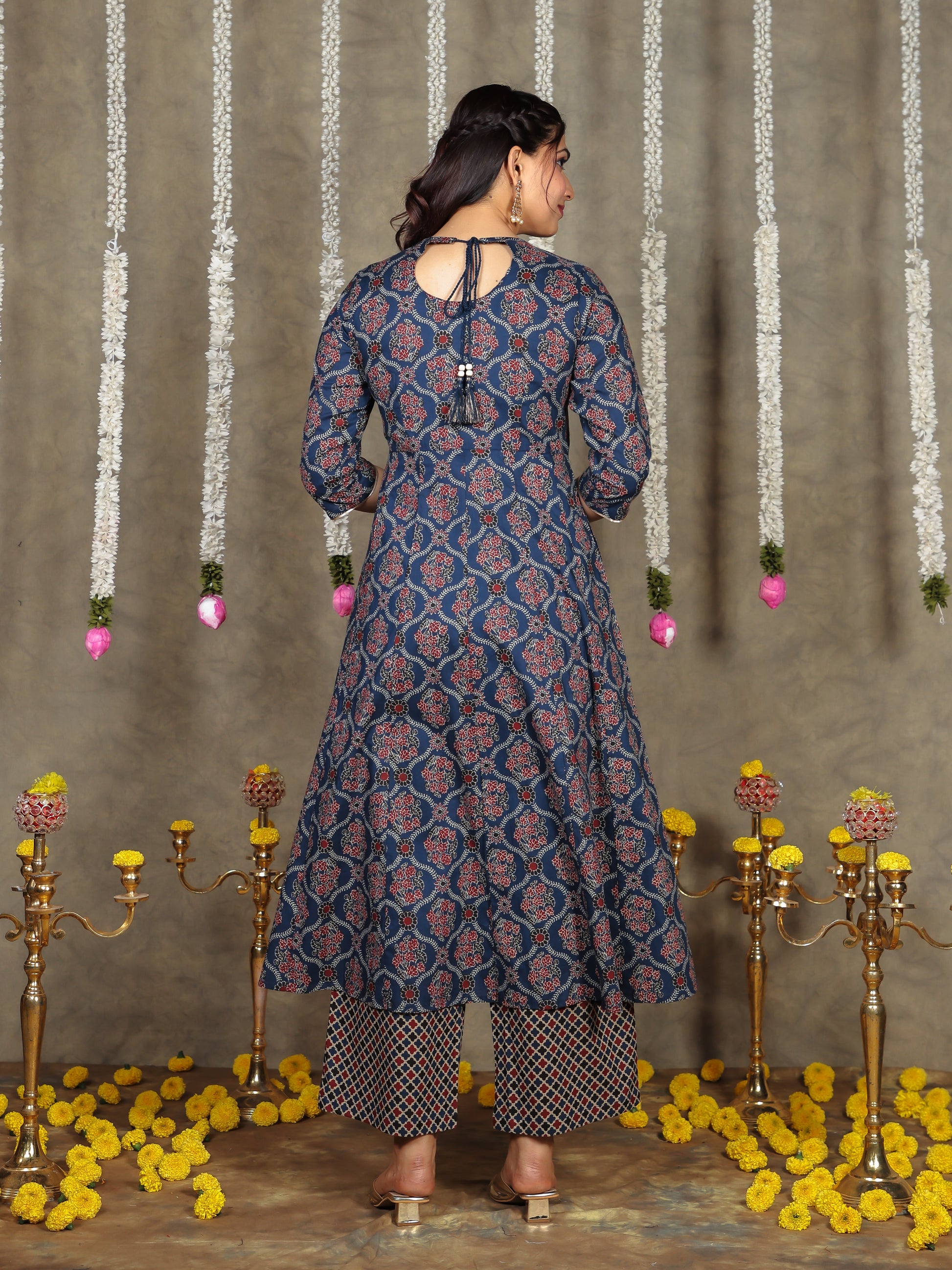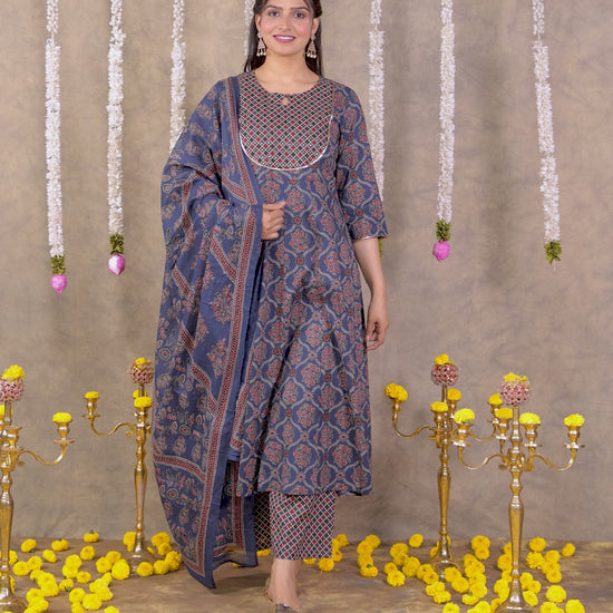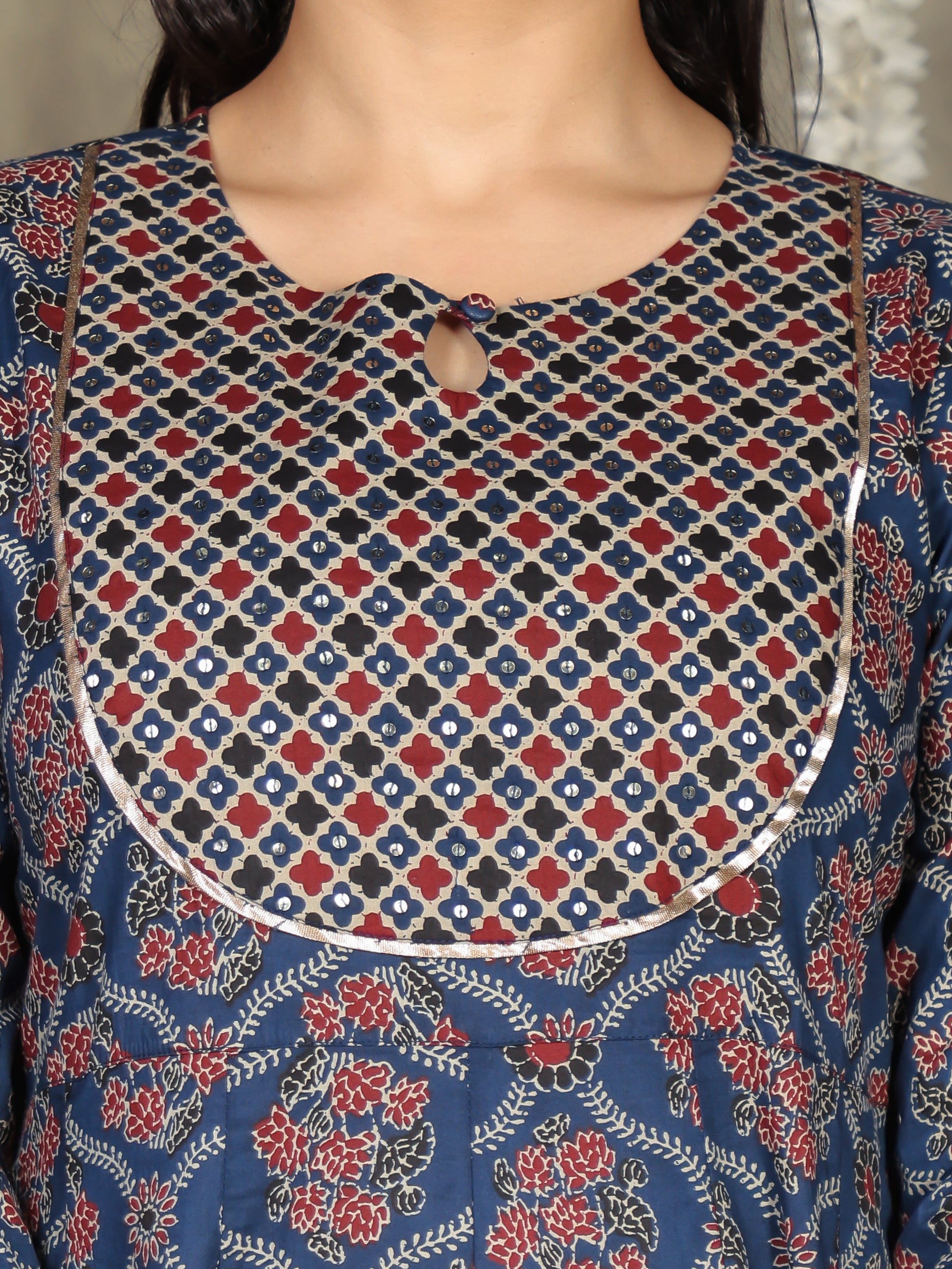 This Blue Anarkali kurta in soft Soft Cotton is a timeless pick for festive and casual wear. Designed with a Keyhole neckline and 3/4 Sleeve sleeves, its graceful Calf Length cut flatters all body types. The delicate Geometric detailing adds a touch of sophistication. Pair it with statement earrings and juttis for a polished look. Maintain its pristine look by following proper care instructions.