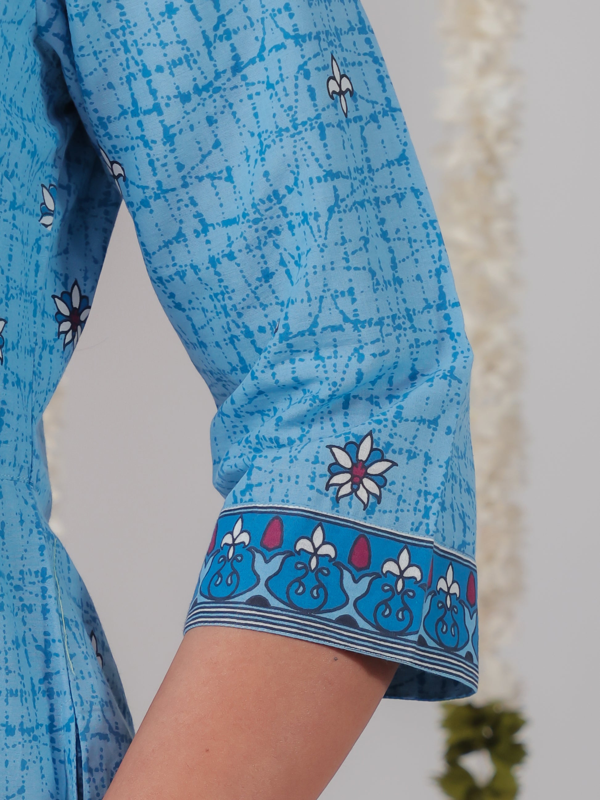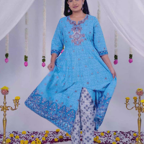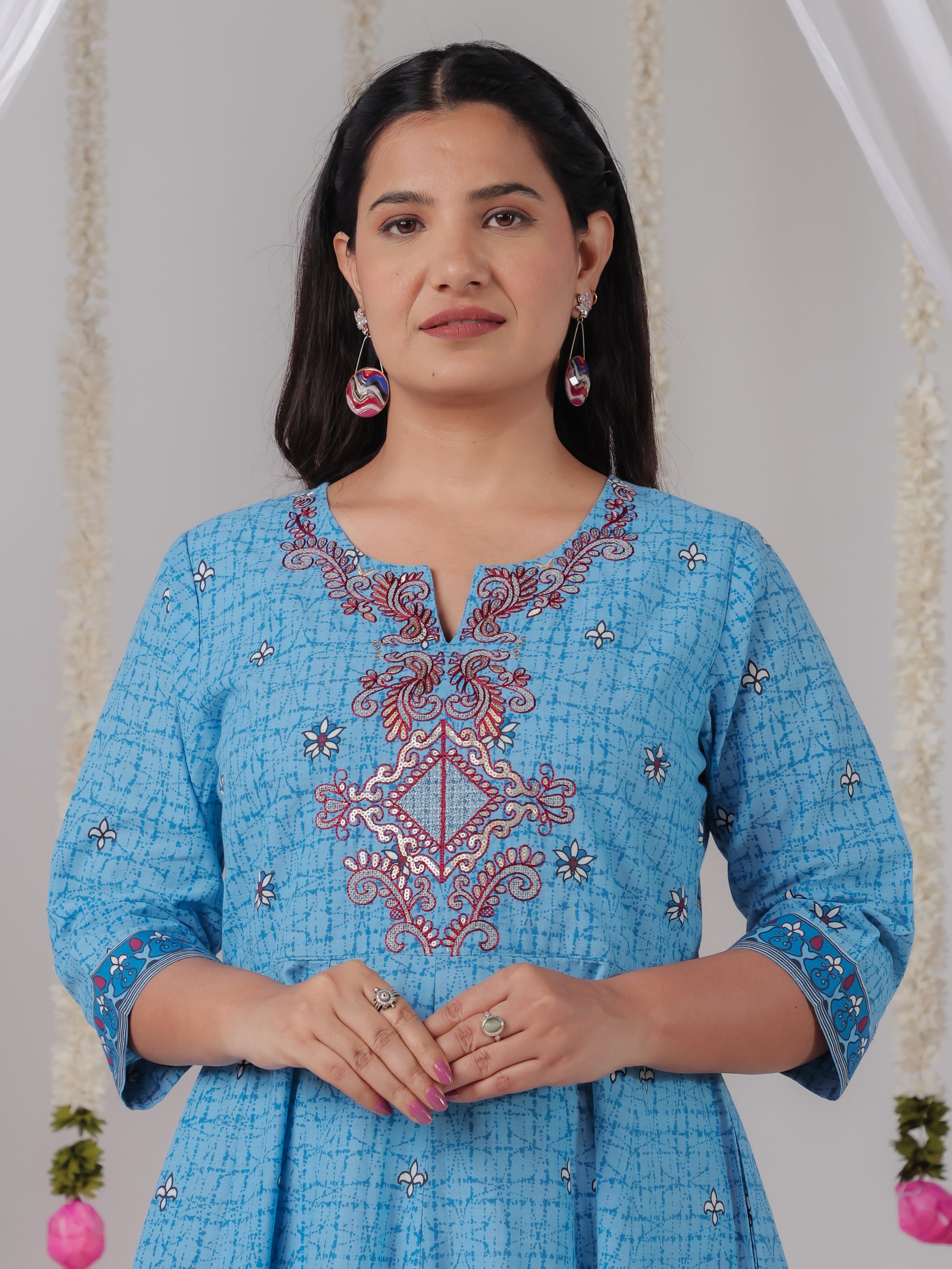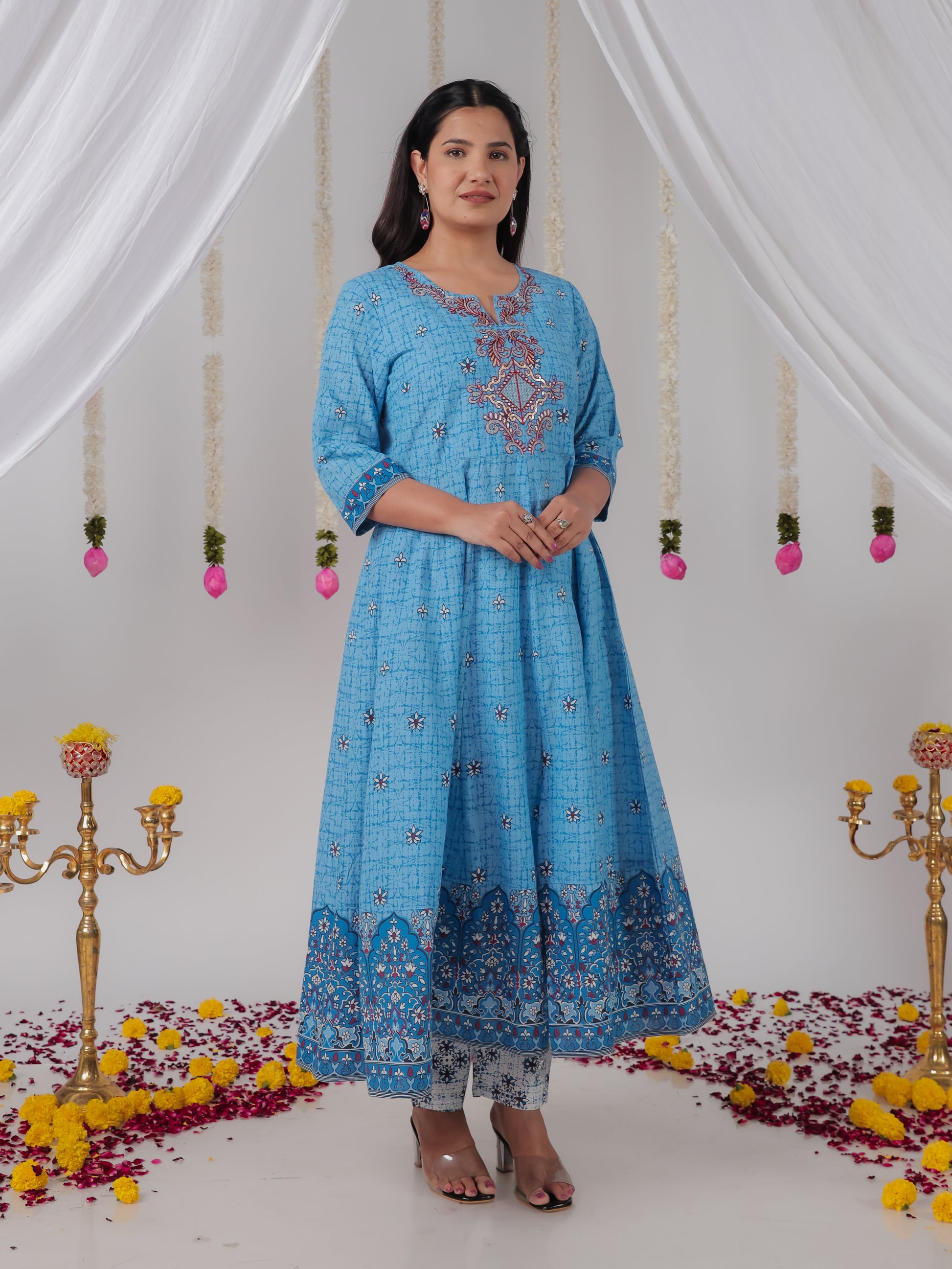 Embroidered Soft Cotton Geometric Anarkali Blue Kurta