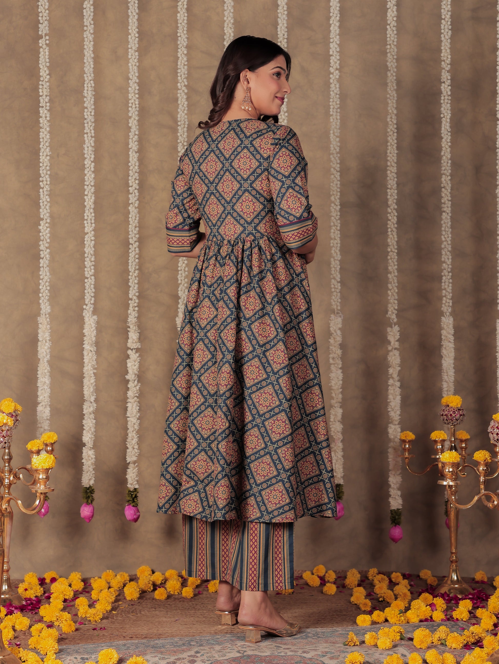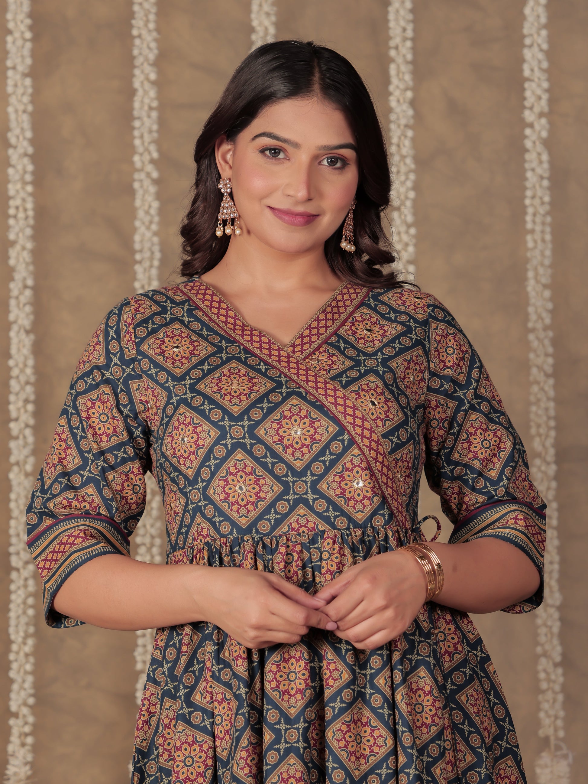 This Blue Angrakha kurta in soft Soft Cotton is a timeless pick for festive and casual wear. Designed with a V neckline and 3/4 Sleeve sleeves, its graceful Calf Length cut flatters all body types. The delicate Geometric detailing adds a touch of sophistication. Pair it with statement earrings and juttis for a polished look. Maintain its pristine look by following proper care instructions.