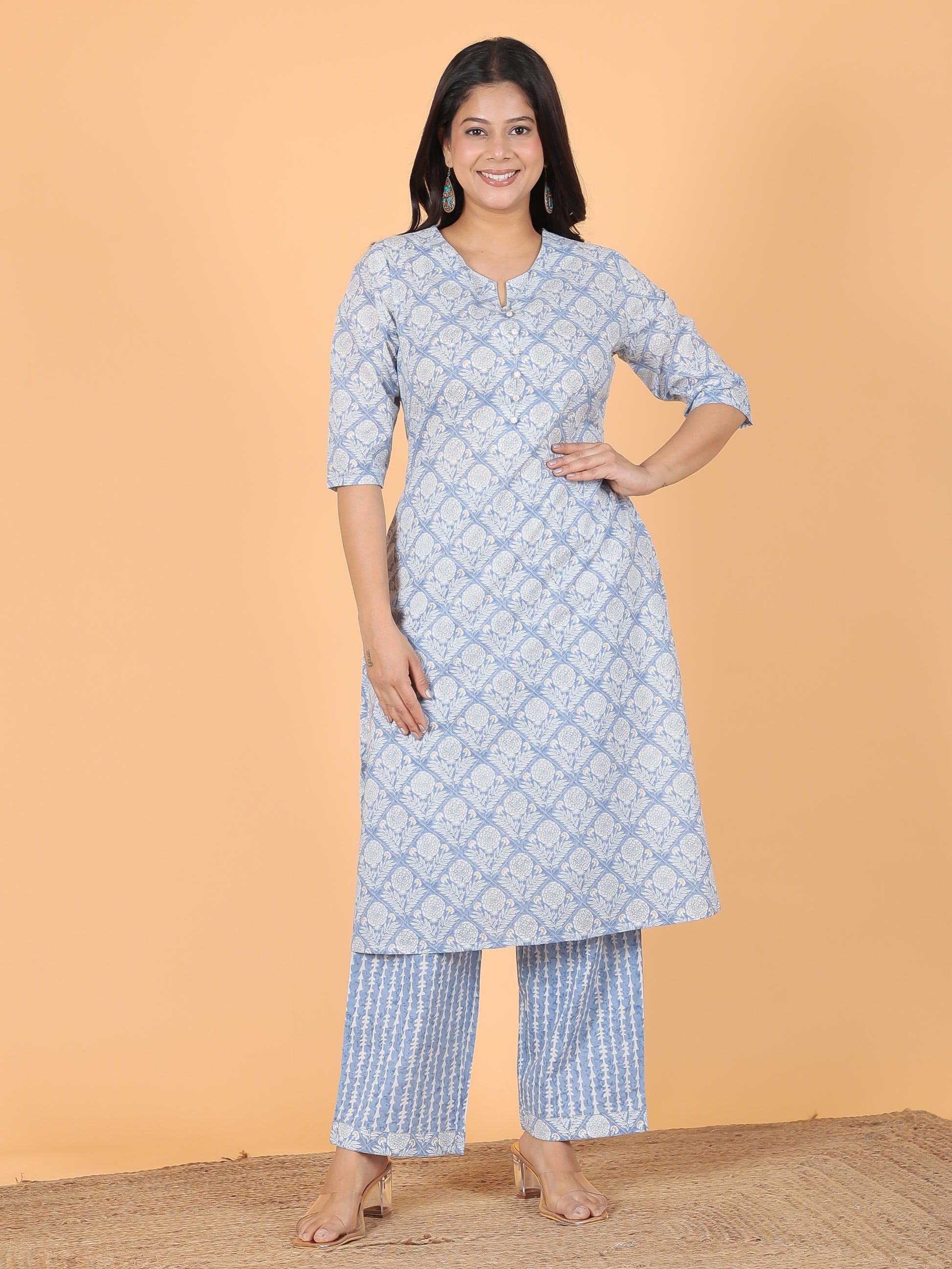 This Blue Soft Cotton kurta with a A-line flare is designed for comfort and style. Featuring a Round neckline, 3/4 Sleeve sleeves, and a graceful Calf Length hemline, it’s perfect for festive wear or semi-formal gatherings. The Gold foil highlights add depth and texture, making it a standout piece. Accessorise with a contrasting dupatta and keep it pristine by following proper care instructions.