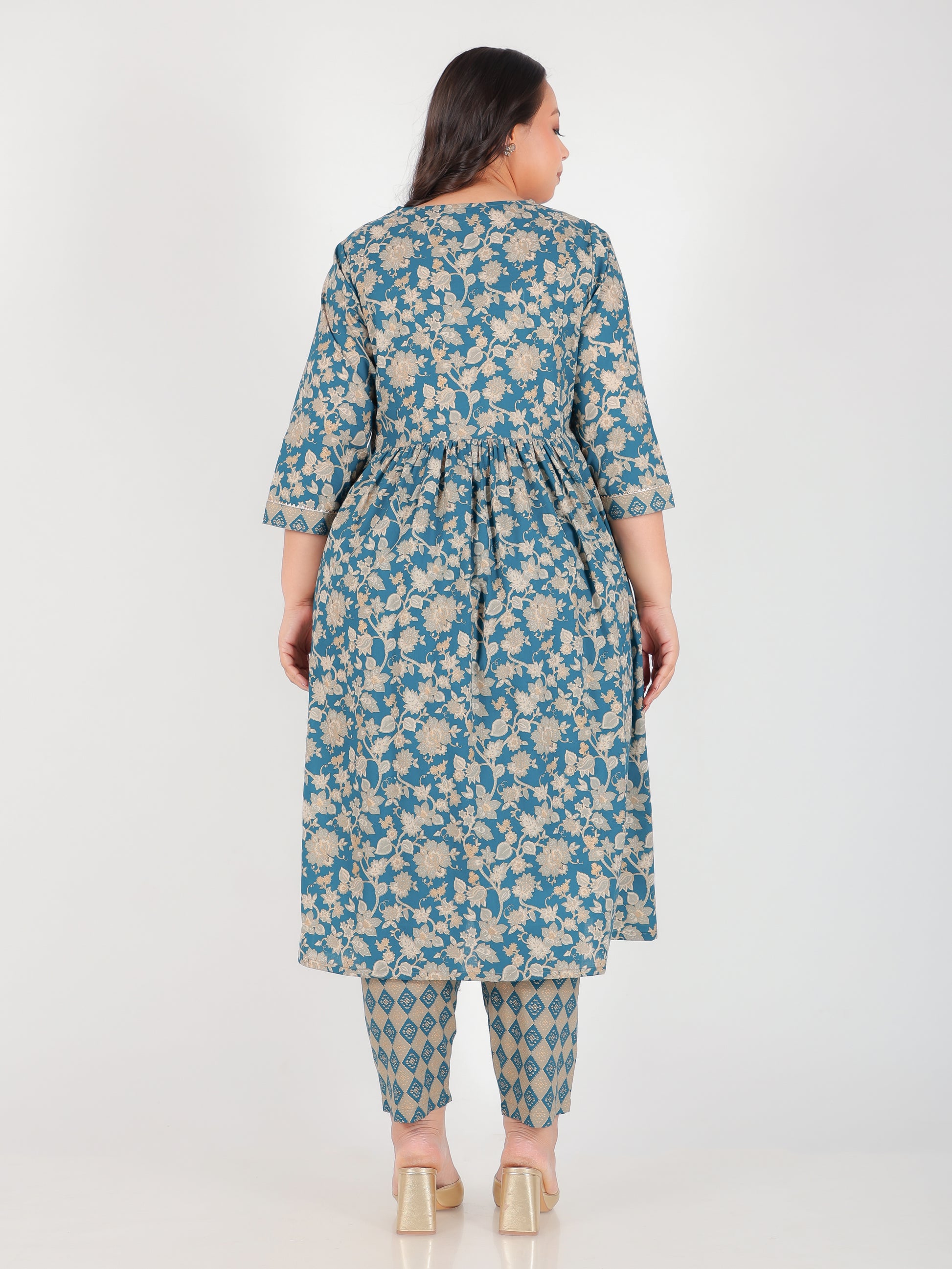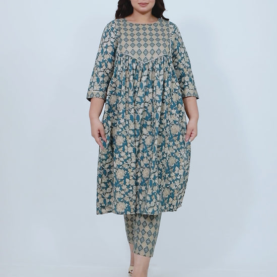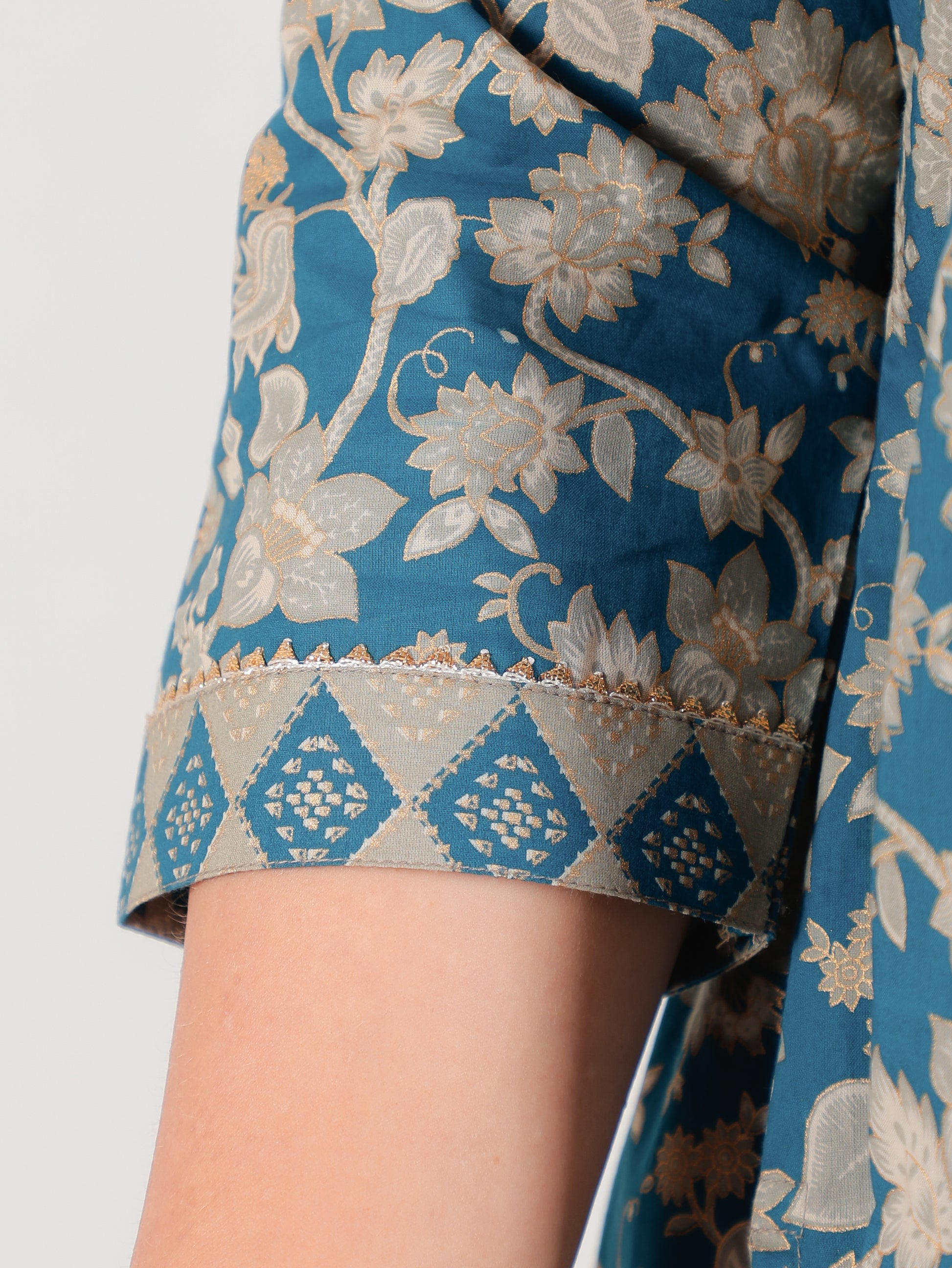 This Teal Soft Cotton kurta with a A-line flare is designed for comfort and style. Featuring a Round neckline, 3/4 Sleeve sleeves, and a graceful Calf Length hemline, it’s perfect for festive wear or semi-formal gatherings. The Gold foil highlights add depth and texture, making it a standout piece. Accessorise with a contrasting dupatta and keep it pristine by following proper care instructions.