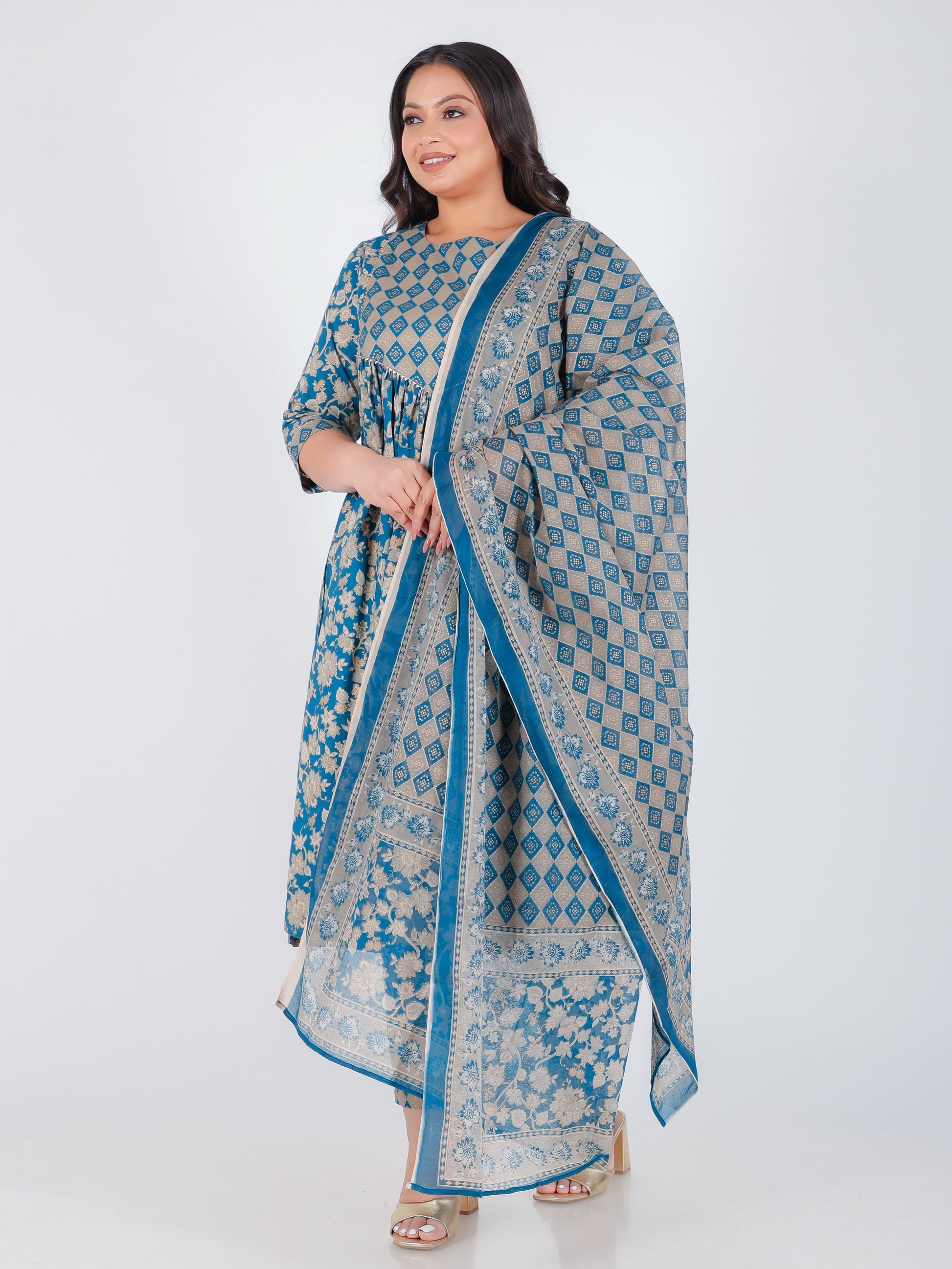 This Blue Soft Cotton kurta with a A-line flare is designed for comfort and style. Featuring a Round neckline, 3/4 Sleeve sleeves, and a graceful Calf Length hemline, it’s perfect for festive wear or semi-formal gatherings. The Gold foil highlights add depth and texture, making it a standout piece. Accessorise with a contrasting dupatta and keep it pristine by following proper care instructions.