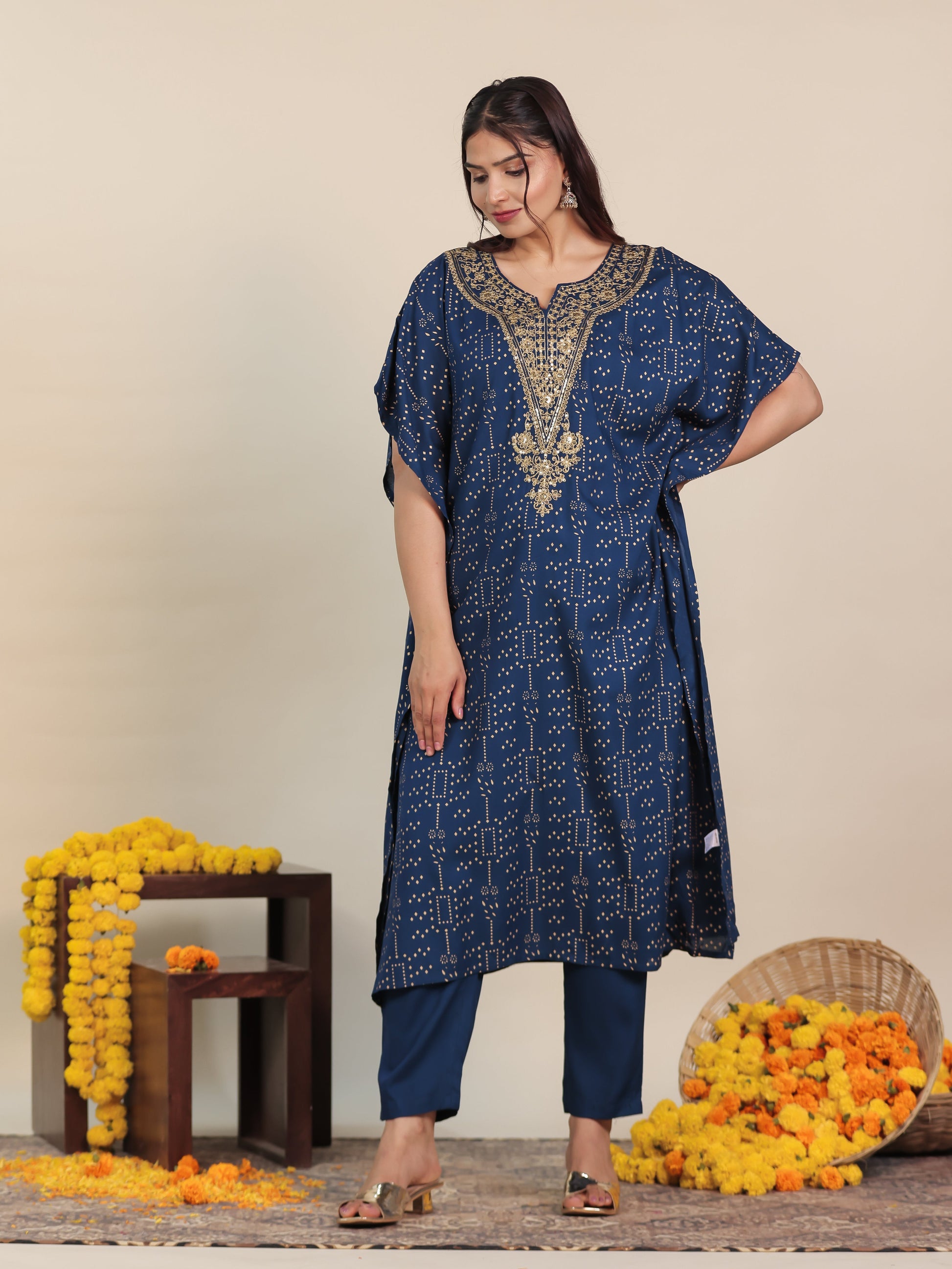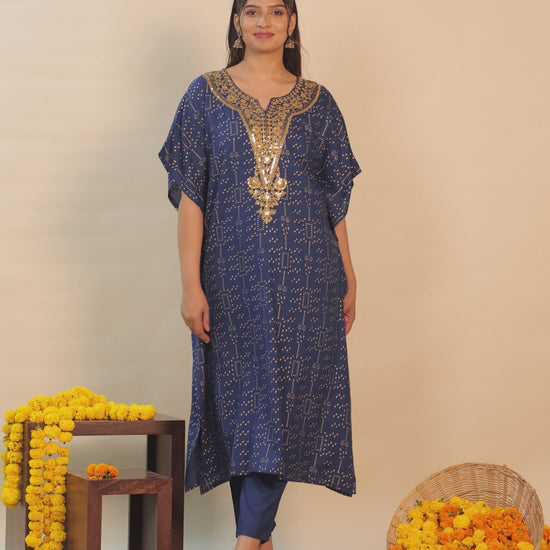 Embroidered Viscose Gold foil Kaftan Blue Kurta