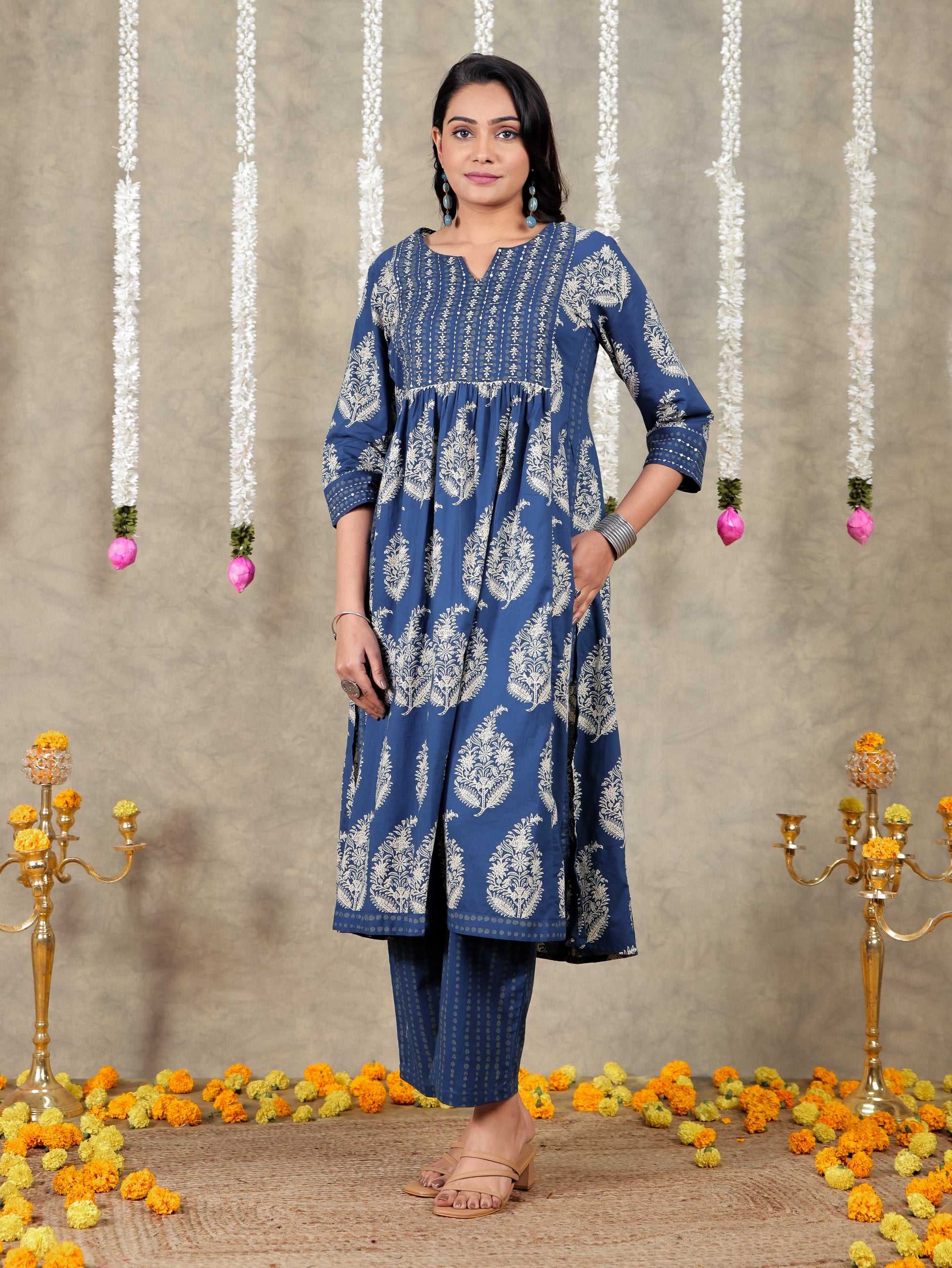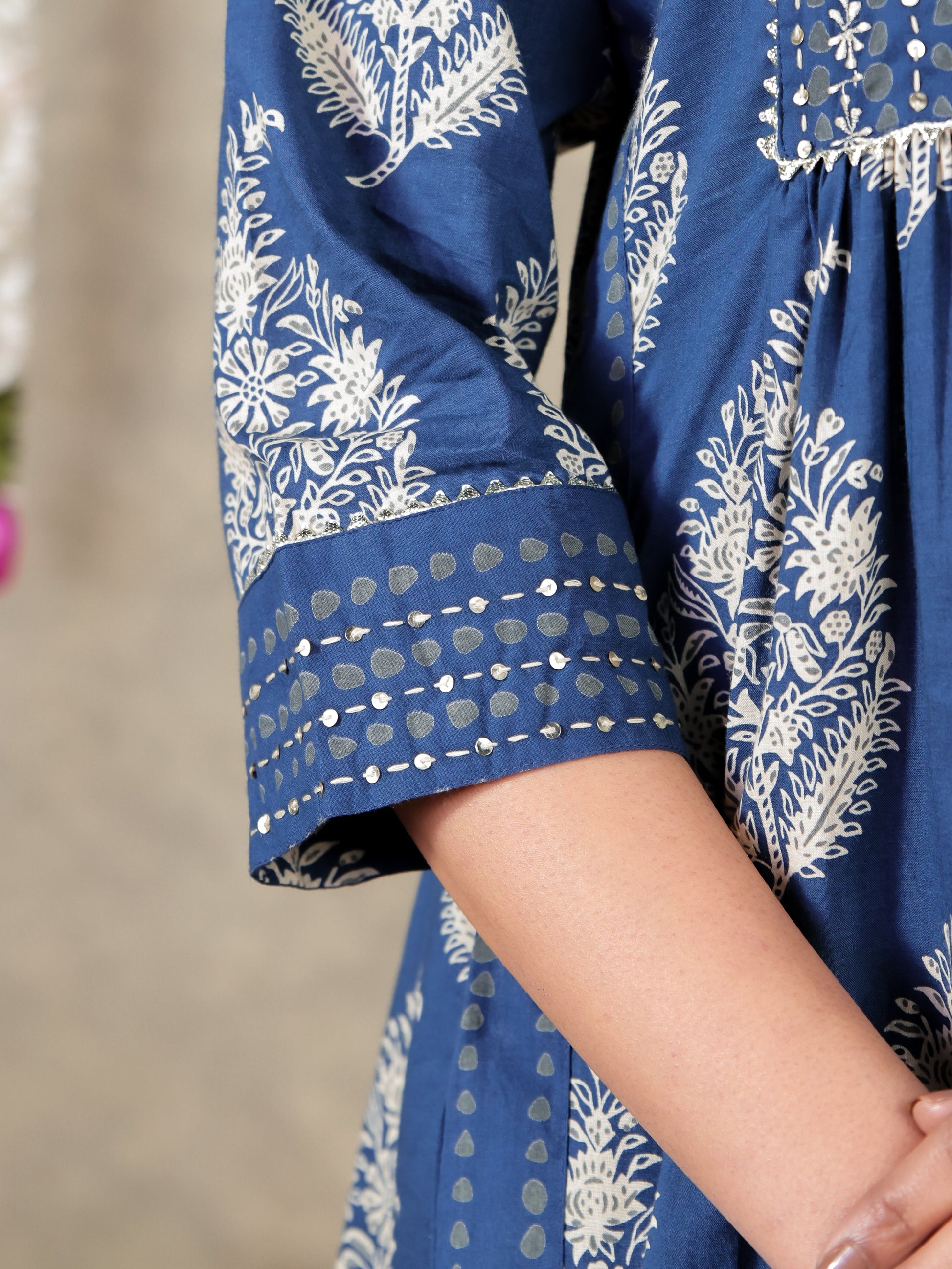 Embroidered Soft Cotton Block Print A-line Blue Kurta
