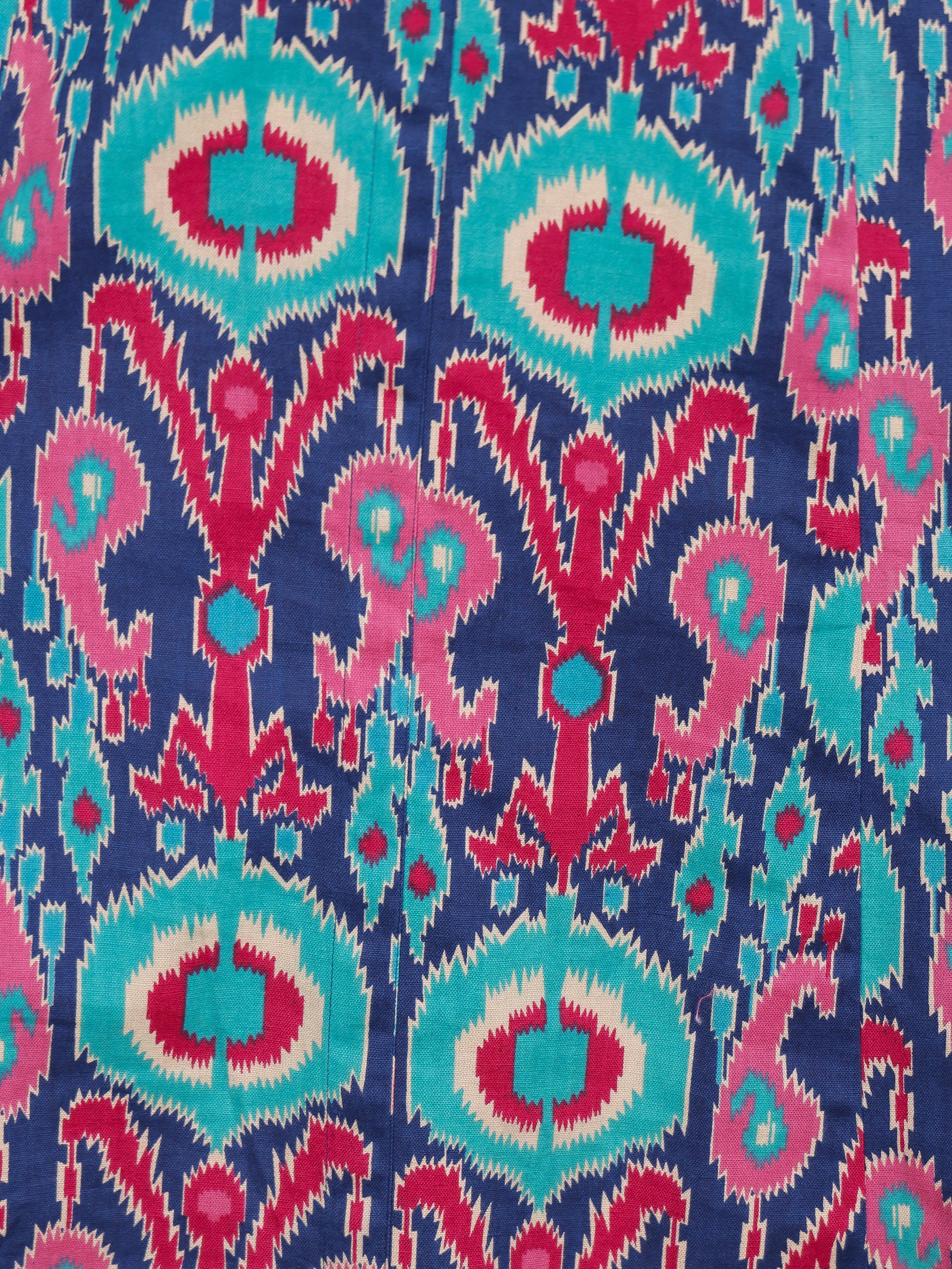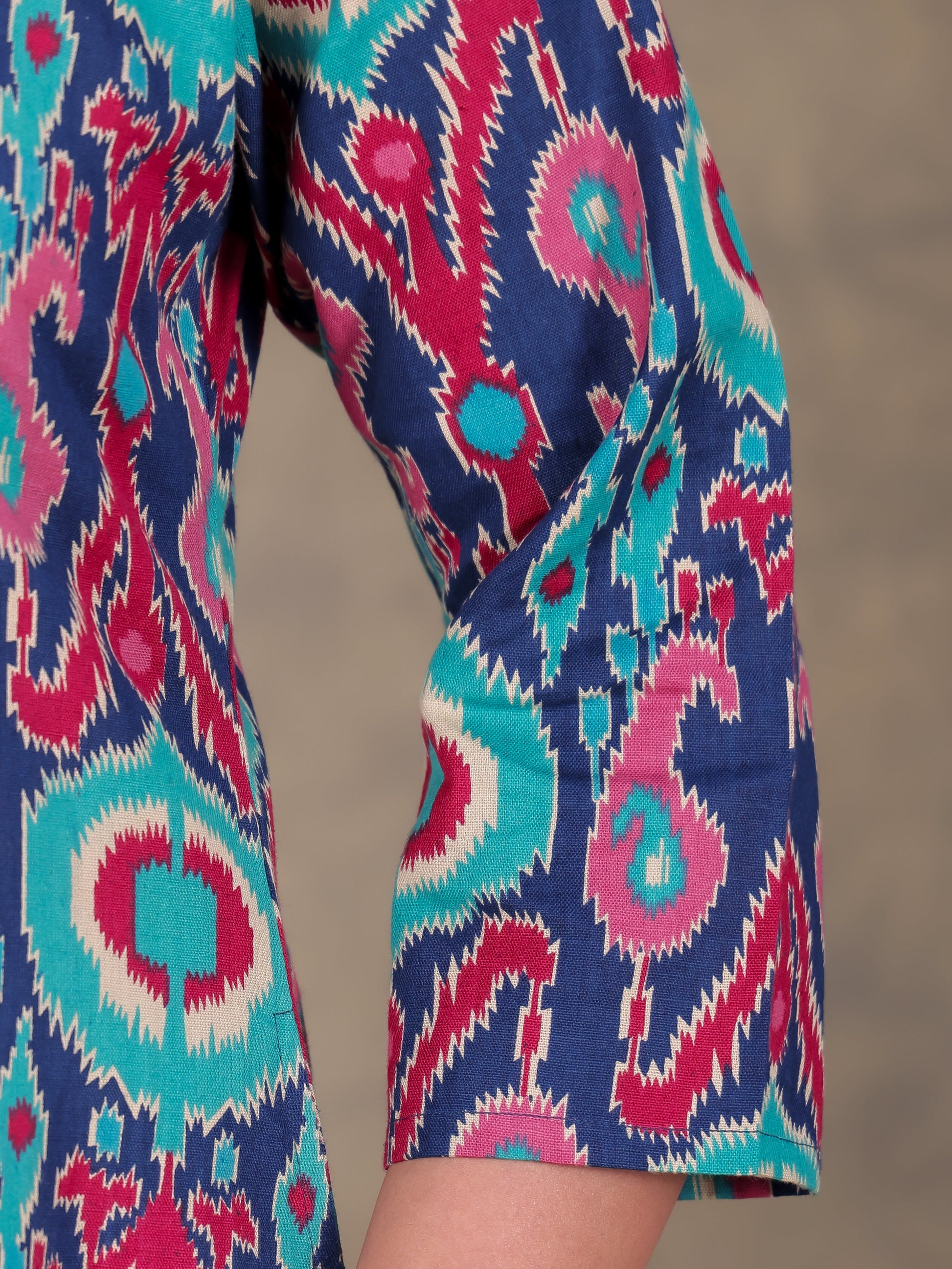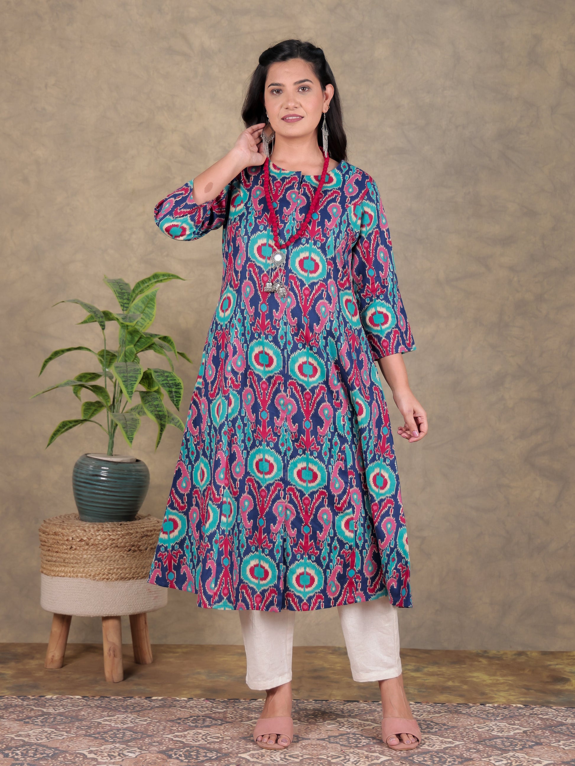 Linen Cotton Ikat A-line Blue Kurta with Necklace
