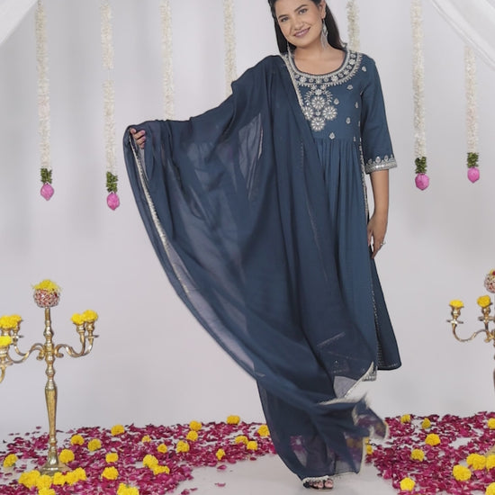 Embroidered Cotton Dobby Solid A-line Blue Kurta