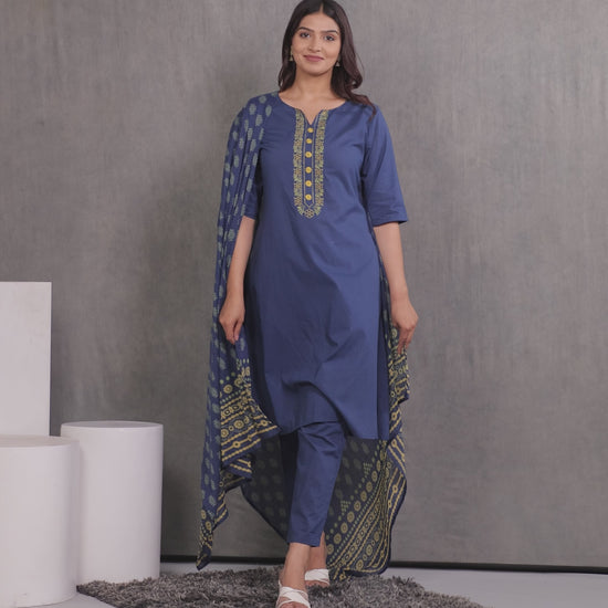 Embroidered Soft Cotton Solid A-line Blue Kurta