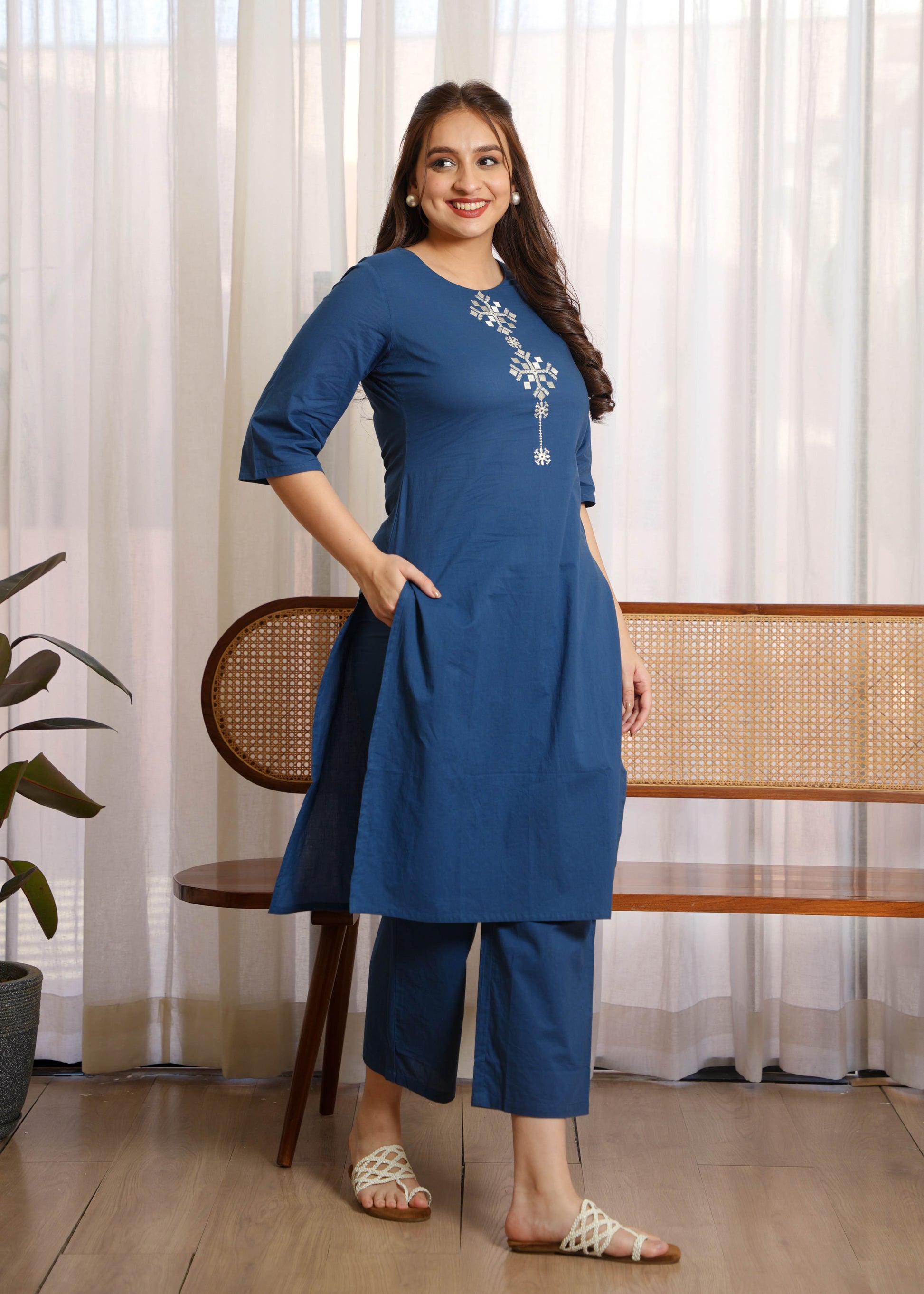This Blue Straight kurta in soft Soft Cotton is a timeless pick for festive and casual wear. Designed with a Round neckline and 3/4 Sleeve sleeves, its graceful Calf Length cut flatters all body types. The delicate Solid detailing adds a touch of sophistication. Pair it with statement earrings and juttis for a polished look. Maintain its pristine look by following proper care instructions.