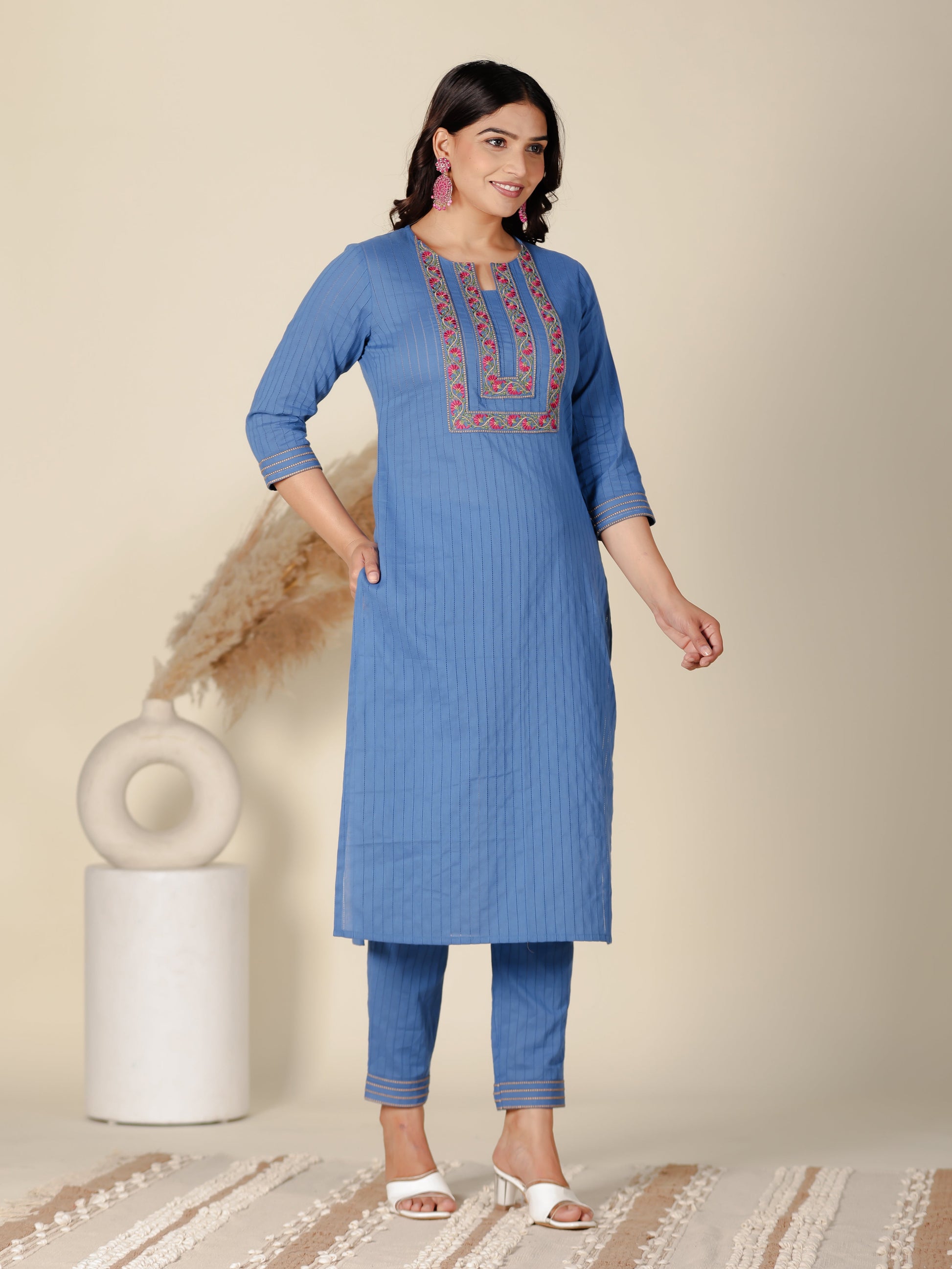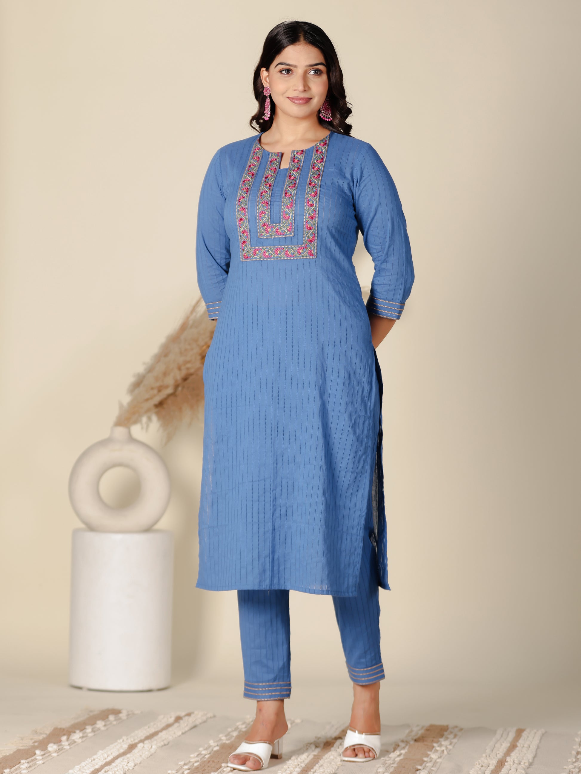 This Blue Straight kurta in soft Textured Cotton is a timeless pick for festive and casual wear. Designed with a Round neckline and 3/4 Sleeve sleeves, its graceful Calf Length cut flatters all body types. The delicate Solid detailing adds a touch of sophistication. Pair it with statement earrings and juttis for a polished look. Maintain its pristine look by following proper care instructions.
