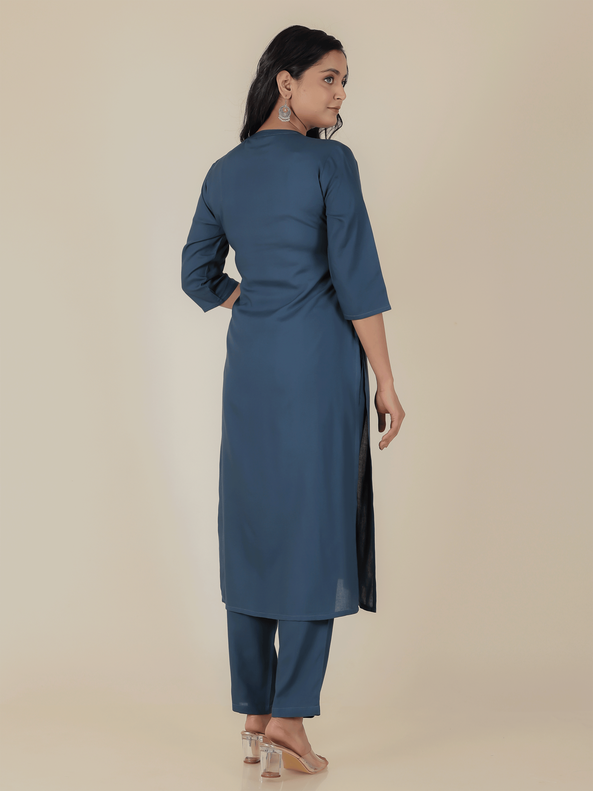 This Blue Viscose kurta with a Straight flare is designed for comfort and style. Featuring a Mandarin/Chinese neckline, 3/4 Sleeve sleeves, and a graceful Calf Length hemline, it’s perfect for festive wear or semi-formal gatherings. The Solid highlights add depth and texture, making it a standout piece. Accessorise with a contrasting dupatta and keep it pristine by following proper care instructions.